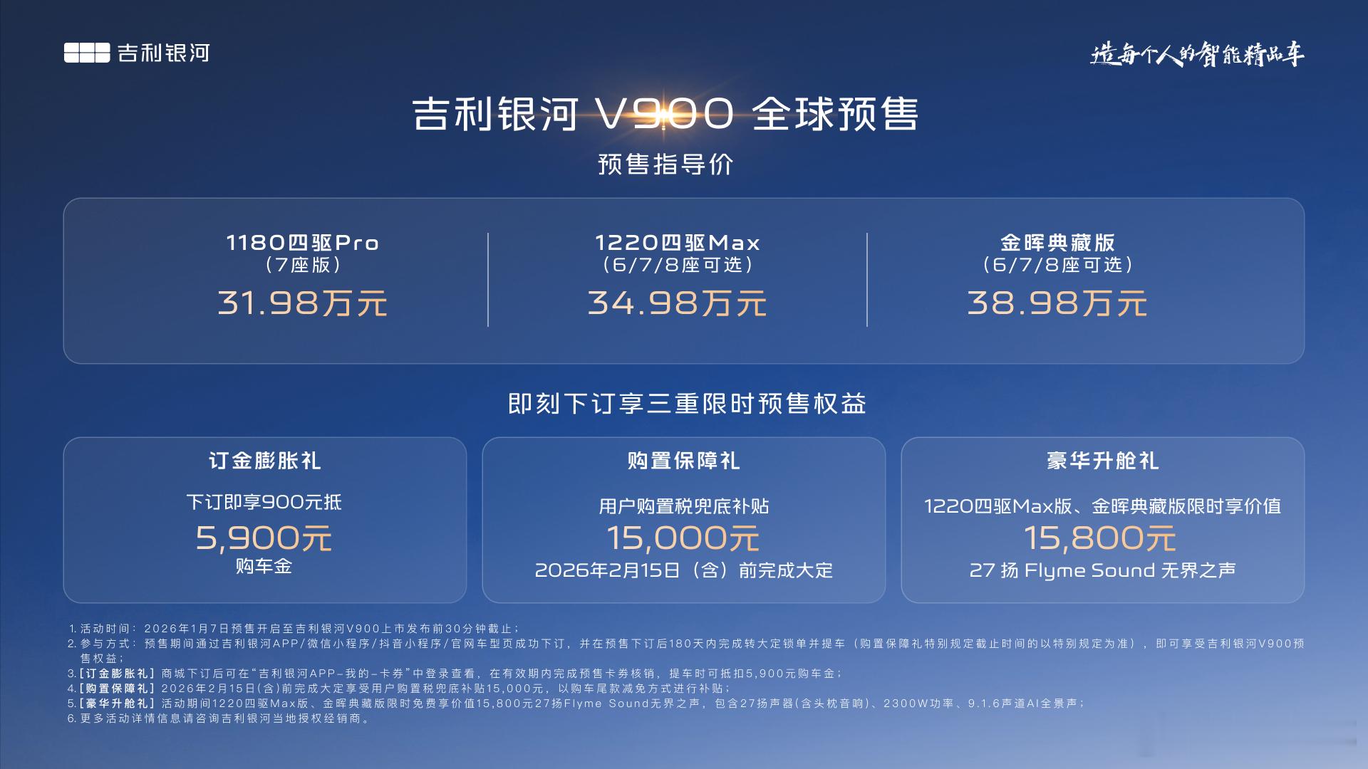 吉利银河V900预售价31.98万元起 若想让家庭出行既舒适又安心,吉利银河V900会是理想之选。它先凭借AI智能带来便捷交互,接着以宽奢空间提升舒适感,最后靠卓越安全性能,全方位守护全家出行。