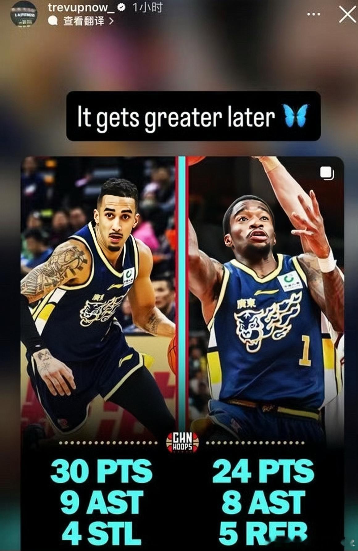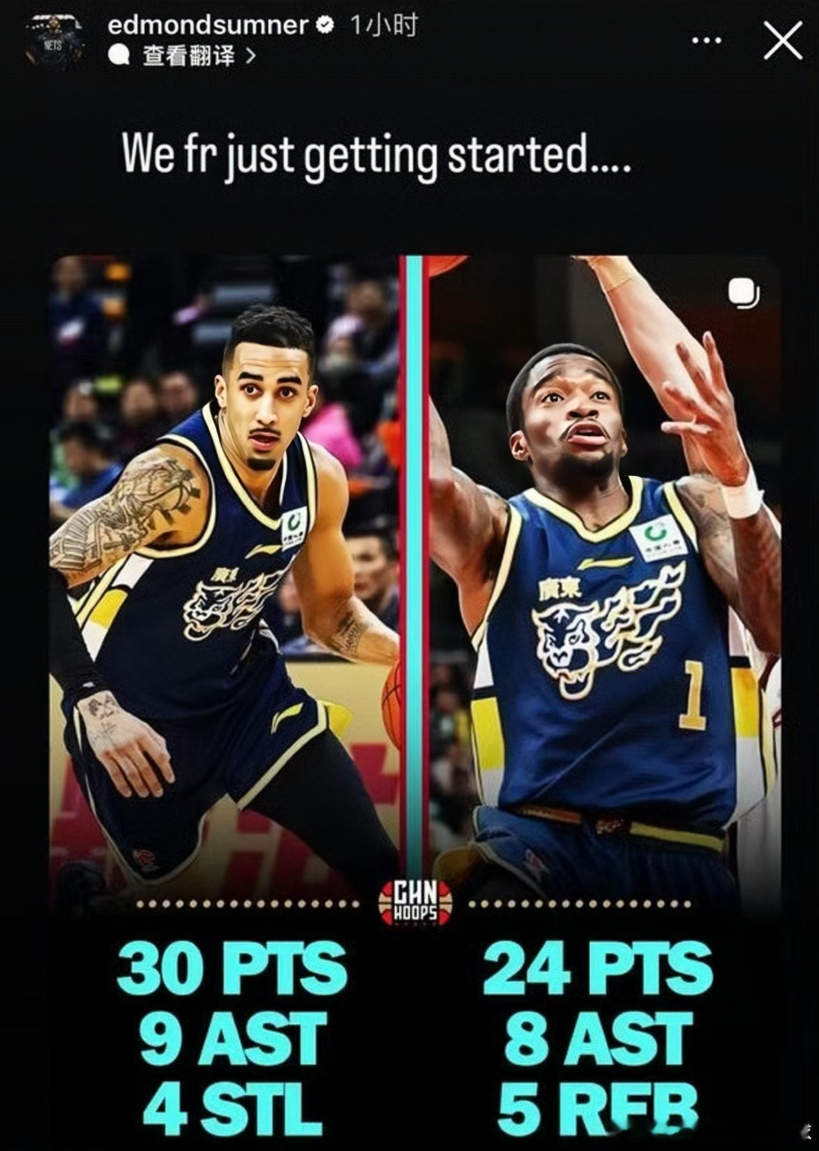广东宏远男篮外援萨姆纳和奎因今晚赛后双双在社媒更新动态,都在鼓励自己!今晚对阵深圳男篮的比赛中,奎因只打了前面三节的比赛,爆砍30分6板9助攻4抢断;萨姆纳出战26分13秒,贡献24分5板8助攻!可以说,这俩外援的比赛态度没得说,是近几个赛季朱总找来的外援当中属于相当靠谱的啦!这两位在第三节在进攻端几乎无所不能,空中接力、快攻、突破、三分、助攻、抢断样样齐全,可谓是观赏性十足。尤其是奎因,今晚给他一个MVP绝对没有问题!