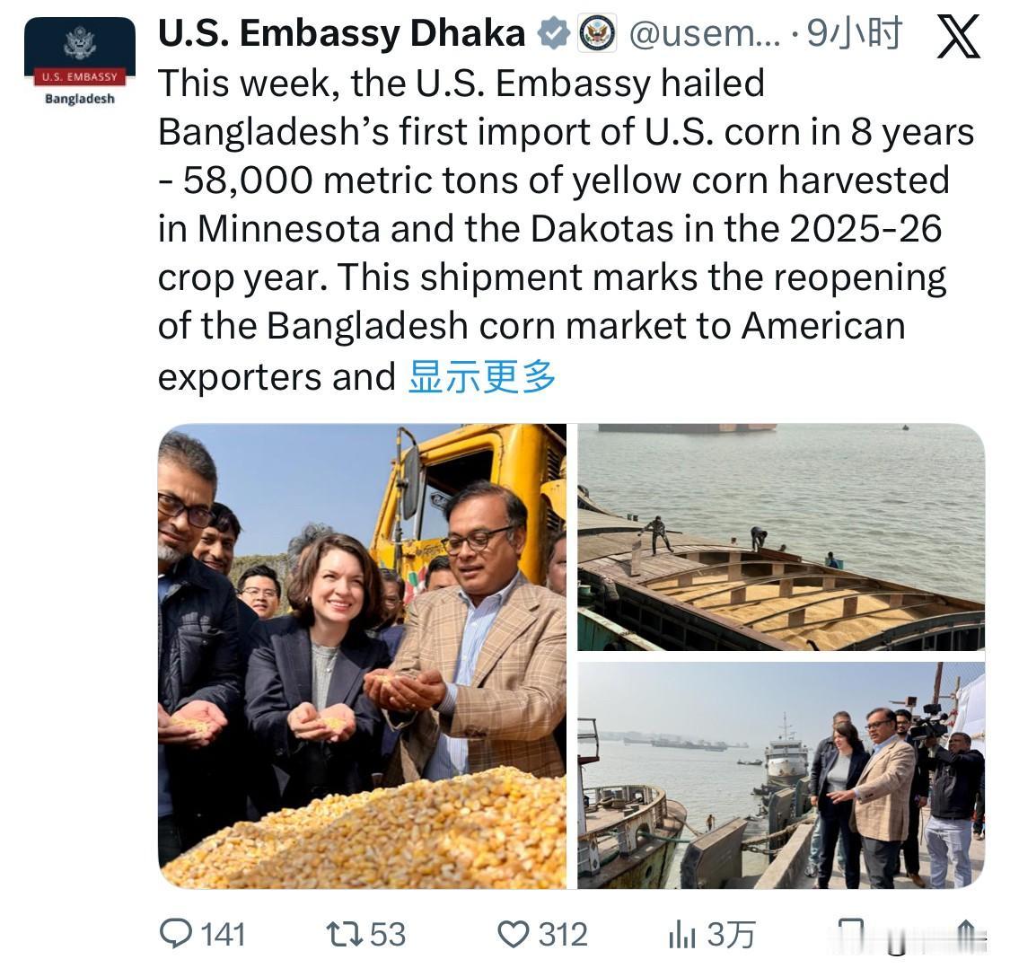 本周,孟加拉国八年来首次进口美国玉米到港,这批5.8万吨黄玉米产自明尼苏达州和达科他州,属于2025-2026作物年度。此次进口标志着孟加拉国玉米市场重新向美国出口商开放,并为孟加拉国饲料和畜牧生产商提供了来自美国的安全可靠的高品质动物营养来源。