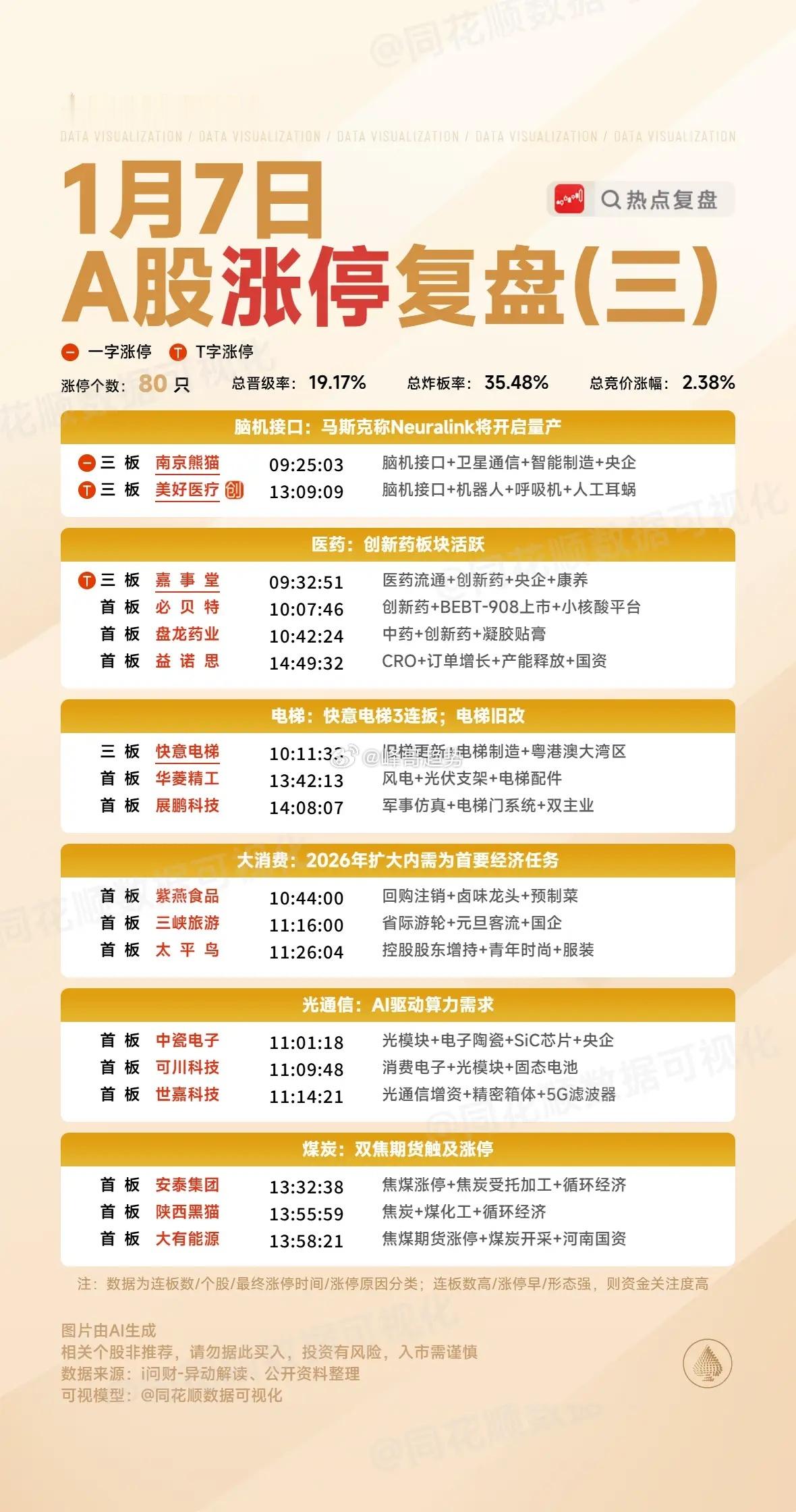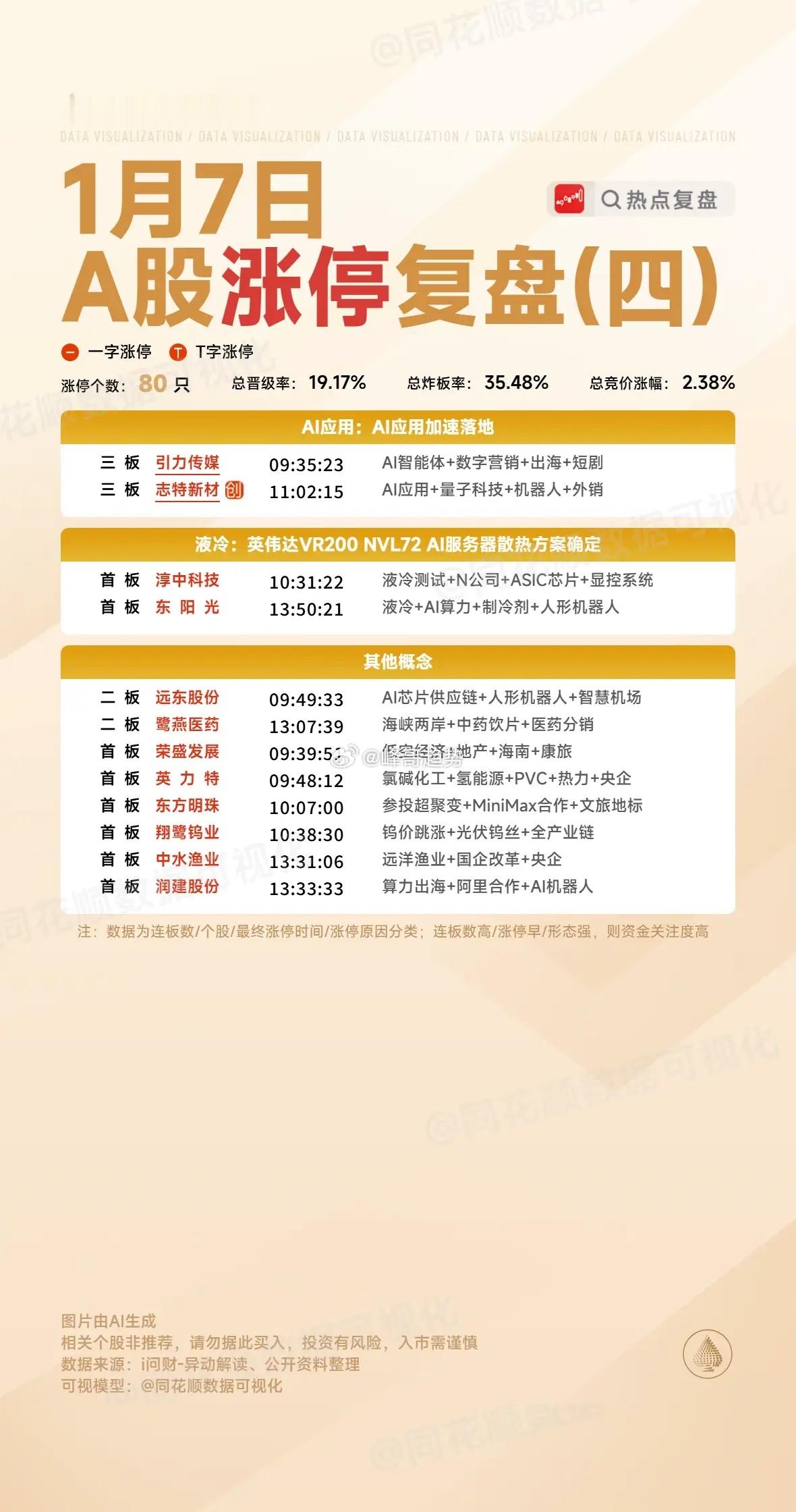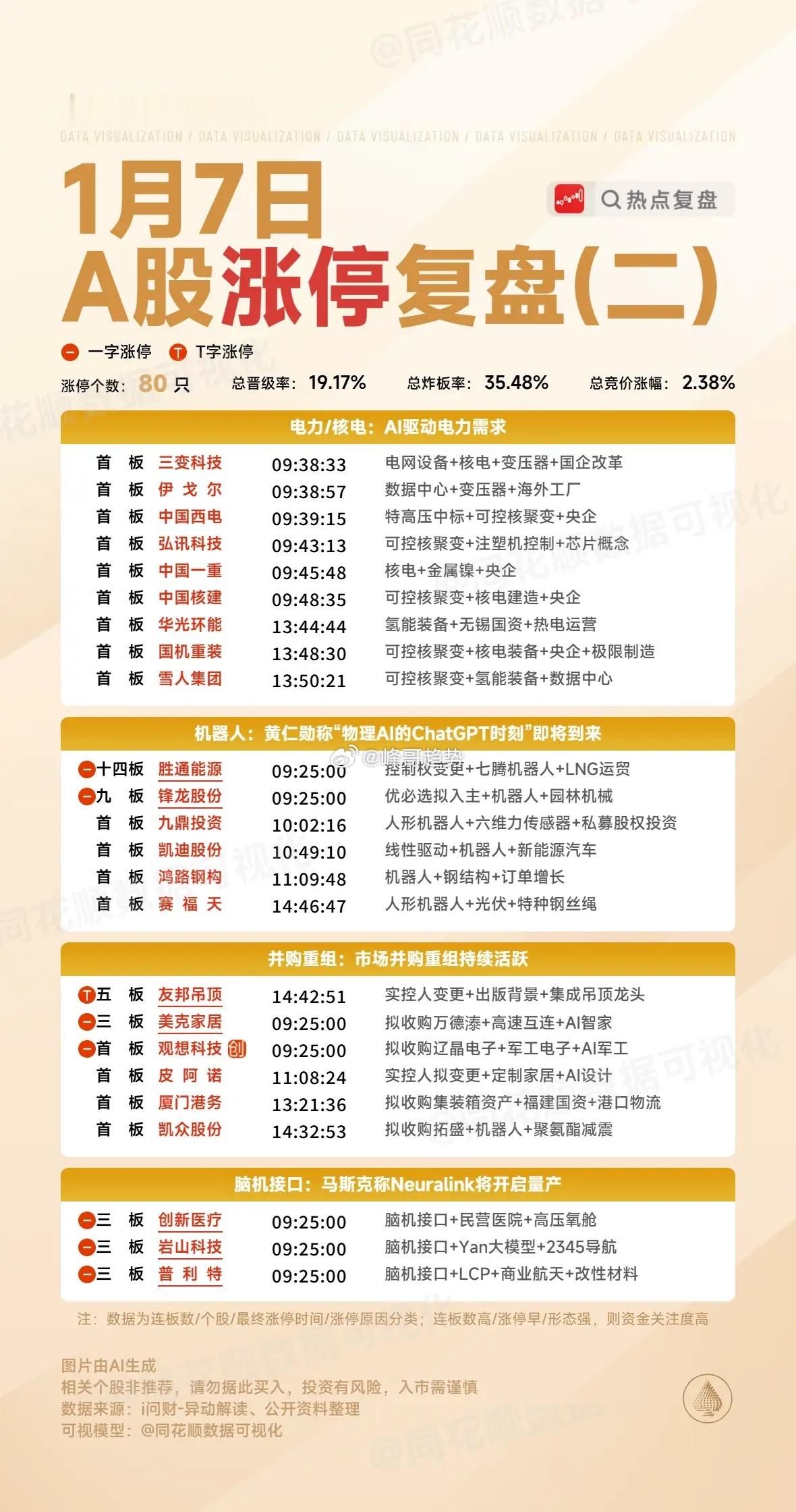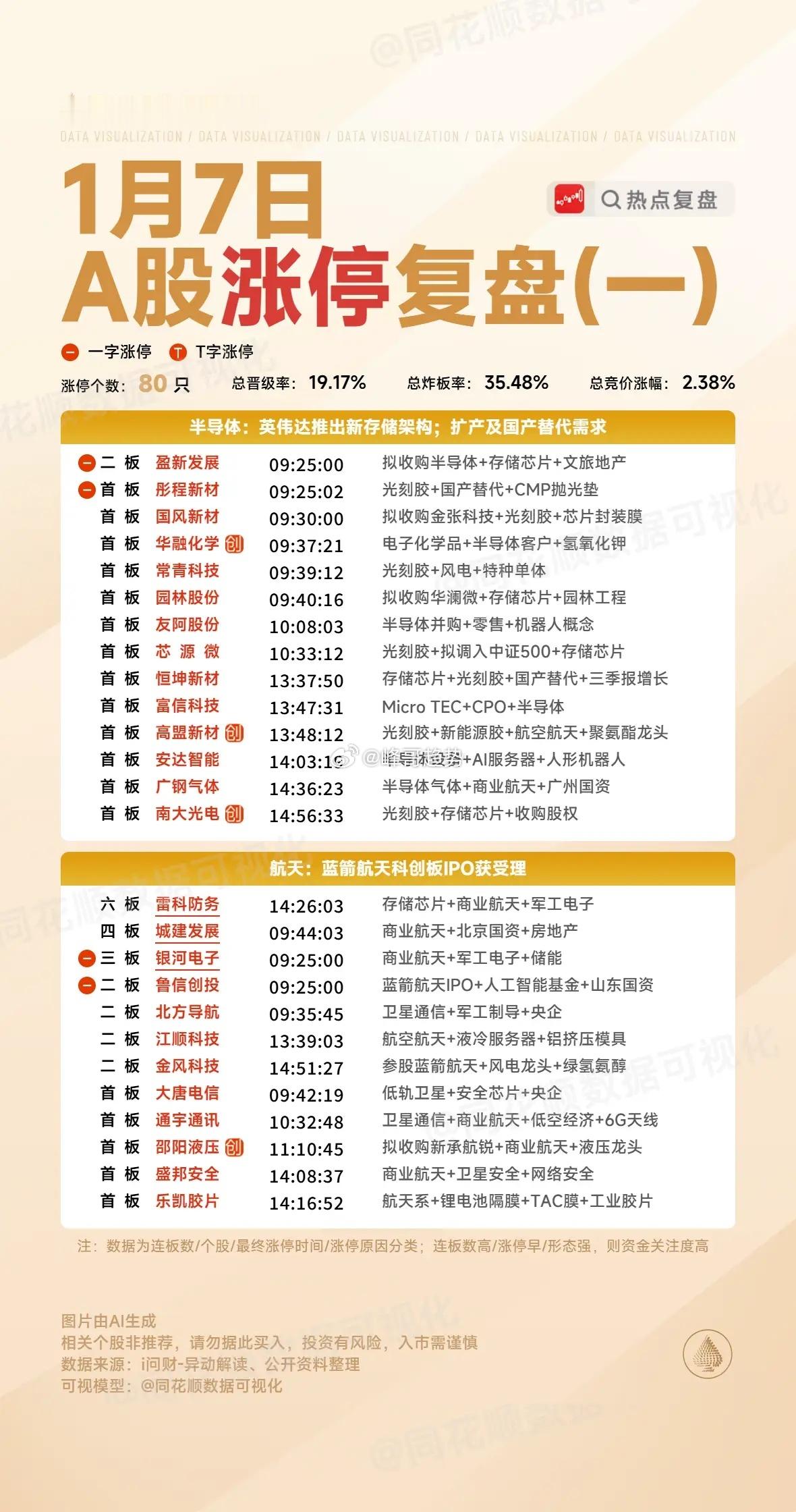 1月7日复盘:雷科防务、金风科技、雪人集团、南大光电隔日走势的一些看法!1、雷科防务(商业航天)早盘商业航天方向分歧明显,雷科竞价4个点的高开并不强,所以它开盘走出了明显的拉升回落,在下杀到0轴位置支撑明显,之后两次尝试拉升过均线都以失败告终,再次下杀时出现了大幅杀跌,好在很快板块出现资金回流拉升到高位开始横盘放量,午后在情绪到位的情况下出现资金承接拉升触板,但是并没有资金强封后出现回落,之后大盘出现跳水,雷科反而有资金强势做多封板,虽然在板上出现了一次分歧,但是最终还是稳稳封死涨停!盘后的龙虎榜消闲派买入2.1亿卖出4.1亿,陈小群买入1.9亿卖出1.1亿,卖盘广发深圳后海4.4亿止盈离场,其余买卖盘多为机构和外资,这样的榜单算是加分项,毕竟今天雷科早盘算是情绪的冰点,午后能够出现资金去封涨停更多的是因为情绪龙头的信仰,而且整个商业航天午后是有一定共振跟随的,雷科这个涨停出来后辨识度更高了,虽然今天实际换手达到了65%,但是确实在水下的时间并不太多,虽然获利盘比较多,但是远远达不到按死跌停还能获利的程度,再加上龙虎榜的正反馈,板块和人气的双重助攻,雷科隔日虽然是大幅低开预期,但是盘中是有概率出现弱转强拉升的,特别是商业航天能够维持强势的情况下,它甚至有弱转强的预期,但是雷科毕竟隔日面临严重异动,想要继续连板还是比较有难度的,所以对于雷科来说,隔日竞价不是特别强的情况下,大概率就是断板预期,如果商业航天足够强,它或许会走出冲高强控异动的表现,总之,雷科毕竟算是这个阶段商业航天明牌的龙头,就算断板,短期内可能依然不会直接结束!2、金风科技(商业航天)同样持股蓝箭航天的鲁信直接大单一字板,那么对于持股比例更高的金风必然有促进,所以金风在高开后早盘整体是在红盘持续横盘的状态,尾盘最后阶段突然出现资金强势拉升去上板,走出了非常强势的连板形态!盘后的龙虎榜消闲派、江苏路、知春路都是做T引导,卖盘重庆解放碑和前滩大道两个游资兑现离场,这是一个非常良性的游资换手榜单,今天商业航天方向卫星系的个股全部没有走出来,金风尾盘的上板有点接力卫通成为商业航天新的趋势中军龙头的意思,毕竟现在市场量能已经足够,金风这样的尾盘上板辨识度就完全出来了,不过金风毕竟有港股,港股的表现肯定会对A股有一定影响,而港股在A股收盘后有明显下杀,隔日金风开盘的预期就比较低了,但是只要商业航天开盘能够继续有板块效应,金风的趋势性还是比较值得期待的,它能不能维持住分时均线的表现会是板块整体的一个风向标!3、雪人集团(核电)全球首台全高温超导托卡马克核聚变实验装置洪荒70取得重要进展,这对于整个可控核聚变方向是有明显刺激的,所以早盘整个核电方向走出了超强表现,雪人也是明显的趋势上行,临近早盘结束时出现资金强势封板,午后随着大盘的跳水出现了两次开板,但是每次都是迅速出现资金承接回封,最终走出了一个突破的首板形态!盘后的龙虎榜消闲派、城管希、知春路三个游资席位持续引导做多封板,卖盘主要抛压来自康定路的3个亿,这是明显的长期潜伏资金,其余卖盘多为机构,这样的榜单整体是非常不错的,雪人虽然是今天核电方向最后涨停的个股,但是它的辨识度是最高的,而且今天的放量形态也非常不错,隔日冲高的溢价是有所保证的,而一旦整个核电方向有持续性,雪人必然会最受资金青睐,那么隔日雪人早盘走出弱转强是大概率的,那么它开盘能不能走出冲板动能是一个比较大的看点!4、南大光电(光刻胶+存储芯片)三星、海力士的存储芯片再次传出涨价60—70%的消息面,这说明整个存储芯片依然是缺货状态,再加上昨晚美股闪迪大涨27%,整个存储芯片明显受益,南大还有收购股权的利好,所以南大在大幅高开后迅速出现资金强势做多,早盘就出现了资金强势封板,但是午后大盘跳水对它有明显影响,多次炸板后最终在尾盘最后阶段才彻底封死涨停,走出了一个比较强势的放量涨停板!盘后的龙虎榜中山东路和3个做T机构构成了做多买盘,卖盘则是温州帮和3个机构席位,这样的榜单算是比较良性的换手,隔日走出冲高问题不大,如果整个存储芯片方向能够持续,南大的趋势表现还是比较值得关注的,毕竟这只个股辨识度是非常高的,隔日或许会有大幅冲高的预期,如果整个存储芯片有持续性,它作为趋势中军或许会走出一定的持续性,毕竟这个放量的涨停突破形态是非常不错的!本文只限于分享和交流,不构成投资建议,股市有风险,投资需谨慎!财经A股股市李在明称访华超出预期