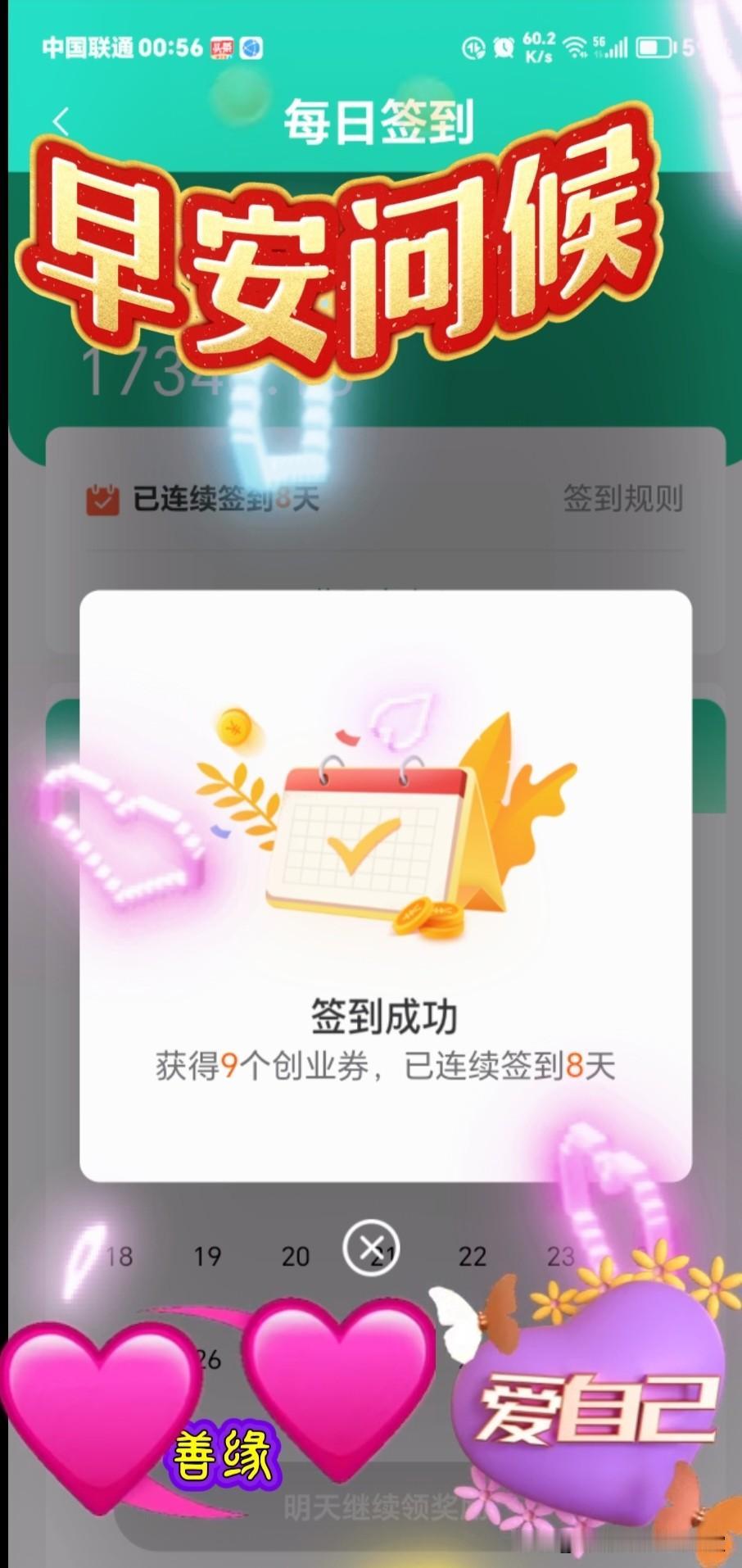今天是2026年1月8日,星期四,签到成功,获得9个创业卷,已连续签到8天! 踏着自己喜欢的节奏,过着自己喜欢的日子,问候自己喜欢的朋友,祝福自己牵掛的人: 心情好,运气好,生活更美好! 早上好!平安吉祥,幸福安康💃🍮🌻