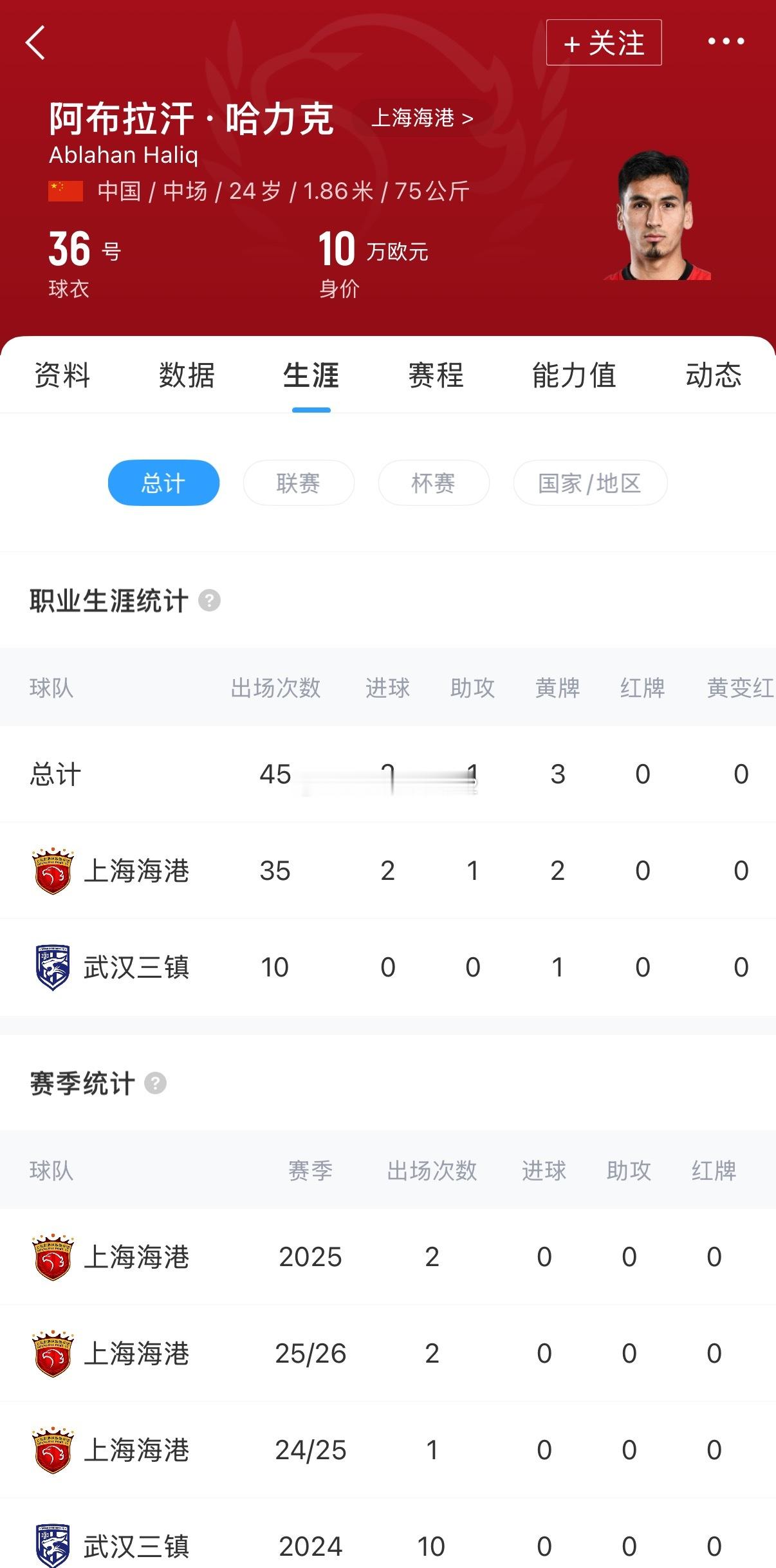 河南队2026冬季转会第一签落地直播吧北京时间1月7日获悉,24岁的上海海港中场阿布拉汗哈力克合同到期离队,将自由身加盟河南队。阿布拉汗现年24岁场上位置曾经司职前锋后改为中场后腰2021年加盟上海海港,期间曾被外租至武汉三镇。2025赛季阿布拉汗代表海港联赛出场2次,出场时间23分钟,值得一提的是阿布,曾经在2020赛季加盟过当时的河南建业队,不过由于种种原因和因素并没有代表河南队一线队出场随后2021年加盟当时的上海上港俱乐部,截止目前共为上海海港俱乐部,累计出场37场,上赛季租借武汉期间出战10场