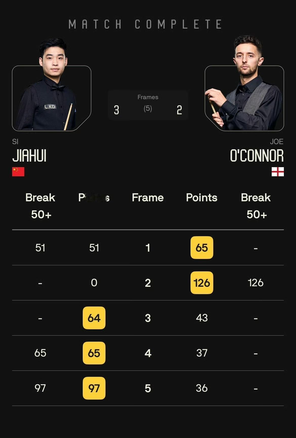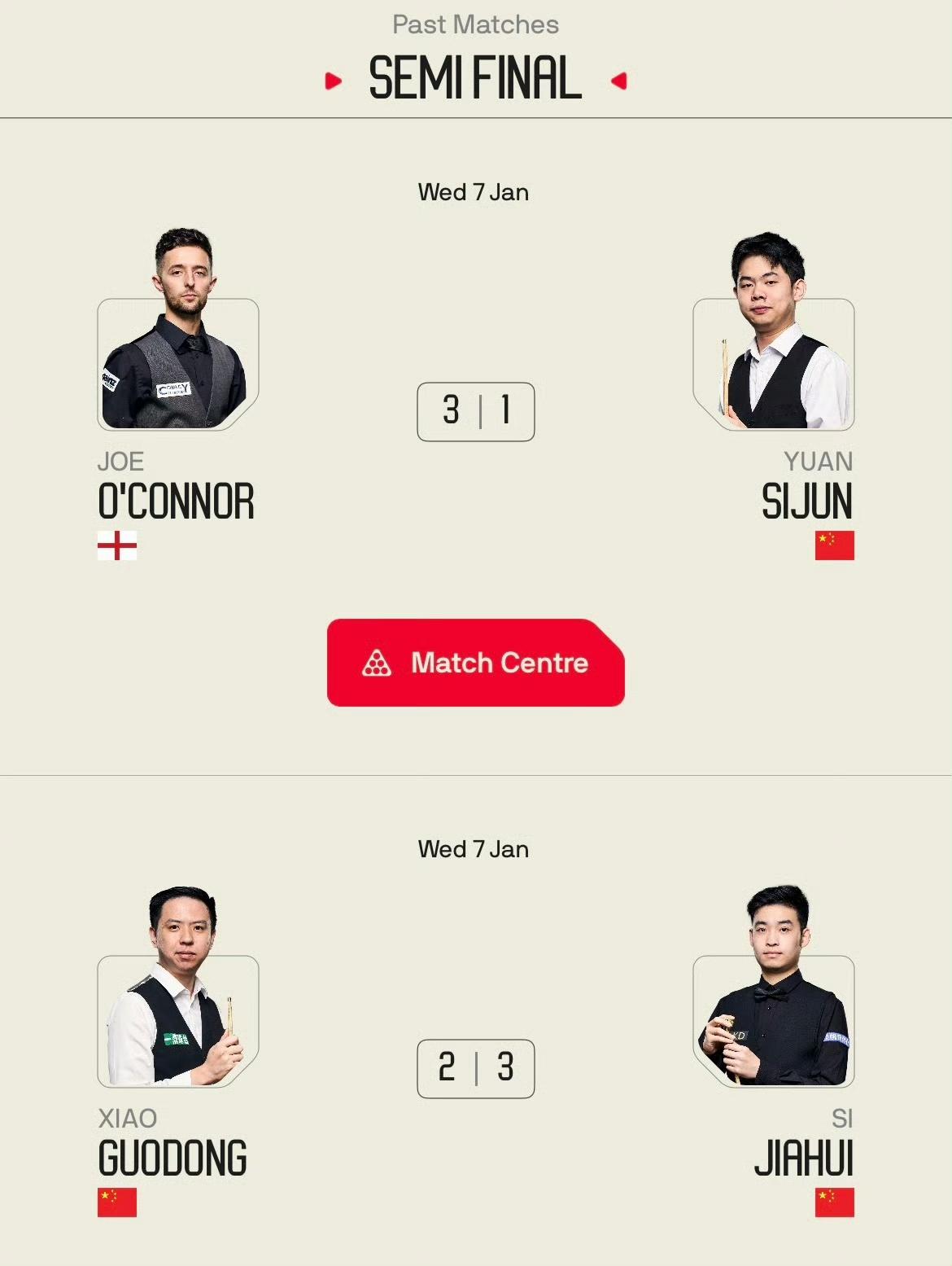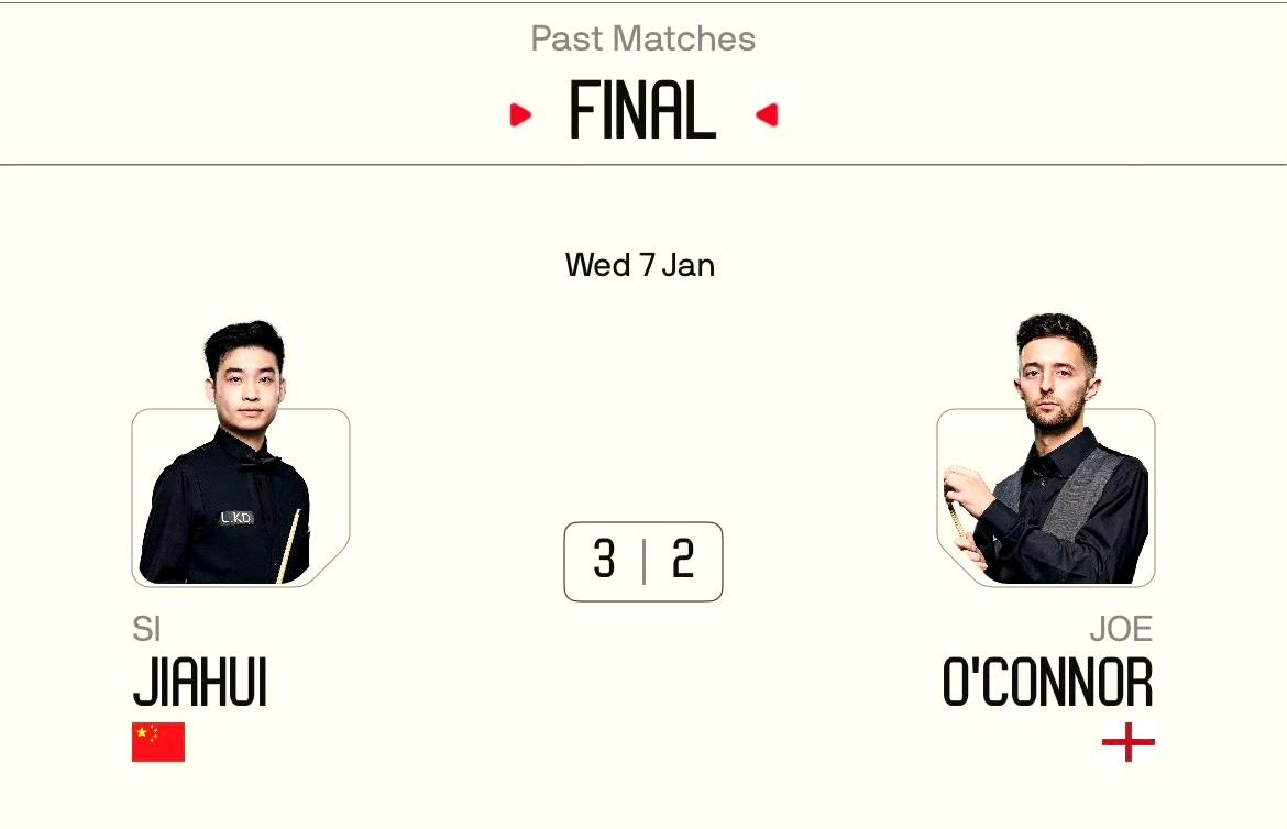 太险了!昨天小组垫底,今天赢了一盘才勉强挤进小组第四!斯佳辉一路逆风翻盘成功夺冠! 决赛在0-2落后奥康纳三个赛点情况下,三连胜以3-2险胜夺冠并晋级冠军组。 半决赛: 奥康纳3-1袁思俊 斯佳辉3-2肖国栋 决赛: 斯佳辉3-2奥康纳