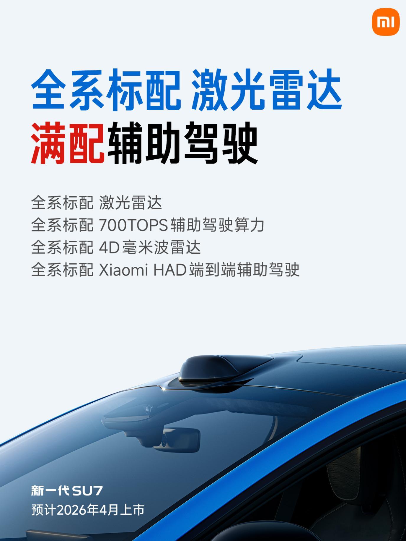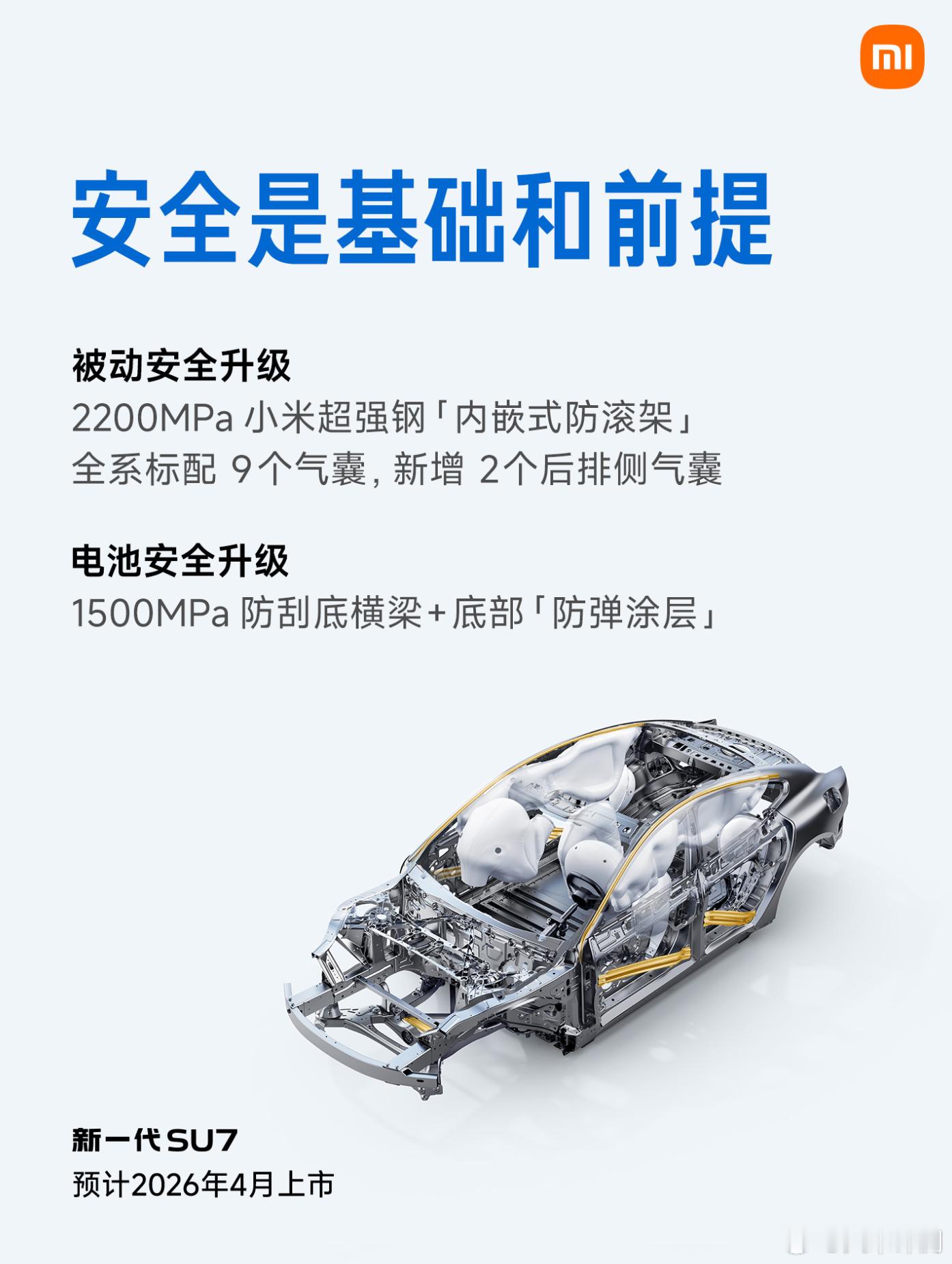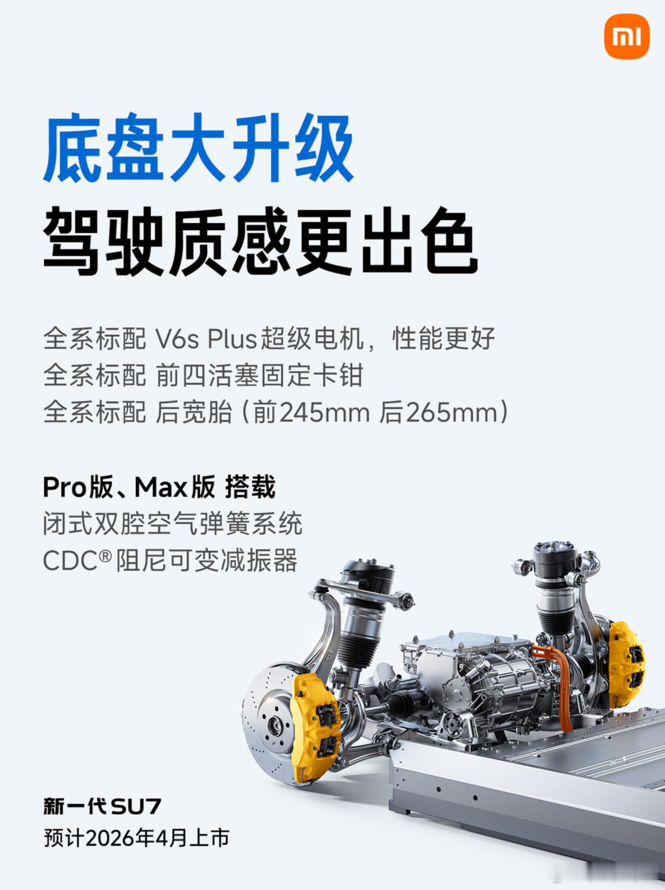 全新SU7三个SKU的配置升级变化:新一代小米SU7亮相SU7Max:续航835km,508kW双电机四驱,897V全域碳化硅高压平台,双腔空簧+CDC减震器,15分钟最快补能670km(CLTC),预售价30.99W起;SU7Pro:续航902km,235kW单电机后驱,752V全域碳化硅高压平台,双腔空簧+CDC减震器,15分钟最快补能490km(CLTC),预售价25.99W起;SU7:续航720km,235kW单电机后驱,752V全域碳化硅高压平台,常规螺旋弹簧,15分钟最快补能450km(CLTC),22.99W起;全系标配激光雷达,700TOPS索尔芯片,4D毫米波雷达,HAD端到端辅助驾驶,四活塞固定卡钳,前245mm后265mm宽后胎,2200MPa小米超强钢,9个气囊,1500MPa防刮底横梁+底部防弹涂层。