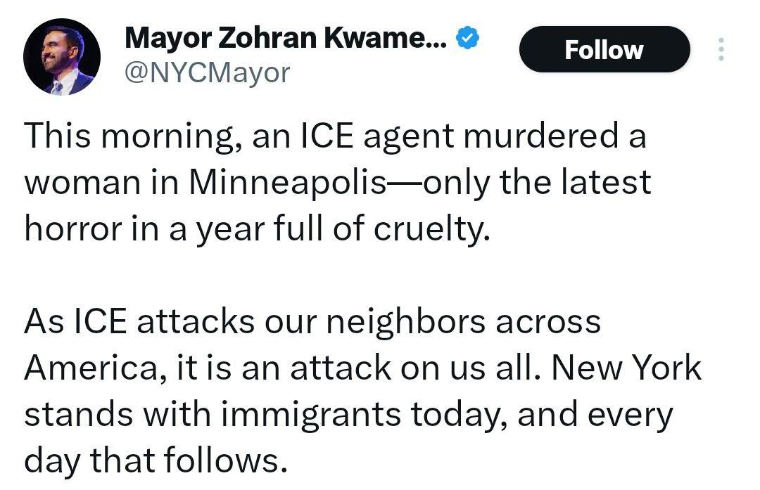 新闻快讯——马姆达尼发声: “今日清晨,一名移民海关执法局警员在明尼阿波利斯杀害了一名女性。” “纽约今日、并将在今后每一天,都与移民群体站在一起。”