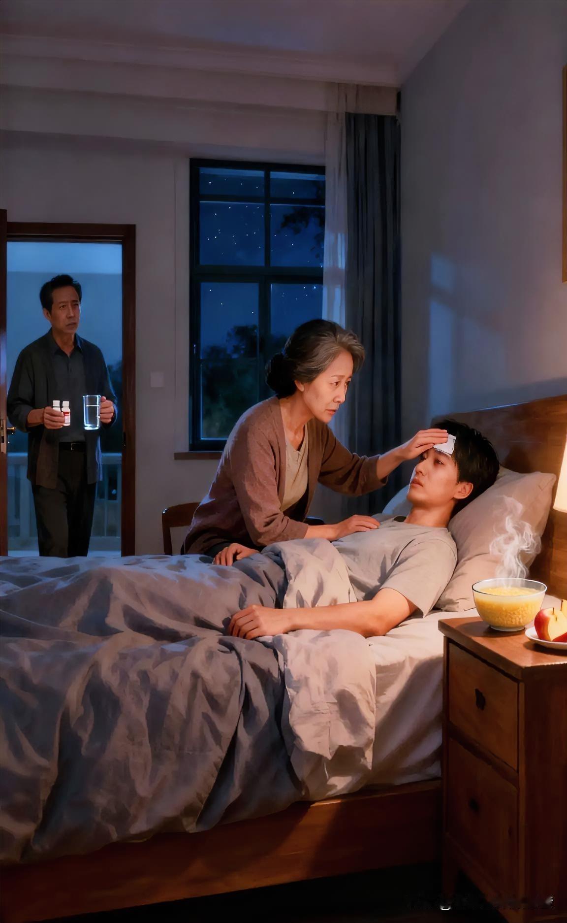 总以为自己长大了能护着爸妈,可前几天发烧卧床,偶尔说了一嘴,他们愣是连夜从老家赶了过来。 推开卧室门的那一刻,我看见老爸手里买的有药,老妈提着一堆吃的,两人的裤脚还沾着路上的露水。 顾不上歇口气,老妈就摸了摸我的额头,皱着眉念叨:“咋烧得这么厉害,自己身体得注意点。” 说着就转身去厨房,把带来的小米粥热了一下,盛了一小碗端给我喝。 老爸则翻出退烧药,仔细看了说明书才递给我,完了怕我嘴里没味,特意削了个苹果放在床头。 那一整晚,他们没怎么合眼,老妈隔一段时间就过来摸我的体温,老爸则守在客厅,生怕我夜里要喝水,不舒服时没人应。 恍惚间,我好像又变回了小时候生病的模样,他们守在床边,眼里满是焦急和心疼,那场景特别熟悉,特别亲切。 原来不管我们长多大,在父母眼里,永远都是那个需要被呵护的小孩。 他们永远是我们坚实的后盾,愿时光走得慢一点,好好善待我们的爸妈。大家说是吧? 配图为豆包生成