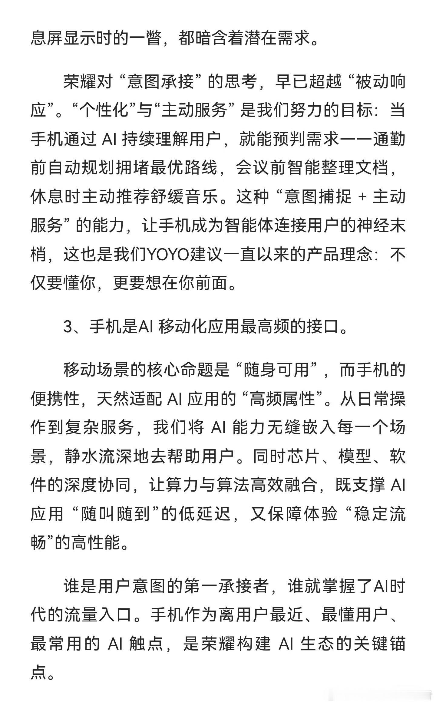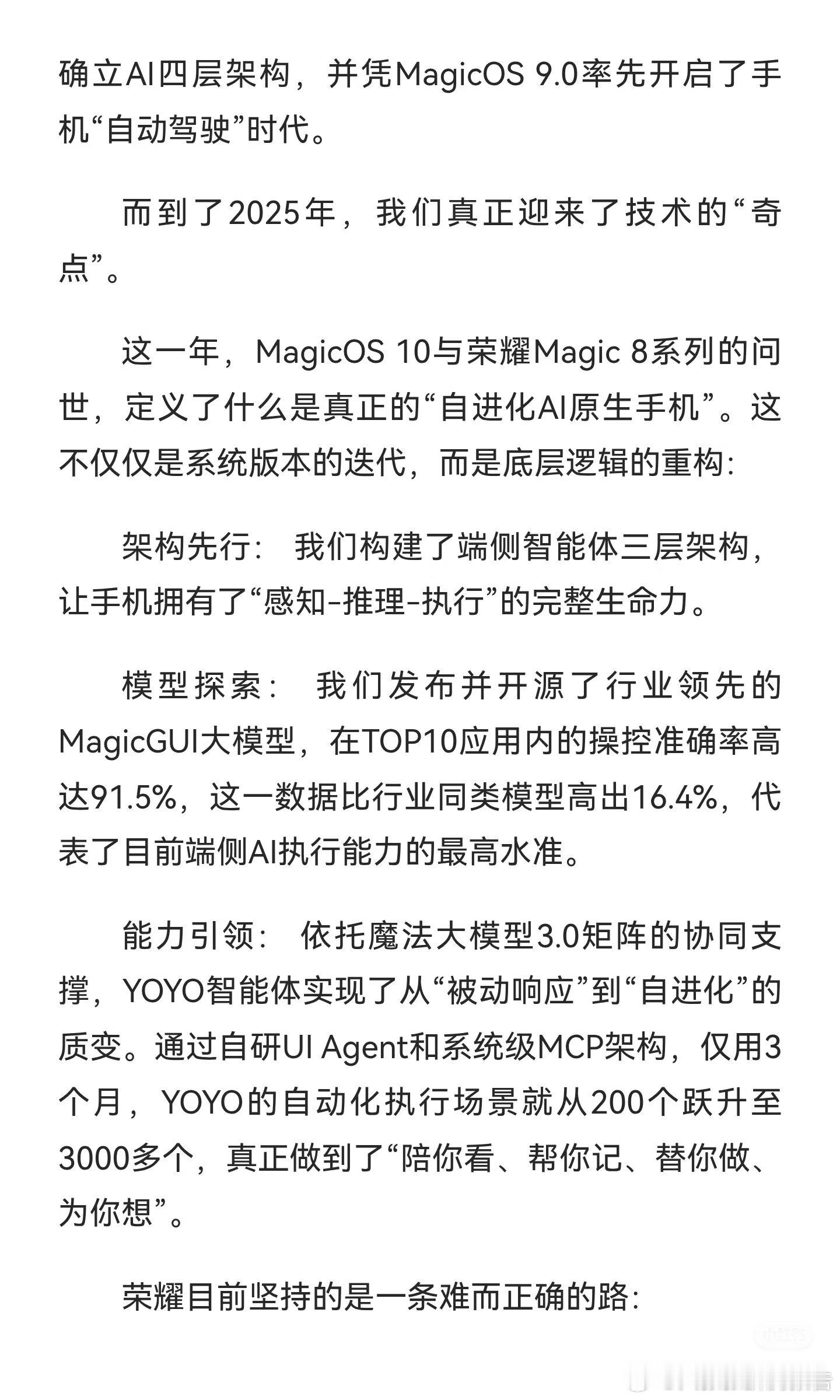 感觉现在荣耀的 YOYO 已经不仅仅是“能聊的助手”,它现在更像是“能做的智能体”,把执行这件事做扎实。让 AI 更好的辅助我们解决一些高频琐事,其中手机作为每天离我们最近的终端设备,肯定是智能体的最佳载体。未来就看谁能将出行、办公等场景闭环做得更稳、更顺手。海涛总的这句“一群人走路把路越走越宽”,更像是对于 AI 技术的细细打磨。而荣耀也确实在坚持一件难而正确的事