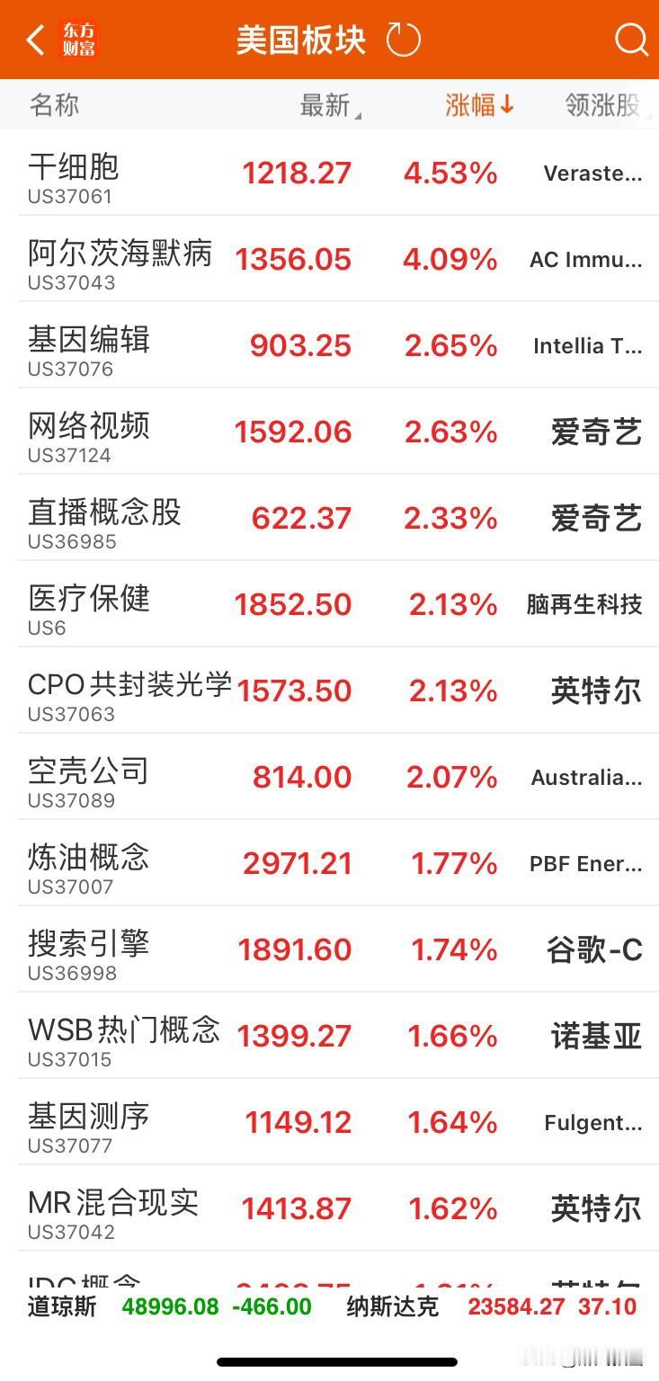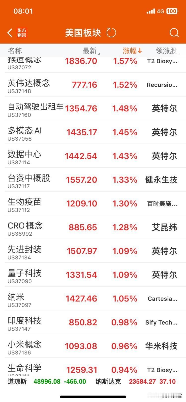 美市涨跌互现,商业航天跌2.72 % 纳指所在科技收小阳,人工智能、芯片、数据跟踪映射! 道琼斯跌0.94%报48996.08点,纳斯达克微涨0.16%,标普500微跌0.34%。干细胞(4.53%)、阿尔茨海默病(4.09%)为涨幅龙头,英特尔领跑科技多板块。商业航天跌2.72%、中概股同步走弱跌1.54%,生物医疗、硬核科技成资金主攻方向。