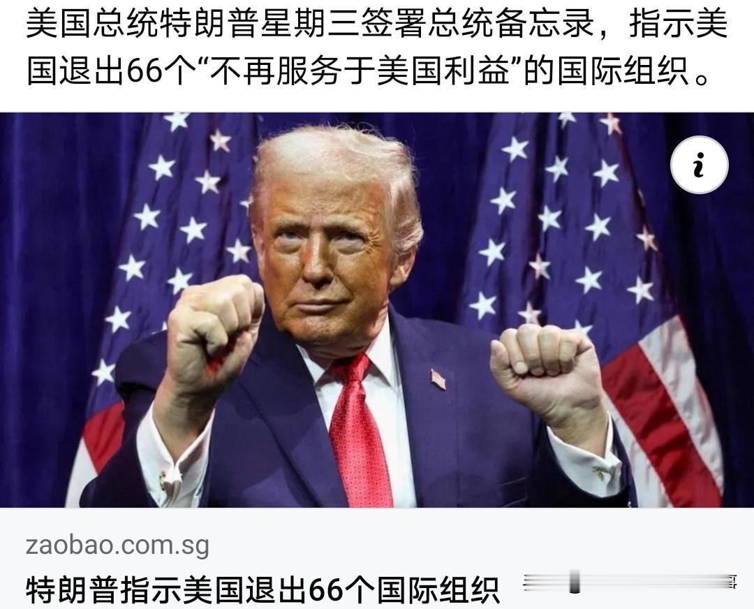 川普大规模退群!一口气退出66个国际组织! 就在昨天晚上,美国总统特朗普签署总统备忘录,一口气退出66个国际组织,声称这些组织“不再服务于美国利益”,他要求美国政府立即着手退出这些组织,看来特朗普打算将“唐罗主义”和“孤立主义”进行到底了。 也可能最近川普没啥政绩,民调低迷,通过抓马杜罗、大规模退群给他的MAGA们一点精神兴奋剂。