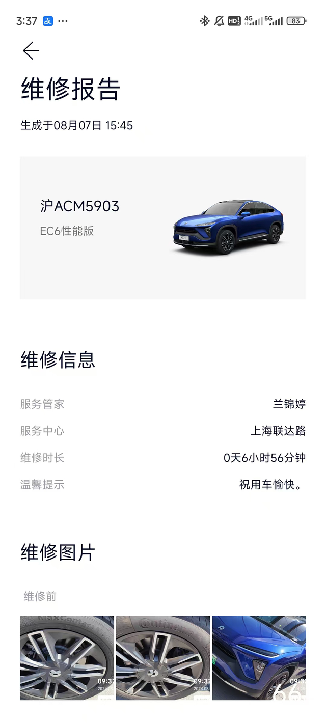现在一键维保怎么如此迅速 上班路上很想打开车窗透会气,结果发现摇不上了…不知道被什么卡住了。吹了半小时冷风到公司,一键维保让小哥来取车。 本来想是不是可以像以前一样代步车找辆别的车开开,结果隔天就修好了… 上次是撞车有磕碰,车侧面修了三天,给我租了三天宝马三系(因为没蔚来代步车了,可以选择同级的车代步,好久没开过油车了,正好试试) 结果完全不给代步车机会,现在修车速度简直神速… 还顺带给我补了个胎(送去才知道又又又扎钉子了) 一分钱没花,电也充满。 爽到又有点遗憾是怎么回事