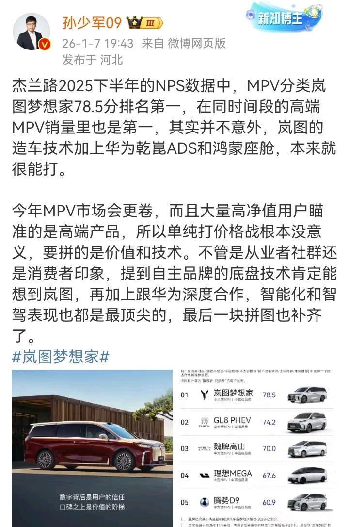 昨晚孙少军发文,“杰兰路2025下半年的NPS数据中,MPV分类岚图梦想家78.5分排名第一,在同时间段的高端MPV销量里也是第一。 其实并不意外,岚图的造车技术加上华为乾崑ADS和鸿蒙座舱,本来就很能打。” 岚图汽车12月销量15954台,2025全年交付150,169辆,同比增长高达87%。 截至2025年底,岚图累计布局专利近5400件,且增速在行业内名列前茅。 并且2026年岚图汽车产品阵容可能将拓展至6-9款车型,实现对更多细分市场的精准覆盖! #晒图笔记大赛#