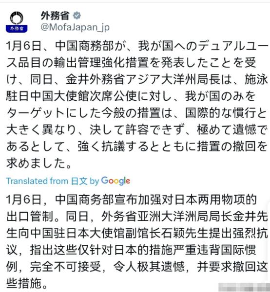 日本出来回应了,态度非常气愤!1月7日,日本外务省声称,1月6日,中国商务部宣布强化对日本两用物品的出口管制措施。同日,日本外务省亚洲大洋洲局局长金井向中国驻日大使馆公使衔参赞提出强烈抗议,称此次专门针对日本的管制措施与国际通行惯例严重不符,完全不可接受,对此深表遗憾,并要求中方撤回该措施。 很显然,从日本的回应来看,日本的反应情绪还是很大的。不过,日本方面称针对日本的管制措施与国际通行惯例严重不符,这完全是错误的。中国的做法做法完全是合情合理。 所谓两用物项,就是那种既能民用又能军用,甚至能帮着提升军事潜力的东西,小到关键零部件,大到稀土这种核心材料都算在内。对这种物品搞出口管制,全世界主流国家都在这么做,根本不是中国独创的规矩。美国有《出口管制改革法》,欧盟也有专门的两用物项管制条例,日本自己跟着美国对其他国家搞管制的时候,怎么从没说过违背国际惯例? 中国这次出手完全是有法可依的,依据就是《中华人民共和国出口管制法》和新修订的两用物项出口管制条例,这些法规早就公之于众,每一条都经得起推敲。而且管制的范围也说得明明白白,就是禁止这类物品流向日本的军事用户、用于军事用途,以及任何能提升日本军事实力的地方,没搞任何模糊地带的小动作。 为啥偏偏针对日本?答案就藏在日本首相高市早苗的言论里。她之前公然发表涉台错误言论,甚至暗示可能武力介入台海,这已经不是简单的口无遮拦,而是赤裸裸干涉中国内政,严重触碰一个中国原则的红线。 台湾问题是中国的核心利益,谁碰谁就得付出代价,这一点中国早就反复强调过。日本一边在这种原则问题上挑衅,一边还想安安稳稳从中国进口可能用于军事领域的物资,天下哪有这么好的事? 更讽刺的是日本这些年一直在扩军备战的路上越走越远,2026财年的防卫预算又创了历史新高,还忙着放宽杀伤性武器的出口限制,甚至有右翼势力公然叫嚣搞核武装。 这种情况下,中国要是还无动于衷,放任关键物资流入日本军事体系,才是真的不负责任。咱们这波操作,既是维护自身国家安全,也是在履行防扩散的国际义务,说到底是在给地区和平踩刹车。 日本现在跳得这么高,说白了就是担心自己的产业受影响。有数据显示,日本大概七成的稀土进口都来自中国,而稀土这种东西,不管是造电动汽车还是先进武器都离不开,中国在全球稀土磁铁产量里占比更是超过八成。中国一强化管制,日本的半导体、汽车这些支柱产业就慌了神,日经指数在消息出来后一度跌了四百多点,矿业股更是领跌。 毕竟2026年才刚开头,日本就陷入这种火烧眉毛的危机里,完全是自找的。中国外交部发言人毛宁也说得很清楚,中方的措施正当合理合法,敦促日方正视问题根源,先撤回那些错误言论。 日本现在忙着抗议,却压根不提自己的问题,反而倒打一耙说中国违规。这种双重标准的嘴脸实在让人看不惯。要是日本真觉得委屈,不如先反思一下自己的所作所为:是不是该停止在台湾问题上玩火?是不是该收敛一下扩军备战的野心?是不是该遵守中日之间的政治文件精神? 说句实在话,中国从来没打算主动破坏中日经贸关系,但前提是日本得守规矩。这次的管制措施,更像是一个明确的警告。要是日本继续执迷不悟,接下来可能还会有更多“不可接受”的后果。到时候别说抗议,就算后悔都来不及,毕竟路是自己选的,哭着也得走完。 而且国际社会也看得很清楚,中国不是在搞贸易霸凌,而是在维护自身正当权益。那些说中国违背惯例的声音,要么是没搞懂国际规则,要么就是跟着日本一起装糊涂。毕竟真讲惯例的话,先挑衅的是日本,先破坏平衡的也是日本,中国只是做出了合理反击而已。