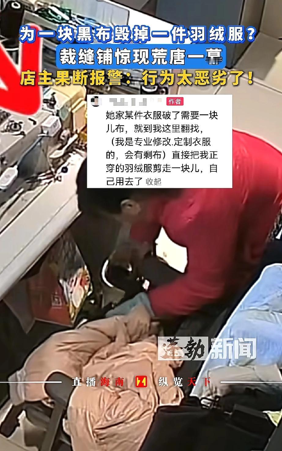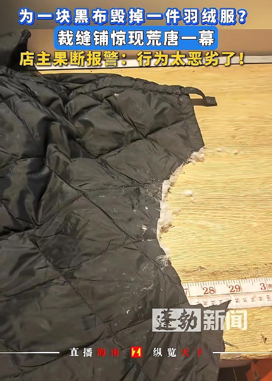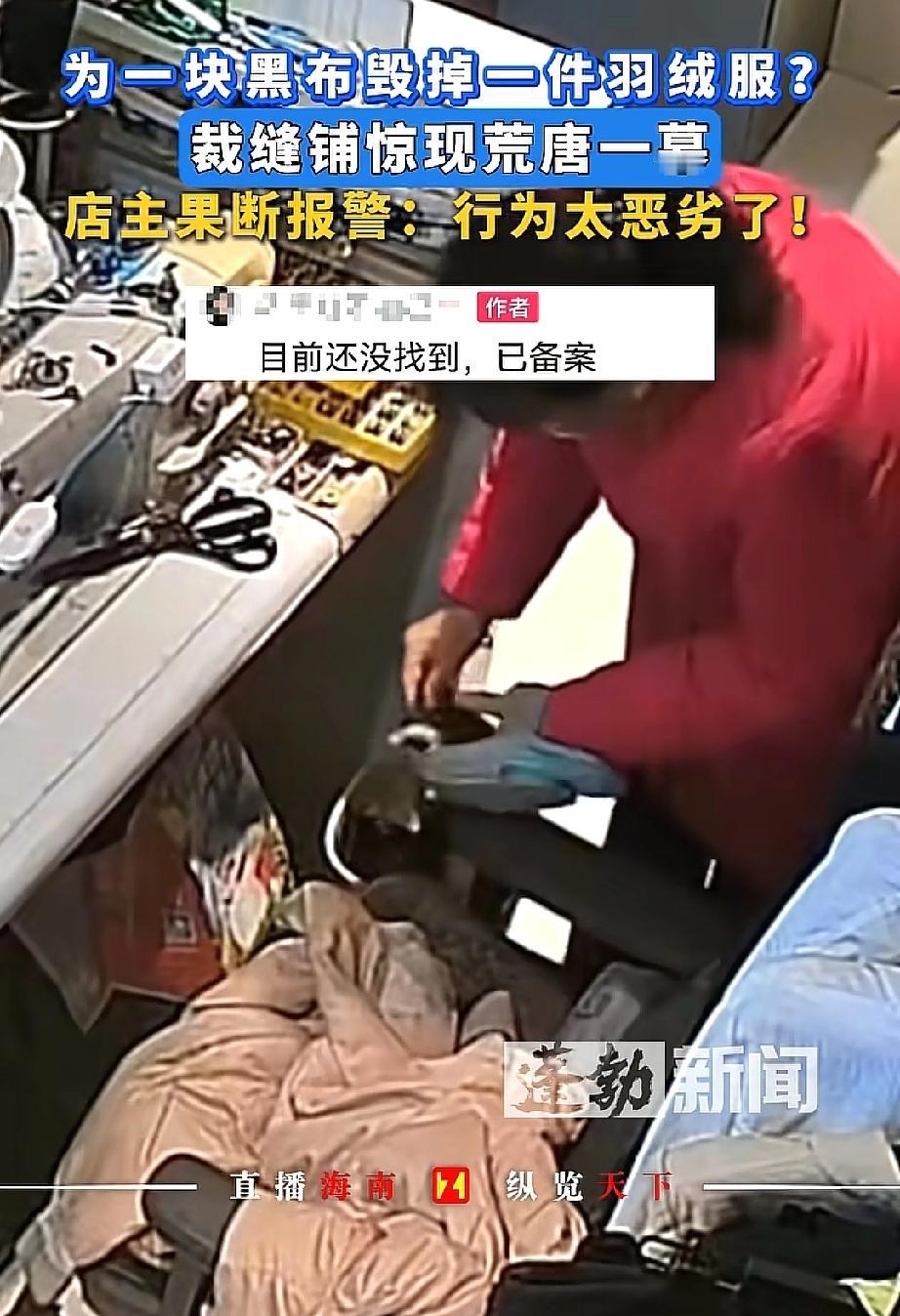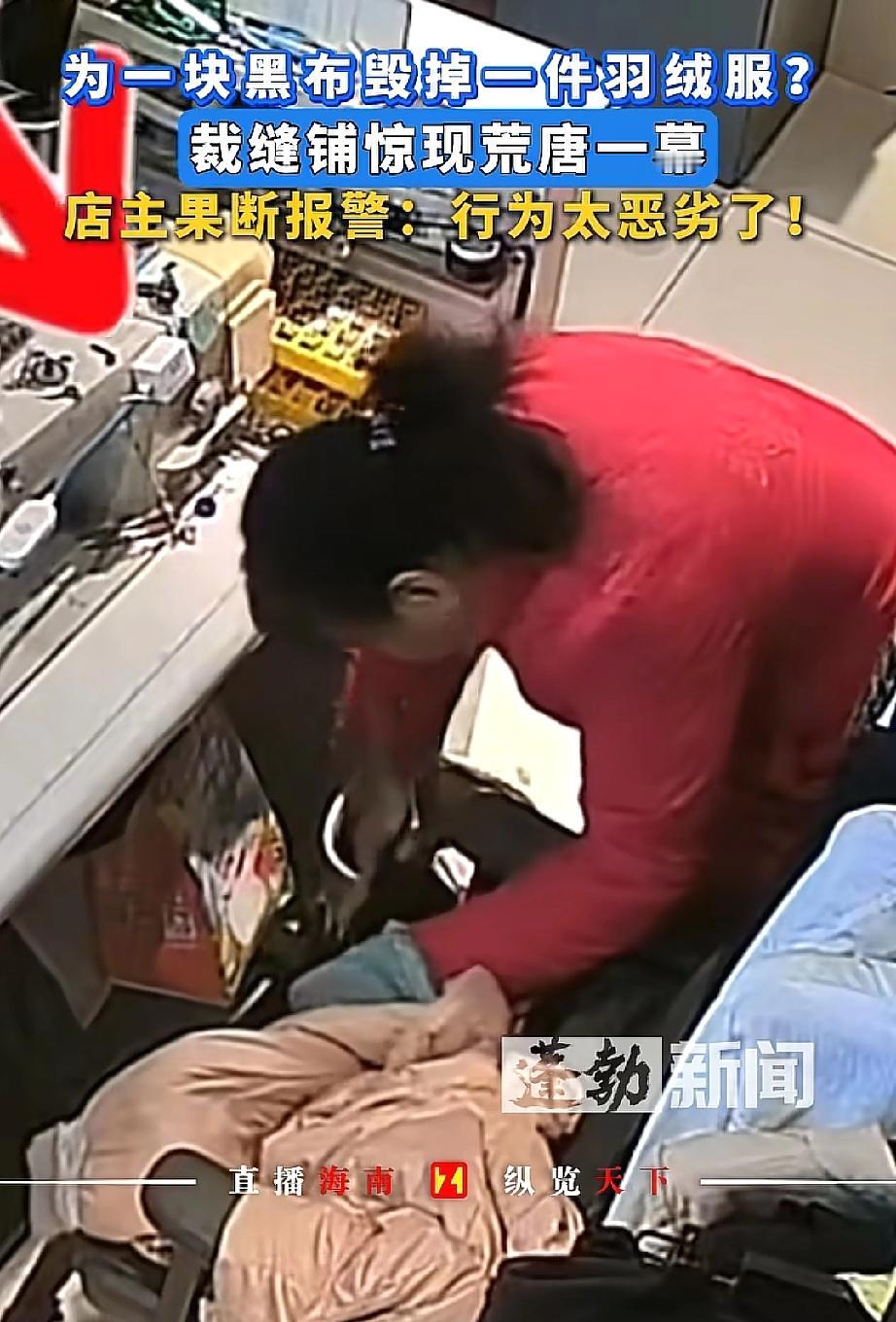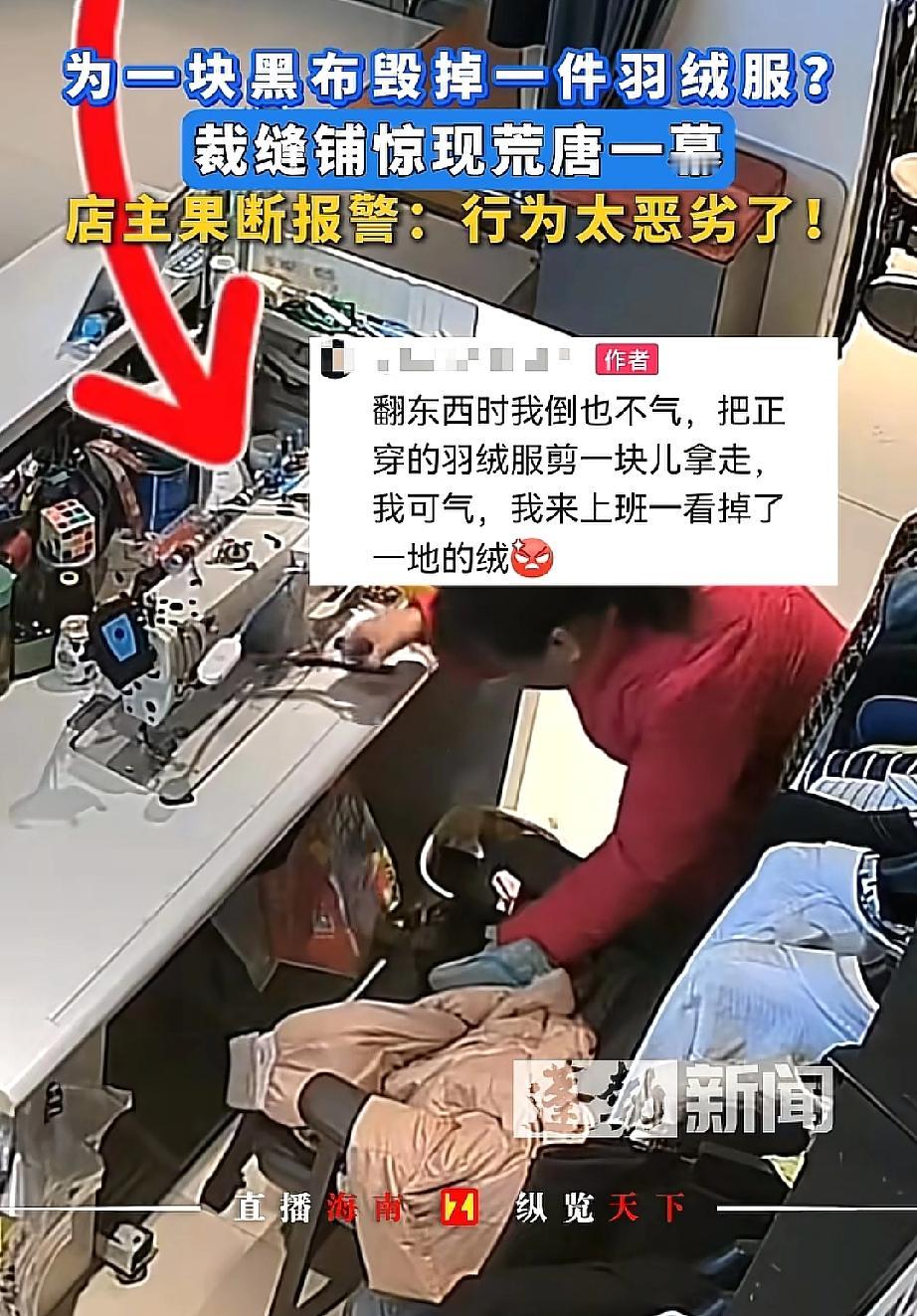 坏到骨子里了!河南漯河,一位大妈为找同色碎布缝补自己的破衣服,趁改衣店店主临时去卫生间的空当,竟直接剪下店主刚买的新羽绒服一块布,拿着就溜了!店主发现后调监控报警,目前商场和警察正全力寻找这位阿姨。网友:机灵过了头! 在河南漯河开改衣店的店主,是专业做衣服修改、定制的,店里平时会有不少剩布。 那天她正埋头干活,突然肚子不舒服,就去了趟卫生间,也就短短几分钟。 可等她回来,眼前的景象让她又急又气——缝纫机旁边的地上掉了一地细细的绒,自己搭在椅子上的新羽绒服,赫然出现一个大口子,绒还在一个劲地往下掉。 干了多年裁缝的店主,一眼就看出这是被人故意剪的。 她赶紧调出店里的监控,这才看清全过程:一位阿姨进店后,在店里到处翻找碎布头,扒拉了好半天觉得都不合适,转眼就盯上了她的新羽绒服。 只见阿姨拿起剪刀,“咔嚓”一声就剪下一块布,比对了一下自己的衣服后,就匆匆溜走了。 店主无奈表示,这件羽绒服是今年刚买的,虽然不算贵重,但大妈这种行为实在太恶劣了,于是她立马报了警,现在商场和警察都在帮忙找人。 网友们炸开了锅:“为了自己补衣服就剪别人的新羽绒服,这阿姨也太自私了吧!都一把年纪了,咋还干这种没脸没皮的事?必须找到她,让她赔一件新的,还得给店主好好道歉!” 可不是嘛!店主开店本就不容易,靠修改定制衣服挣点辛苦钱,就因为临时去了趟卫生间,新衣服就被剪了个大口子,换谁能不窝火? 为了自己那点碎布头,就干出这种损人利己的事,这哪是“机灵”,分明是缺德到家了! 咱们不管多大年纪,做人都得有底线,不能为了自己的一点小方便,就去损害别人的利益。 占小便宜看似“省事”,其实是丢了人品,迟早要为自己的行为买单。希望这位阿姨能早点认识到自己的错误,给店主一个合理的交代。