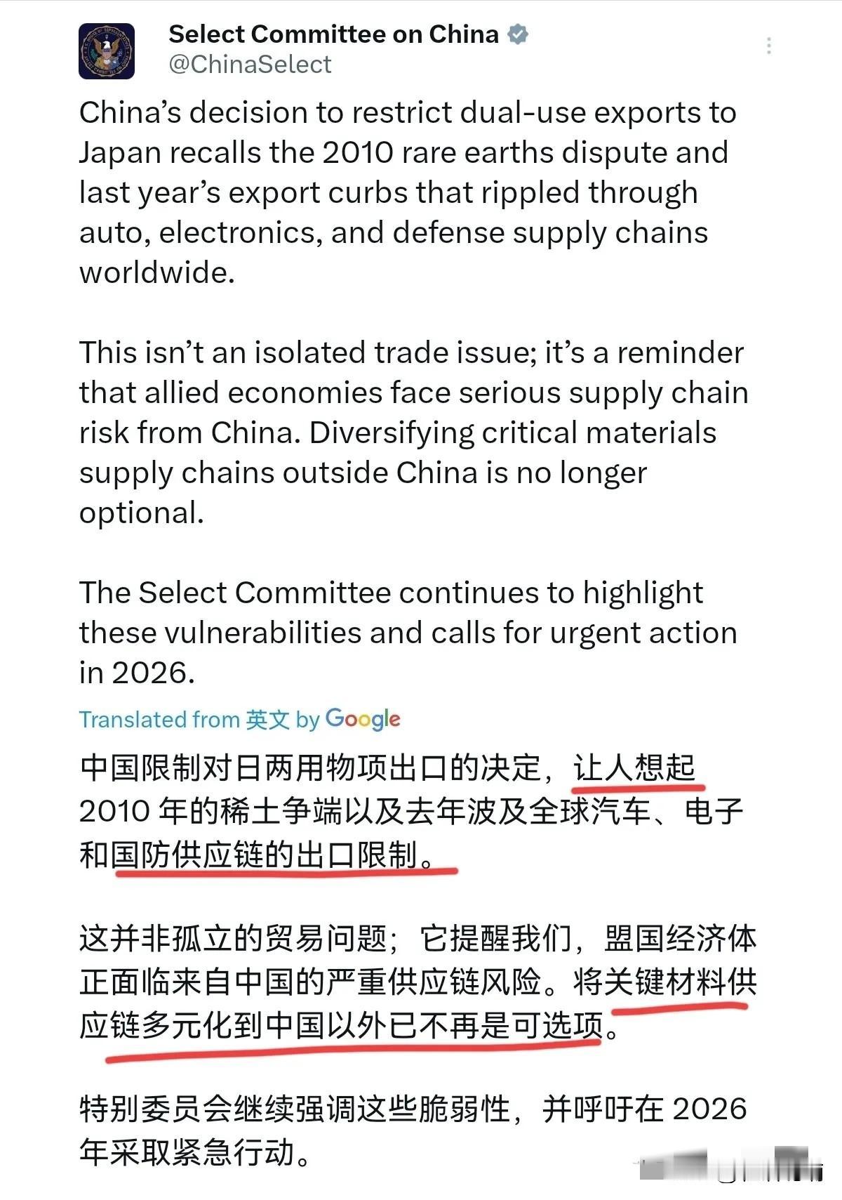 美国终于出来表态了!在我们反制日本之后,1月8日,美中战略竞争特别委员会表示,中国限制对日两用物项出口的决定,让人联想到2010年的稀土争端,以及去年那场波及全球汽车、电子和国防供应链的出口限制举措。该委员会表示,这绝非孤立的贸易问题,而是警示盟国经济体正面临源自中国的严重供应链风险。 你们品品这话多双标?美国自己动不动就对中国芯片、华为下禁令,现在中国反击日本的错误言论,它倒先跳出来喊“风险”,这逻辑简直把霸权主义刻进了骨子里。 要知道这个委员会2023年才成立,说白了就是专门盯着中国找茬的“反华工具”,连美国金融机构合法投资中国企业都要被它无端指责,可见其本质有多偏激。 谁忘了2010年的稀土争端是怎么来的?当年日本在钓鱼岛撞翻中国渔船还态度嚣张,我们才收紧稀土出口配额,结果让依赖中国90%以上稀土的日本工业瞬间慌了神。 那会儿美国雷神公司的“爱国者”导弹缺了稀土磁体,生产线直接瘫痪三个月,现在倒好,它反倒把我们的正当反制说成“供应链威胁”,真是得了便宜还卖乖。 美国说的“去年出口限制”更有意思,那是我们针对稀土全产业链出台的管制措施,连境外用中国技术生产的稀土产品都要管,就是为了反击美国的技术封锁。 这可是中国首次用“域外管辖规则”对等反制,之前美国天天用这招打压别国,现在轮到自己盟友受影响,就急着跳脚,双标的嘴脸暴露无遗。 日本这回纯属咎由自取,高市早苗顶着中方警告,硬说“台湾有事就是日本有事”,还想提升军事实力插手台海,我们才针对性管制两用物项出口。 这些物资看着普通,既能用在汽车、电子产品上,战时就是造导弹、隐身战机的核心原料,日本对中国中重稀土依赖度100%,这禁令就是精准戳中它的软肋。 美国所谓的“供应链风险”,说到底是自己把供应链政治化的恶果。这些年它逼着盟友“去中国化”,可稀土提炼、关键材料生产这些硬骨头,不是短期内能搬到别处的。 就像美国拉着澳大利亚在马来西亚建稀土厂,砸了35亿美元还是离不开中国技术,现在中国掌握主动权,它就开始渲染“威胁”,纯属输不起的表现。 其实这事儿的核心根本不是贸易,而是美国不想看到中国维护自身核心利益。台湾问题是我们的红线,日本敢碰,我们就敢反制,美国想替盟友出头,也得掂量掂量自己的分量。 它口口声声说“保护盟国”,实则是怕自己的霸权地位被动摇,毕竟一旦盟友们发现中国不好惹,美国的盟主权威可就保不住了。 中国现在的出口管制早就不是单纯的资源保护,而是升级成了维护国家安全的战略手段。从稀土到锂电池,从芯片材料到反无人机技术,我们精准打击、对等反制,就是要告诉世界:中国的核心利益不容侵犯。 那些跟着美国起哄的国家也该醒醒,依附霸权只会被当枪使,尊重中国的红线,才是保障自身供应链安全的正道。 各位读者你们怎么看?欢迎在评论区讨论。
