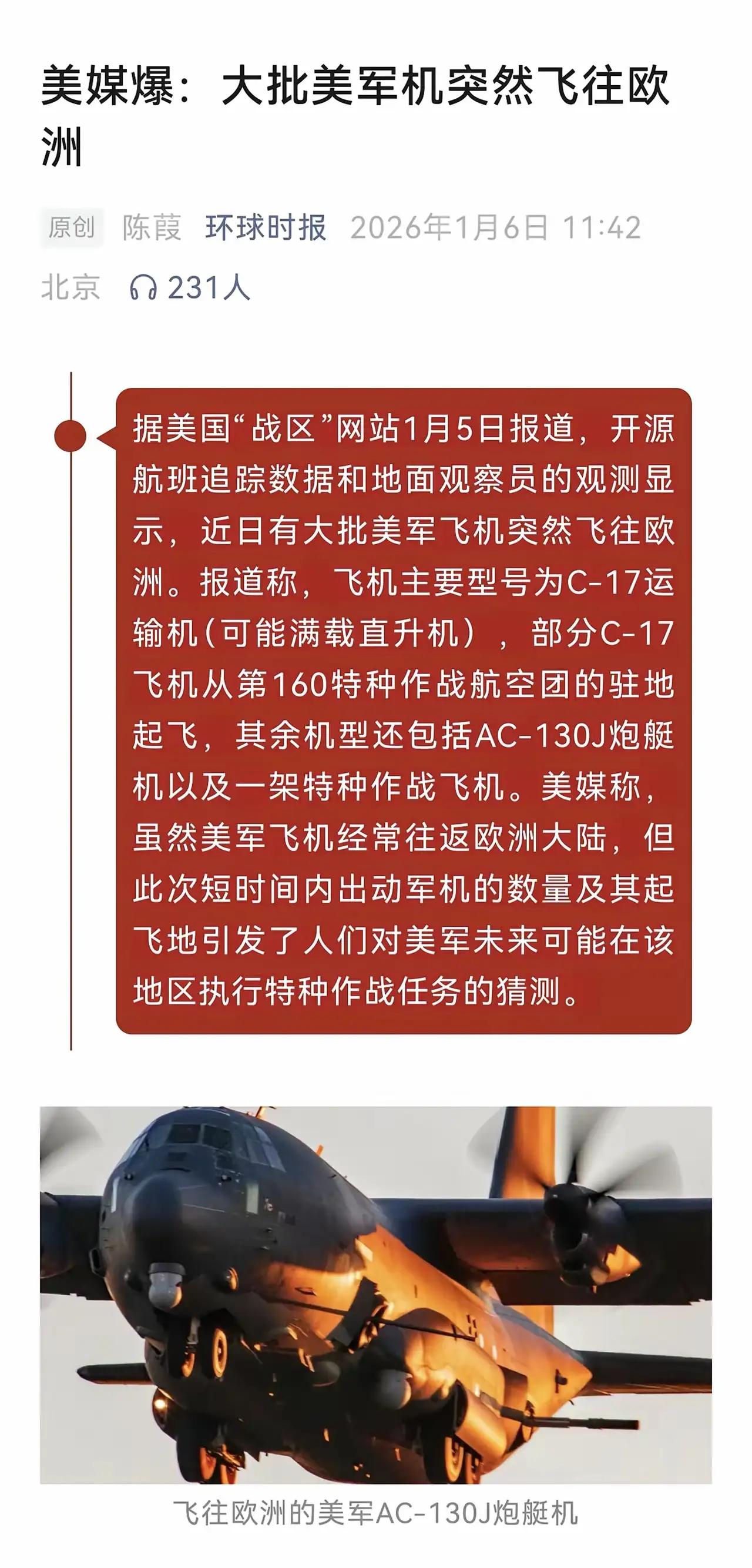 大漂亮在海上扣押大鹅油轮后,又马上发布风险提示,要求其在俄公民离开俄国。5日晚大漂亮已派大量军机进驻其在德基地。这是要亲自下场吗? 现在俄乌、波斯都是热点,似乎万分风险。结合其制服委内瑞拉的行动看,“唐罗主义”势在必行。估计此次是震慑大鹅与欧洲制造紧张,以配合其收编格陵兰岛的行动。