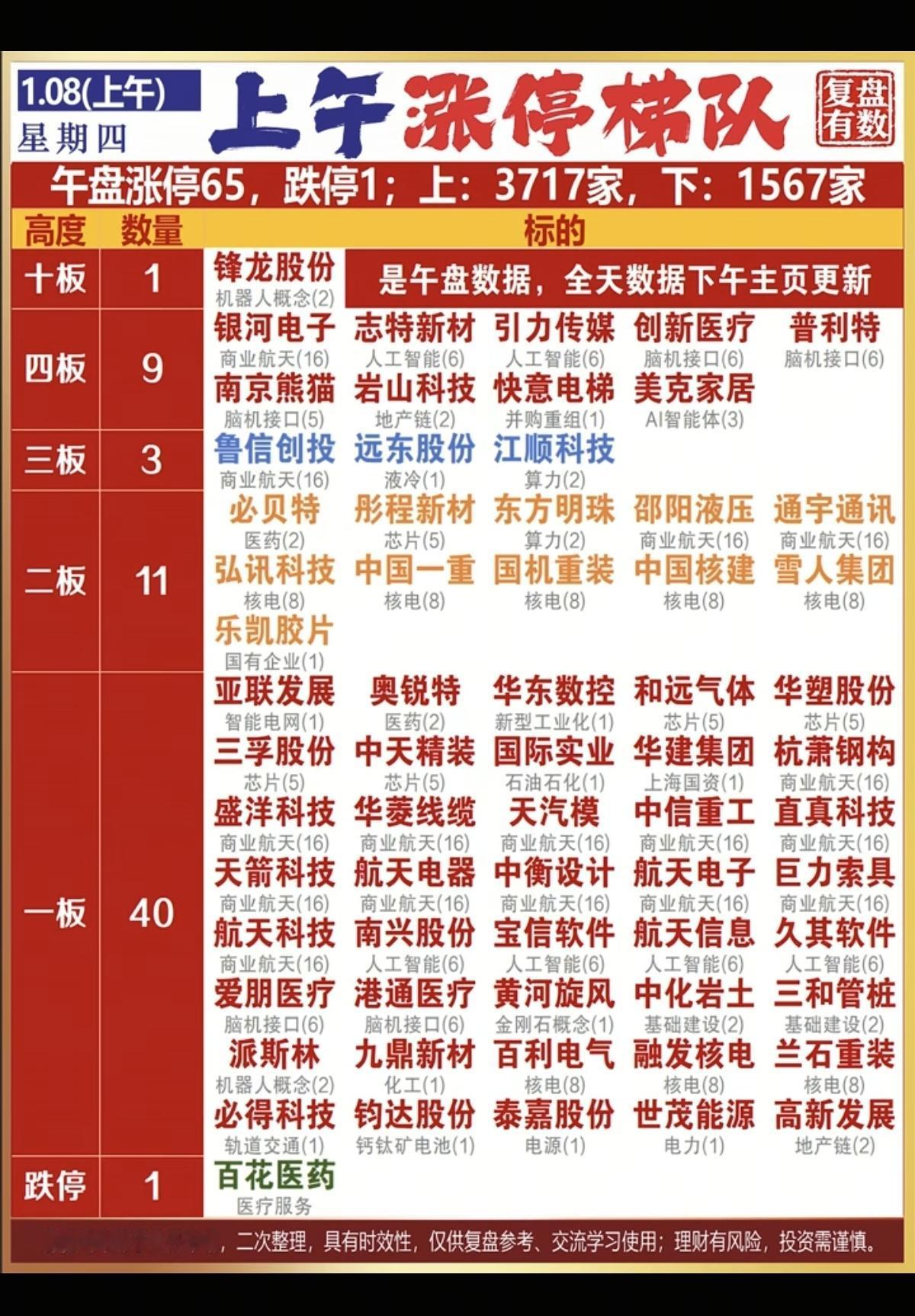 1.08周四 涨停板股票:复盘统计! 涨停板65家,跌停1家 涨跌比3717 :1567 涨停焦点:军工信息化,航母,脑机接口