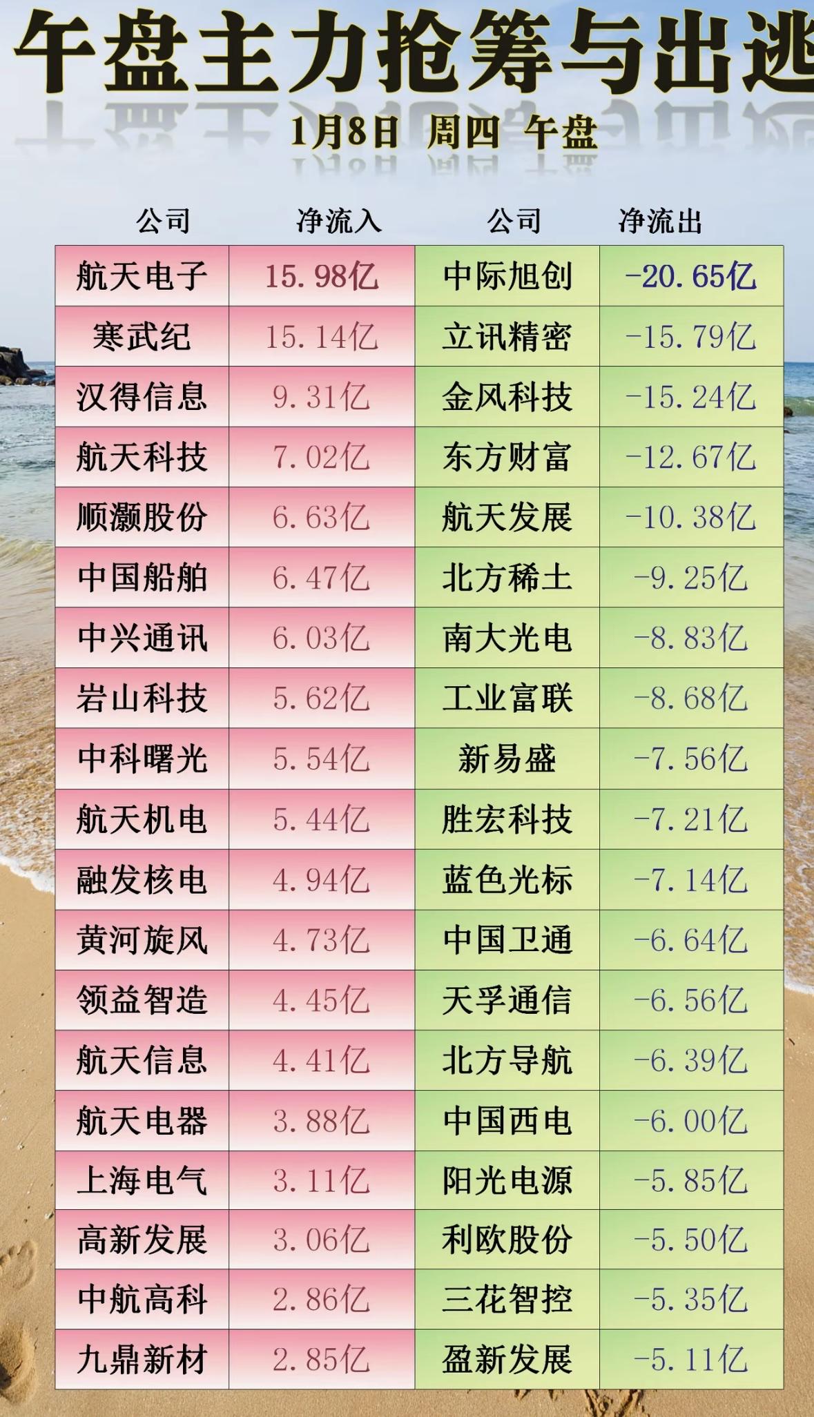1.08午盘主力抢筹与出逃,哪些公司值得关注? 主力资金流向两极分化:航天电子等