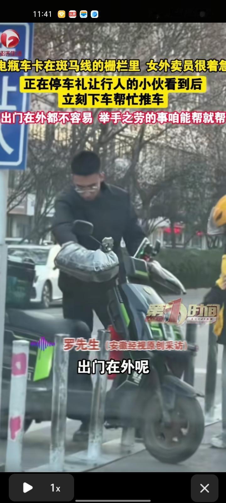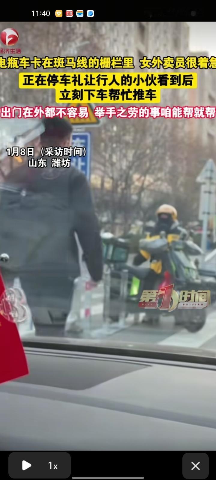 1月7日,潍坊诸城市。网友发视频称,自己停车礼让行人时看见外卖员要过马路,电车卡在斑马线的栅栏出不来了,随后,立马棒外卖员把车推出来。出门在外的大家都不容易,能帮一把是一把