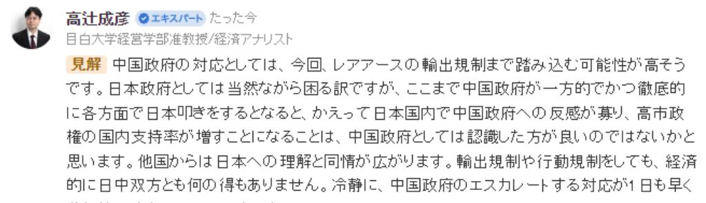 日本见抗议无效,现在开始换套路了。 针对中国对出口日本军民两用物项的限制禁令,日本经济专家高辻成彦今天开始“警告”中国了。他说:中国对日本进行限制,当然会造成日本的困扰,但中方如此单方面的打压日本,势必会加剧日本国内对中国的“反感”,进而推高高市早苗的国内支持率。他还强调“中国最好认清这一点”。 真是笑话,中方此次加强对日军民两用物项出口管制,可不是所谓的“单方面打压”,而是有理有据的反制措施。 根据商务部1月6日的公告,这一禁令的直接原因是日本领导人近期公然发表涉台错误言论,甚至暗示武力介入台海的可能性,这种粗暴干涉中国内政的行为,严重违背一个中国原则,性质和影响都极其恶劣。 高辻成彦刻意回避这一核心前提,将中方的正当反制定义为“单方面打压”,本质上是在偷换概念。 再看高辻成彦所谓“加剧日本国内对中国反感、推高高市早苗支持率”的说法,看似在传递威胁,实则暴露了日本舆论场的片面性。 查阅佐佐木和平基金会2024年的调查数据,日本民众对中国的不亲近感已经达到73.1%,比上一年上升了2.1个百分点,而认为中日关系不佳的比例更是高达75.5%。 这一数据说明,日本国内对中国的负面情绪早有积累,并非中方此次禁令所引发。 更关键的是,高市早苗的支持率走高,核心原因是她的右翼强硬姿态迎合了部分日本民众的情绪,去年12月的民调就显示,55%的日本受访者支持她采取更严厉的对华政策,这一比例远超主张灵活应对的群体。 把日本国内的舆论倾向和政客支持率变化归咎于中方的正当反制,无疑是在颠倒因果。 高辻成彦提到的“日本的困扰”确实存在,但这种困扰的根源不在中方,而在日本政府的错误决策。 从经贸数据来看,日本对中国相关物项的依赖度远超外界想象。 以稀土为例,中国占据全球七成以上的稀土产量和八成以上的稀土磁铁产量,而日本约70%的稀土进口依赖中国,其中用于高端制造业和武器生产的镝等重稀土,几乎完全依赖中国供应。 野村综合研究所的测算显示,若中方稀土出口限制持续一年,日本经济损失将达到2.6万亿日元,约合人民币1161.6亿元,年GDP可能因此减少0.43%。 1月6日中方禁令公布后,日本东证股价指数当天就下跌0.55%,矿业股指数领跌3.2%,市场的反应已经直接印证了这种“困扰”的真实性。 但日本的应对思路显然走偏了。 在中方禁令公布后,日本外务省亚洲大洋洲局局长金井正彰率先提出所谓“强烈抗议”,声称中方措施“与国际通行惯例严重不符”,却对自身涉台错误言论避而不谈。 这种抗议姿态并未起到任何作用,于是才有了高辻成彦这番“舆论施压式”的警告。 他们试图营造一种“中方反制会反噬自身”的假象,却忽略了最核心的逻辑:中方的反制力度完全取决于日方的态度,若日方能够纠正错误言行,尊重一个中国原则,中日经贸合作的基础自然存在;若执意沿着错误道路走下去,中方必然会采取更有力的措施维护自身利益。 还要看清的是,高市早苗支持率的所谓“韧性”,本身就是建立在短期情绪之上的脆弱平衡。 去年12月的民调显示,她的内阁支持率维持在68%,其中认可其对华姿态的群体中,支持率高达89%。 但这种“聚旗效应”往往难以持久,一旦中方反制的影响全面传导到日本民众的日常生活中,比如制造业停工导致的就业压力、高端产品涨价带来的消费负担等,民众的态度很可能出现反转。 日本商会已经开始紧急发声,希望中日两国政府说明相关注意事项,若企业活动受到实质影响将提出交涉,这也说明日本产业界对政府的强硬路线并非完全认同。 对于中方而言,高辻成彦的警告更像是一种无力的表态。 中方从来没有回避中日经贸合作的重要性,但也绝不会以牺牲核心利益为代价。 此次禁令的管控范围虽然没有明确列出具体物项,但涵盖了从化学品、电子产品到航空航天设备的800多个品类,这些品类占日本2024年自华进口总额的42%左右。 这一精准打击既体现了中方的克制,也展现了反制的决心。 所谓“加剧日本国内反感”,本质上是日方试图将内部矛盾外化的手段,中国不可能因为这种威胁就放弃维护国家主权和利益的底线。