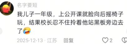 我儿子一年级,上公开课就脸向后摇椅子玩,结果校长忍不住拎着他站黑板旁边去了