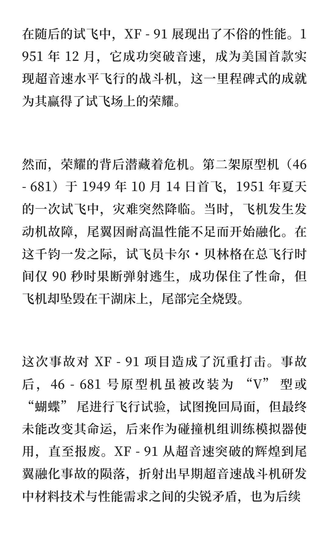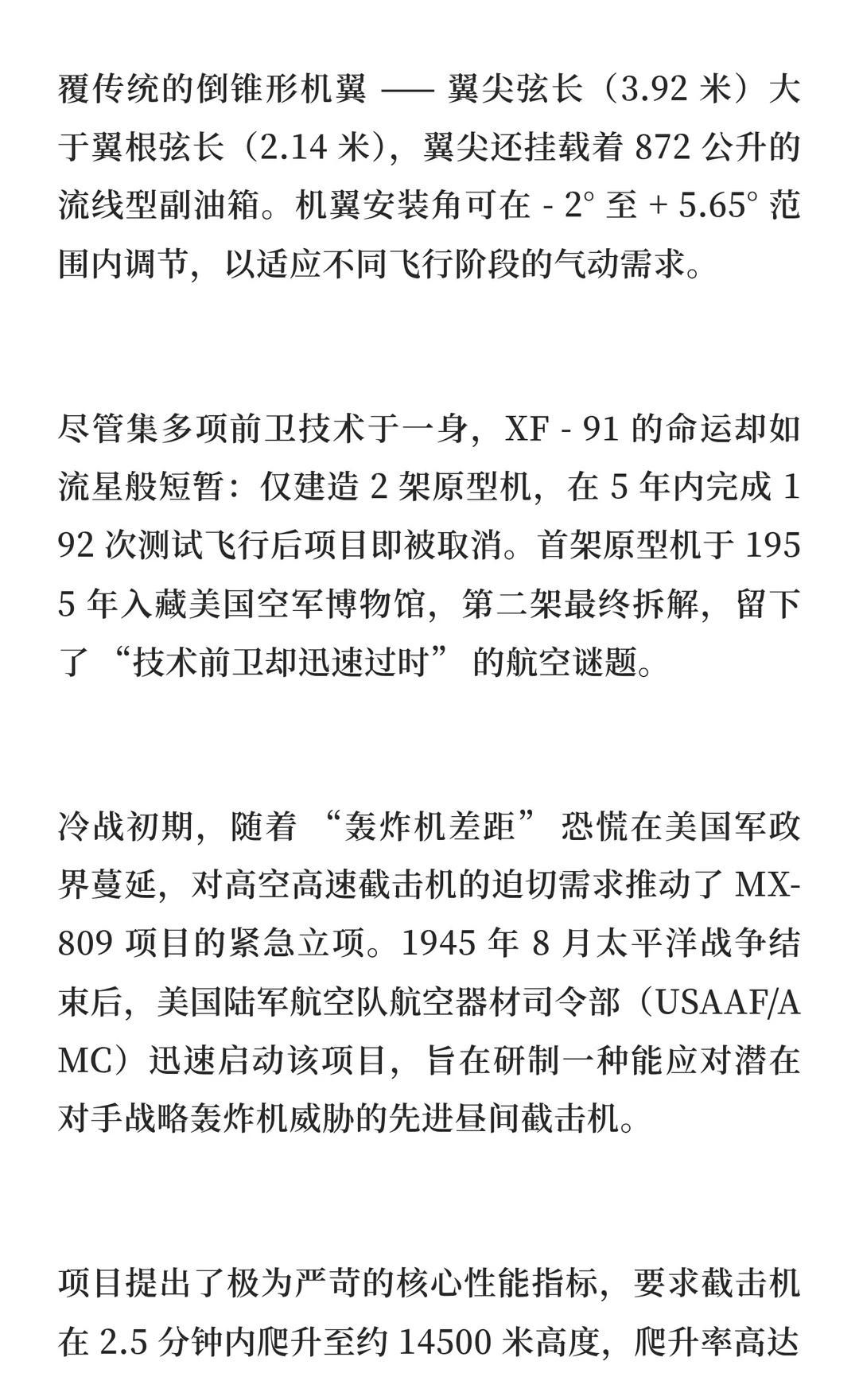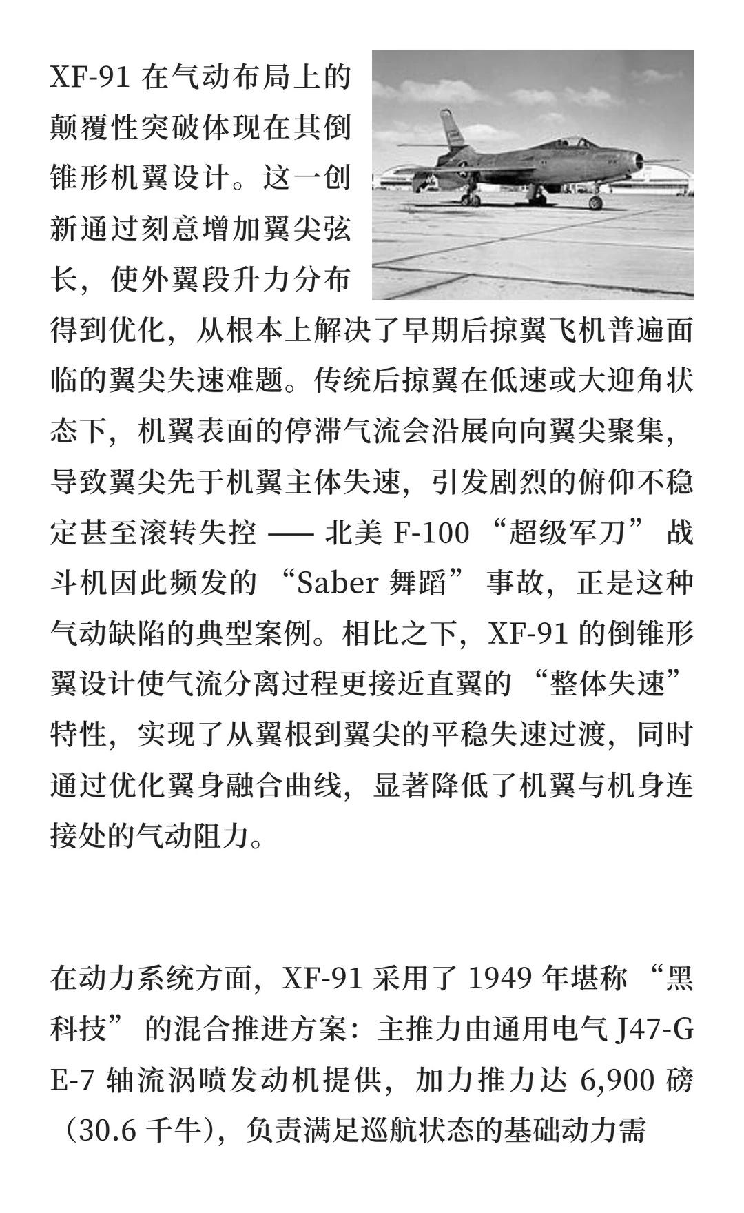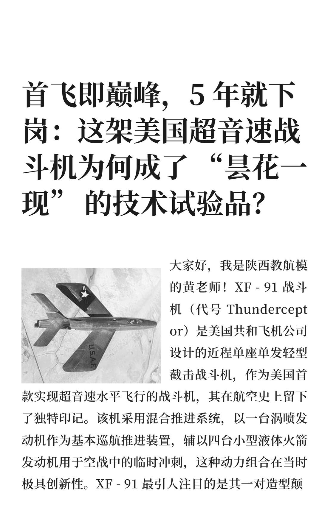 首飞即巅峰,5 年就下岗:这架美国超音速战 XF-91是美国首款超音速战斗机,采用倒锥形机翼和混合推进系统,但因技术迭代和性能不足于1954年被取消,但其技术为后续战机设计提供了重要参考。航模黄老师 一起看飞机 航天 战斗机 军事 航空