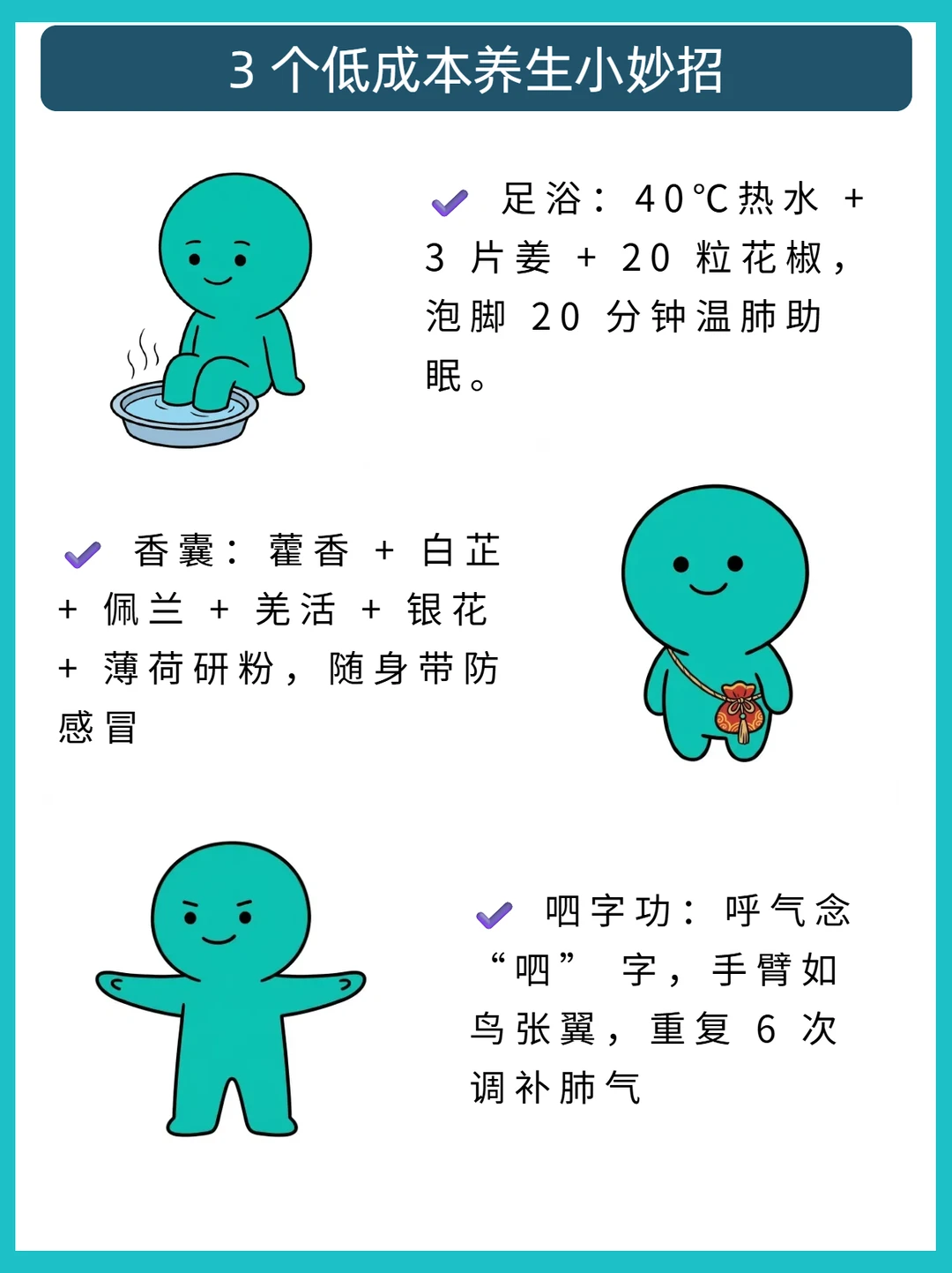 ✔️ 足浴:40℃热水 + 3 片姜 + 20 粒花椒,泡脚 20 分钟温肺助眠