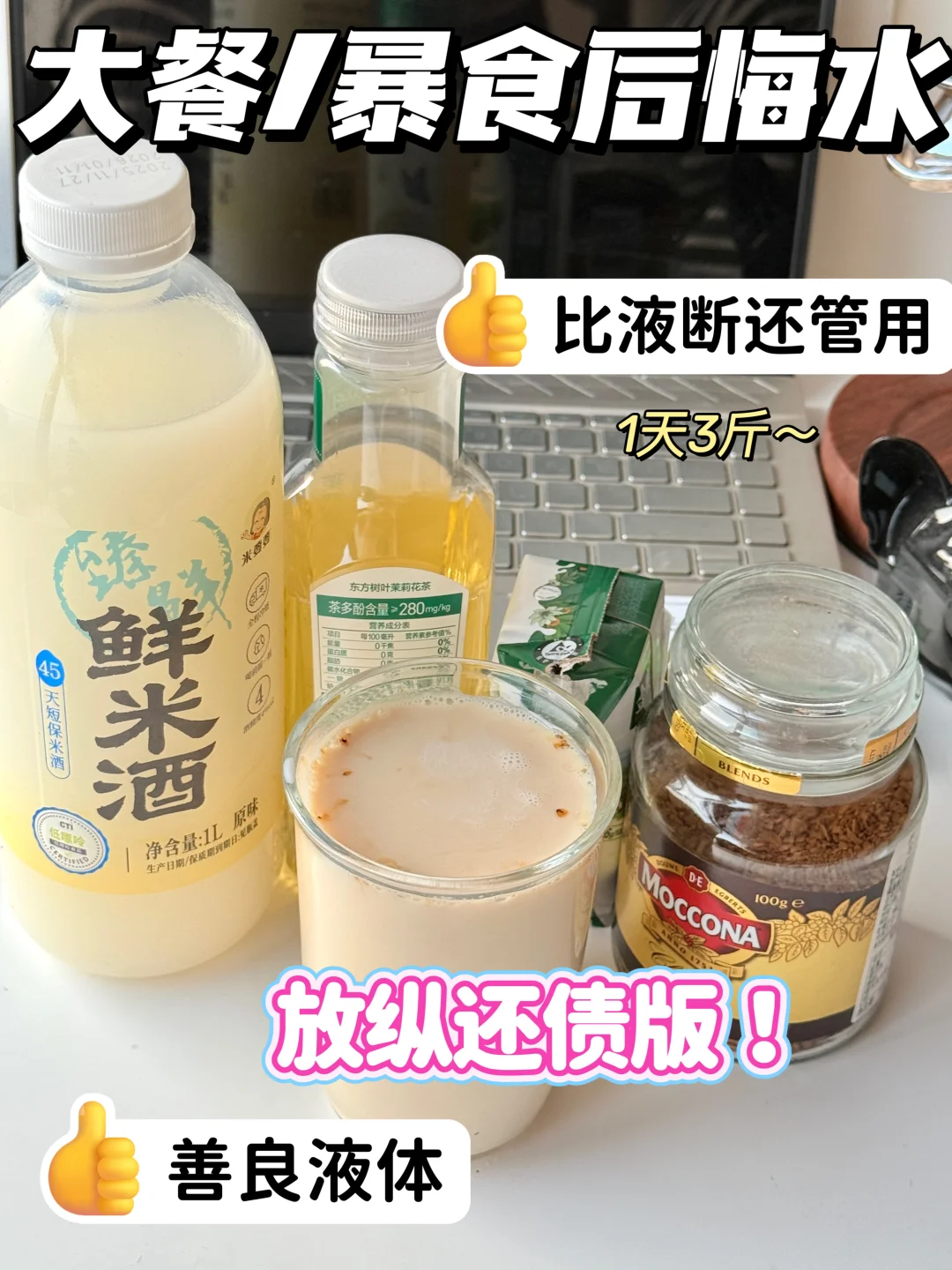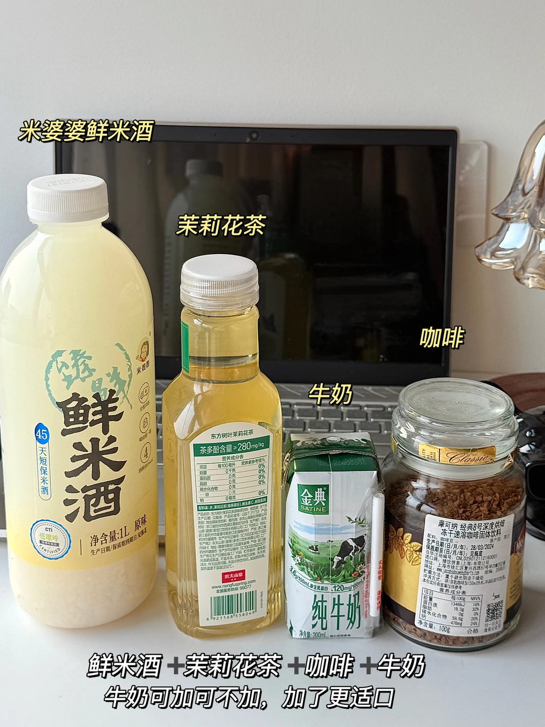 给大家分享一个我无意间发现的超🐮的善良水,鲜米酒➕咖啡➕茉莉花茶,加牛奶更好喝些,我圣诞节生日,团建大餐后都喝的这个善良水,屡试不爽!!!