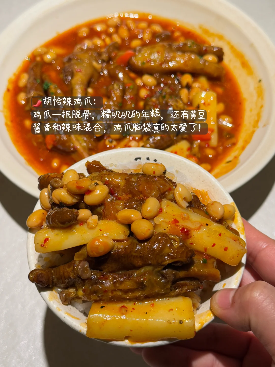 鸡爪一抿脱骨,糯叽叽的年糕,还有黄豆都好好吃,酱香和辣味混合,鸡爪脑袋真的太爱了!