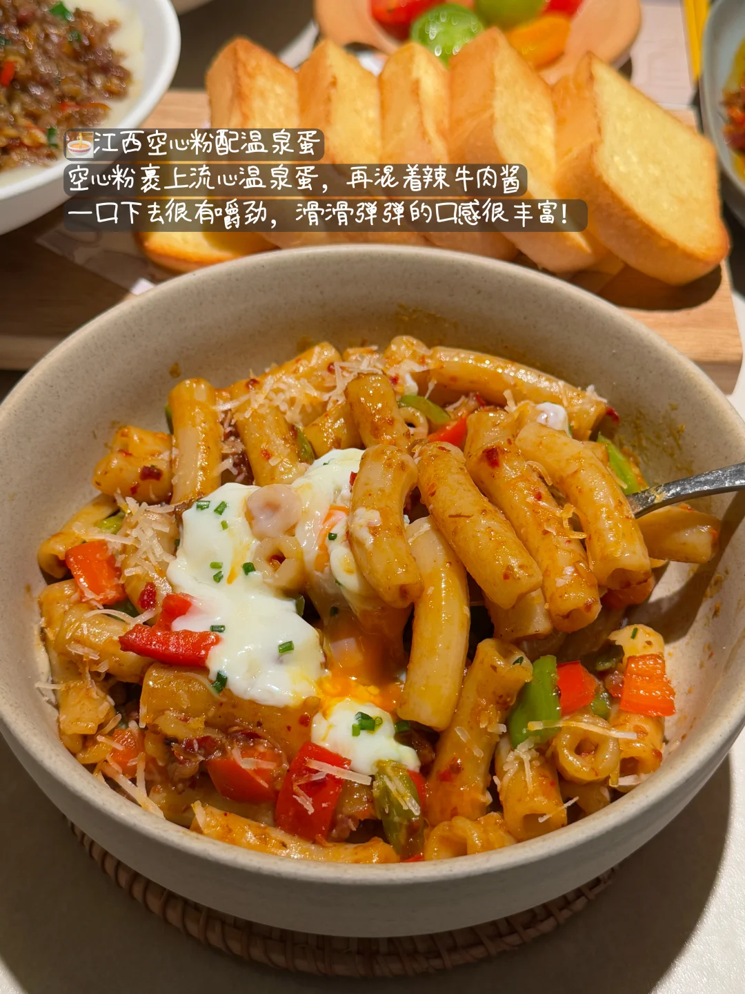 空心粉裹上流心温泉蛋,再混着辣牛肉酱,一口下去很有嚼劲,滑滑弹弹的口感很丰富!