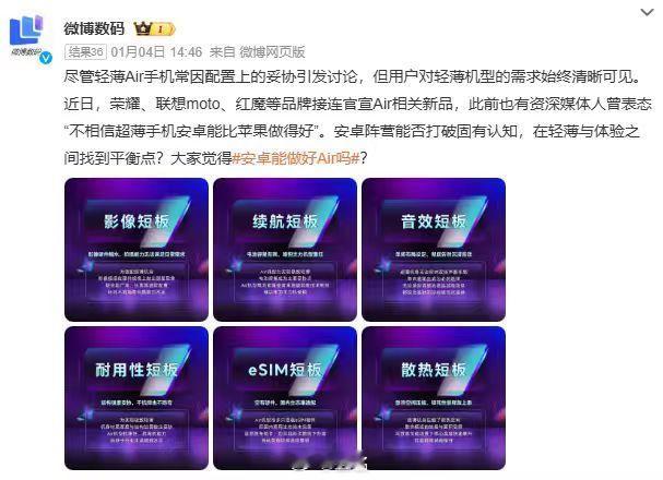 荣耀高管再度回应Air手机争议最近讨论关于荣耀会不会做Air,能不能做好Air热度是真大……荣耀产品线总裁方飞也正面回应争议:我们做好Air的决心从未动摇。荣耀凭借多年技术积累,从三代行业最薄折叠屏到青海湖电池、金刚巨犀玻璃等多项自研创新,荣耀确实已具备打造Pro级Air手机的实力,大家可以拭目以待
