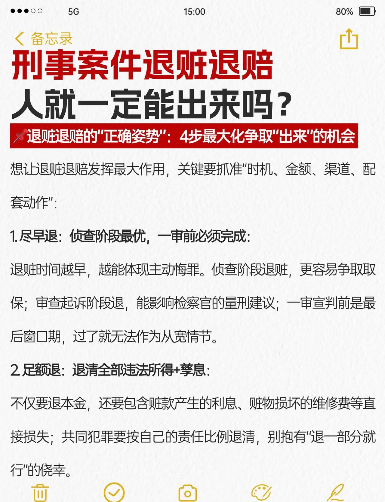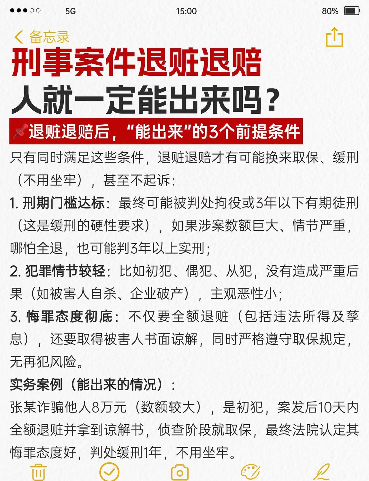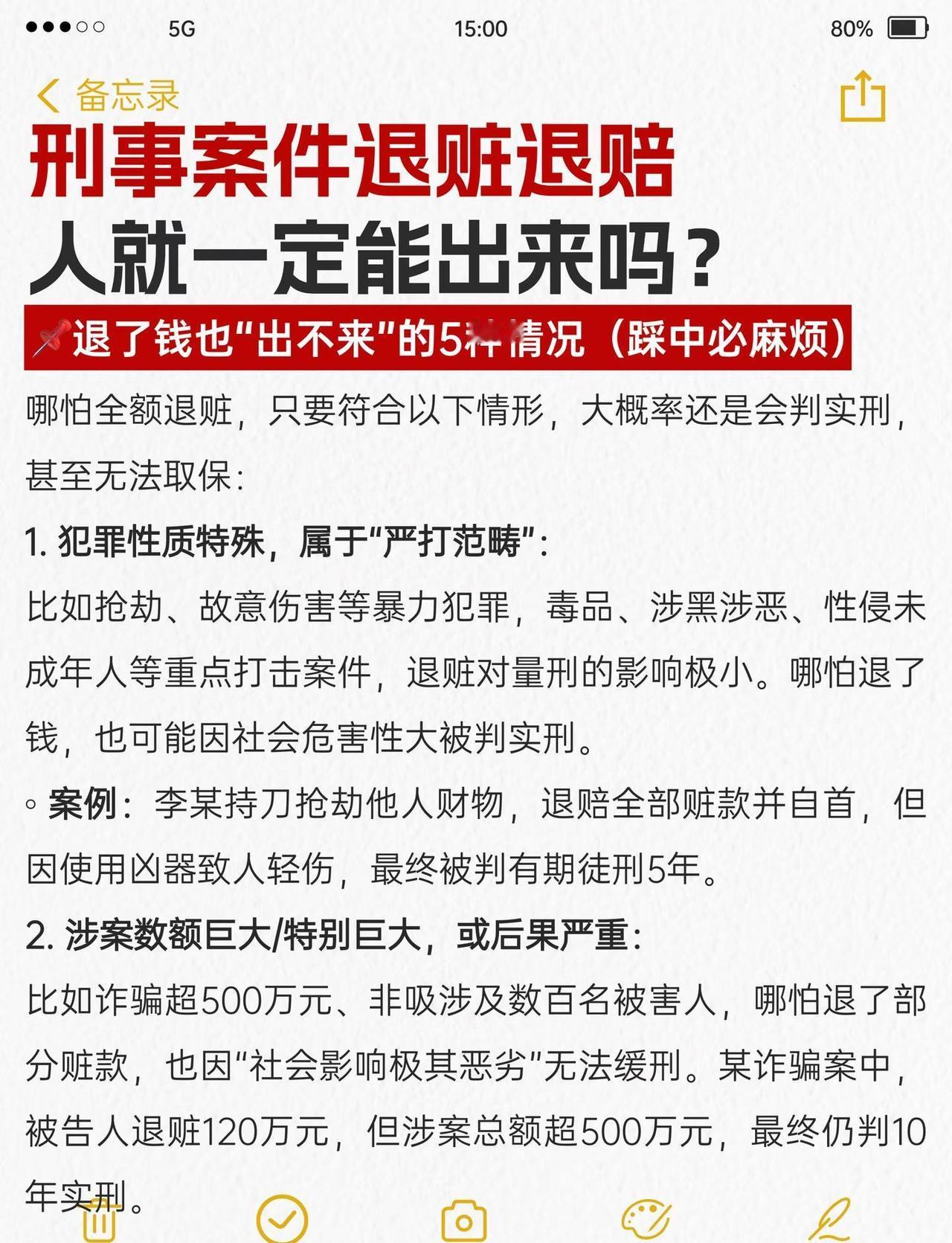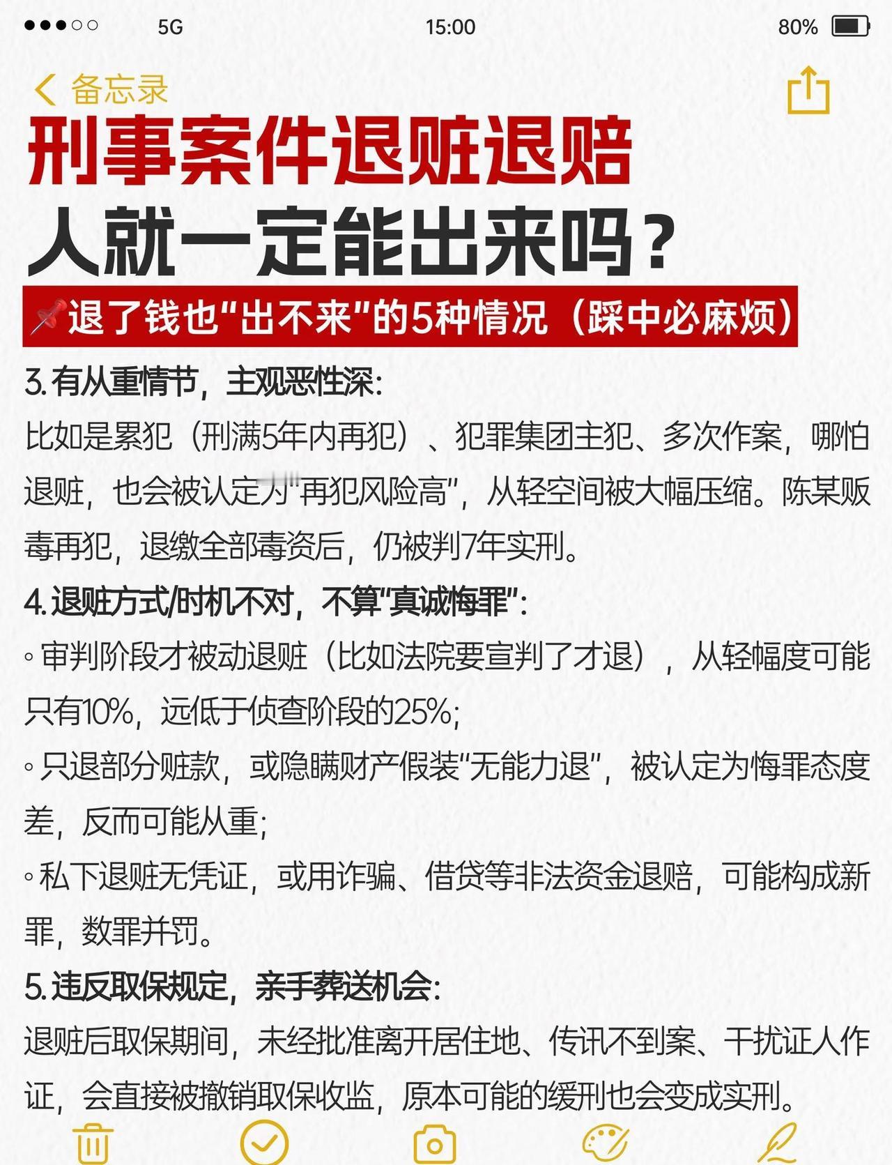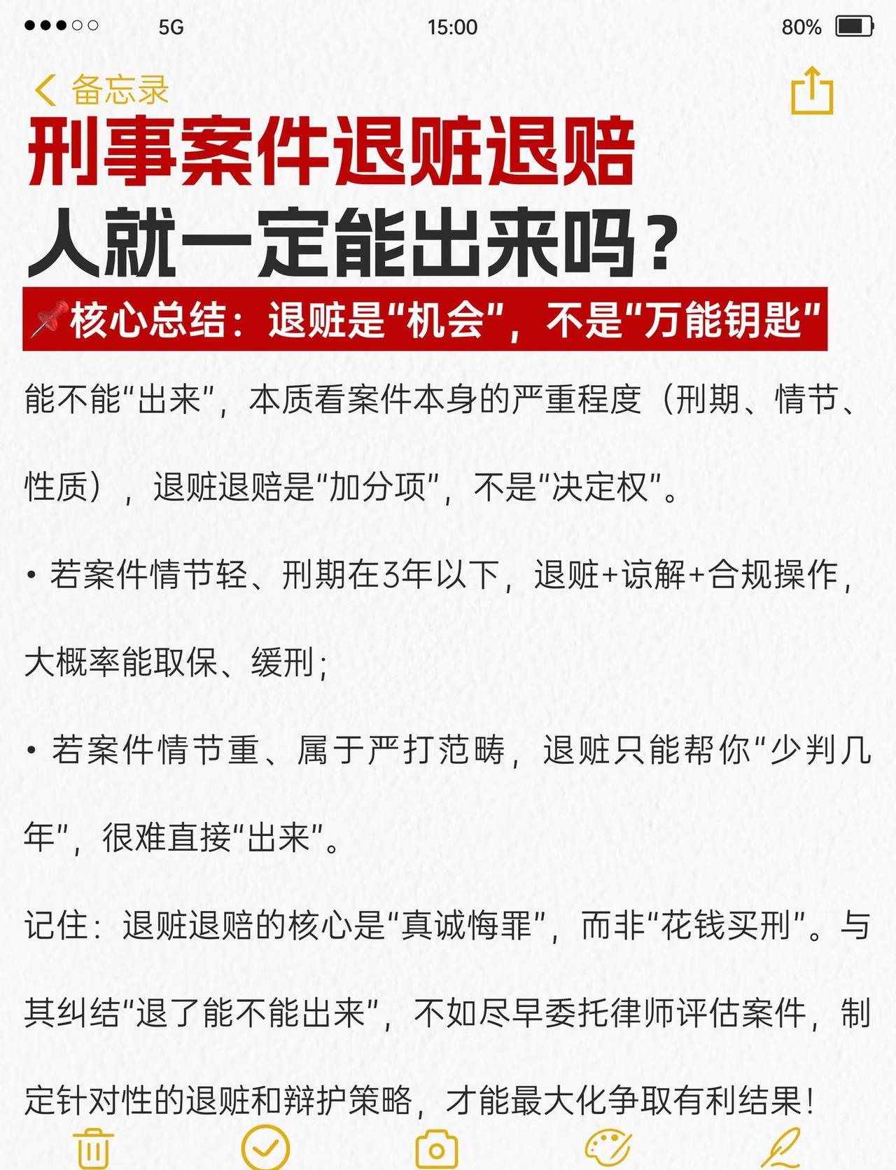 刑事案件退赃退赔,人就一定能出来? 很多当事人和家属都有个执念:“只要把钱退了,人肯定能放出来”——但实务中,有人退了钱照样判实刑,有人没退完却能取保缓刑。其实退赃退赔是刑事案件的“量刑加分项”,不是“免罪金牌”,能不能“出来”,关键看这5个核心逻辑,今天拆透背后的法律规则和实操要点刑事辩护 刑事辩护律师 刑事律师 律师咨询 律师 刑事会见 取保候审 刑事 法律