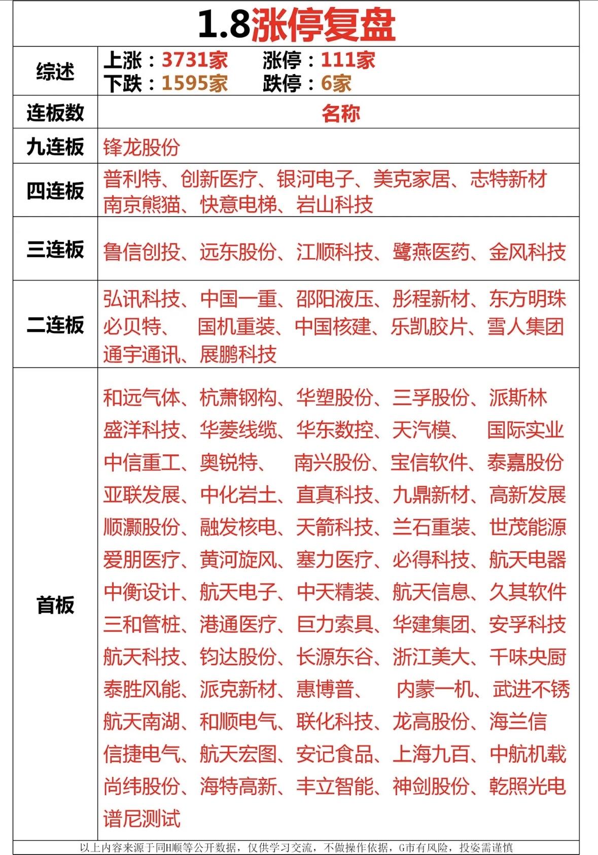 1月8日股市涨停复盘:3731家上涨,111家涨停,6家跌停 "股市回暖涨停潮,锋龙领涨九连板,多股跟风四连跃,投资需谨慎莫追高。"