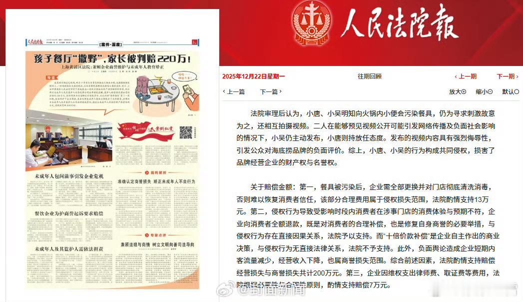 这事儿的判决和道歉,既给公众出了口气,也踩准了教育的分寸。17岁也不小了,往火锅里小便还发上网,既糟践了公共卫生,也砸了企业的招牌,不能就一句“孩子不懂事”能带过的确220万赔偿也让监护人明白,监护从来不是空话,得为孩子的出格行为担责;登报道歉也不是羞辱,而是让少年在公众监督下记住:自由的边界是规则,个性的底线是尊重。网民的愤怒能理解,这事儿触碰的是大家对食品安全、公共文明的底线期待。但老胡也觉得,既然孩子认错了,家长也担了责,咱们也得给改过自新的空间。希望这起案例能给所有家庭提个醒:教育孩子守规矩、明事理,才是最该花的功夫。
