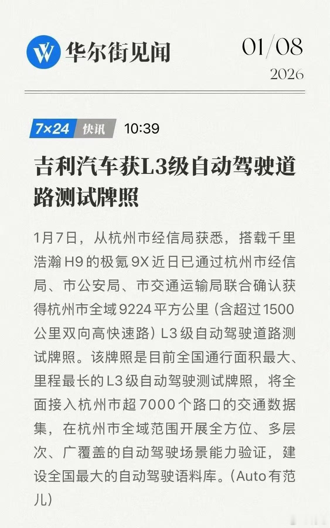 吉利汽车也拿到了L3级自动驾驶道路测试牌照了~搭在千里浩瀚H9的极氪9X这下可以