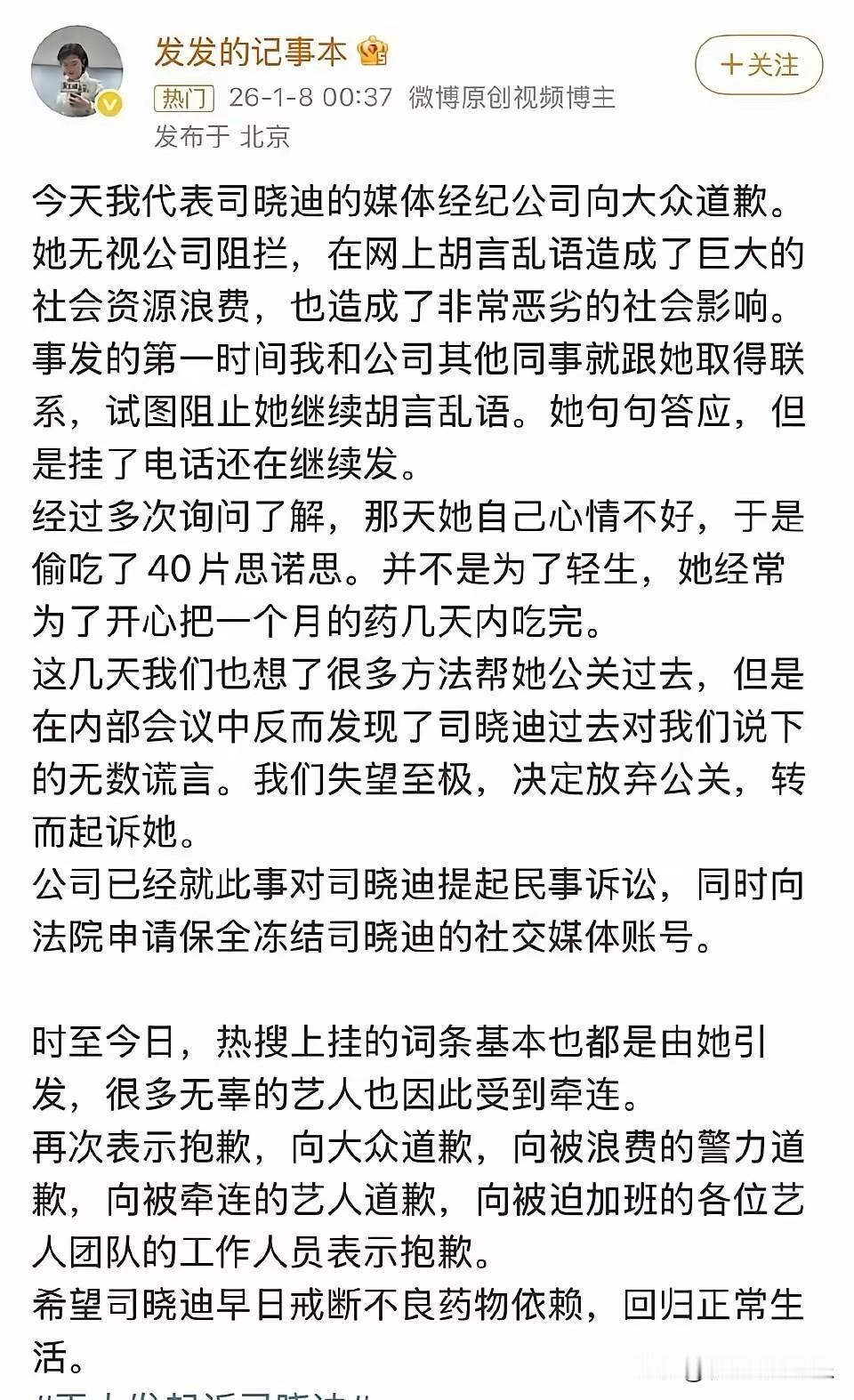 司晓迪被自己的经纪公司起诉了,她偷吃40片思诺思一条条爆料发文锤顶流,老板王大发暗示这姑娘嗑药。 王大发道歉准备放弃司晓迪,没想到司晓迪爆料还能反转,顶流们该松一口气了。 这种女孩子不自爱,人尽可夫,偷拍别人暗自截图聊天记录,就是没有武德,不尊重游戏规则的人就该被踢出局。 至于事情的真相是什么,永远不会有人知道了,成年人做错事情就要为自己的行为负责,后果自负。