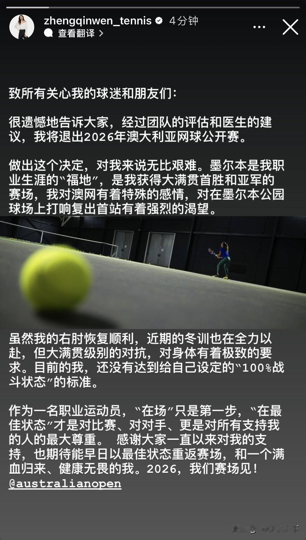 郑钦文在Instagram上发布最新动态,宣布退出2026年澳大利亚网球公开赛,具体复出时间待定。 中国🇨🇳一姐澳网亚军郑钦文,因肘伤未能达到最佳100%的竞技状态,宣布退出2026年第一项大满贯赛事。 同时她也提到,感谢大家一直以来对她的支持,期待自己能早日以最佳状态重返赛场。 期待郑钦文早日满血归来,驰聘沙场!郑钦文 郑钦文赛程安排 郑钦文退赛 澳网