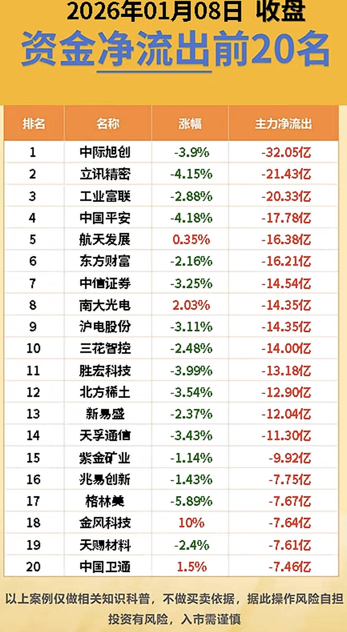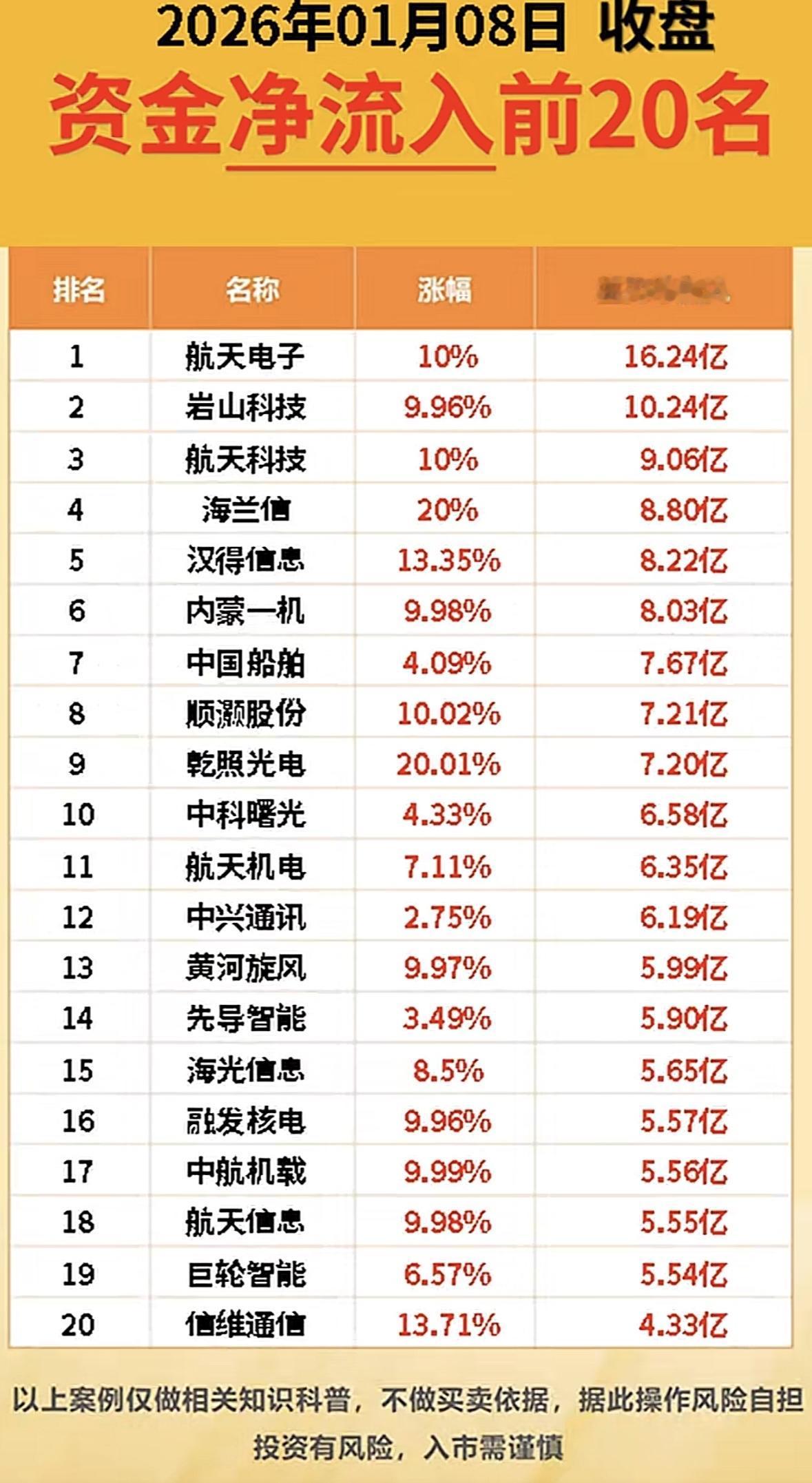 2026年1月8日资金净流入前20名,航天电子领跑! "航天电子领涨10%,主力抢筹16亿!军工科技股霸榜,海兰信20%封板,资金扎堆硬核赛道 "航天电子领涨,军工科技股强势吸金,市场资金偏爱高增长板块,投资需谨慎。"