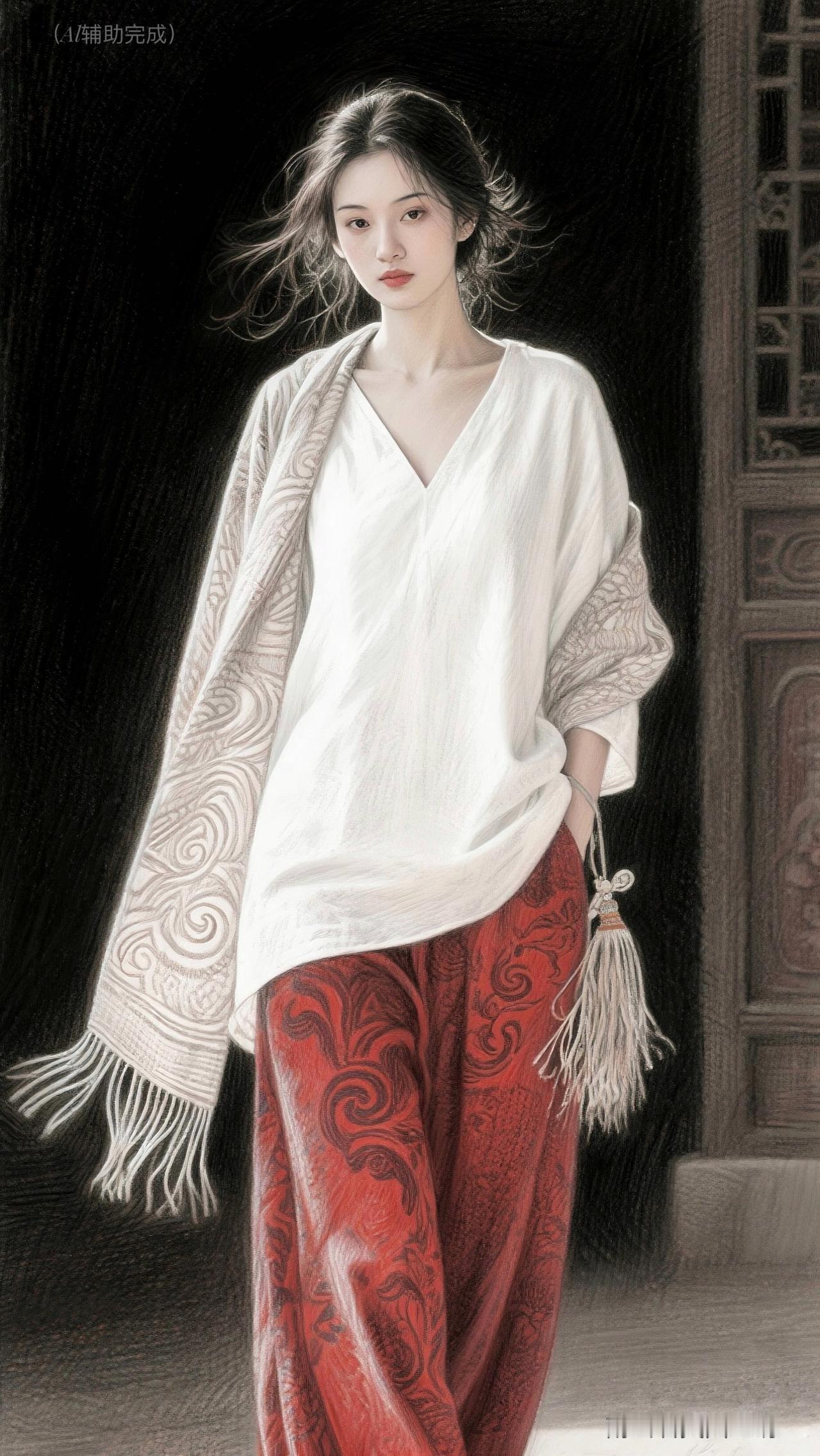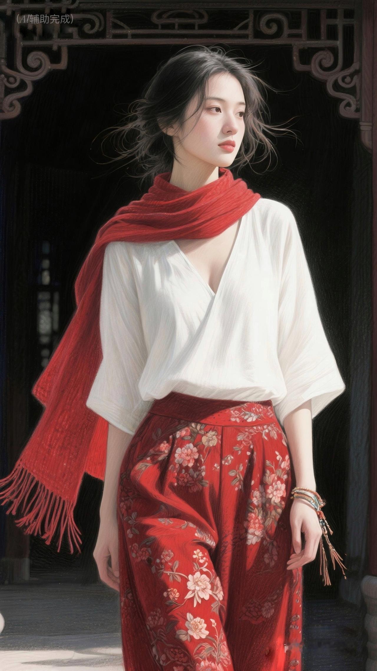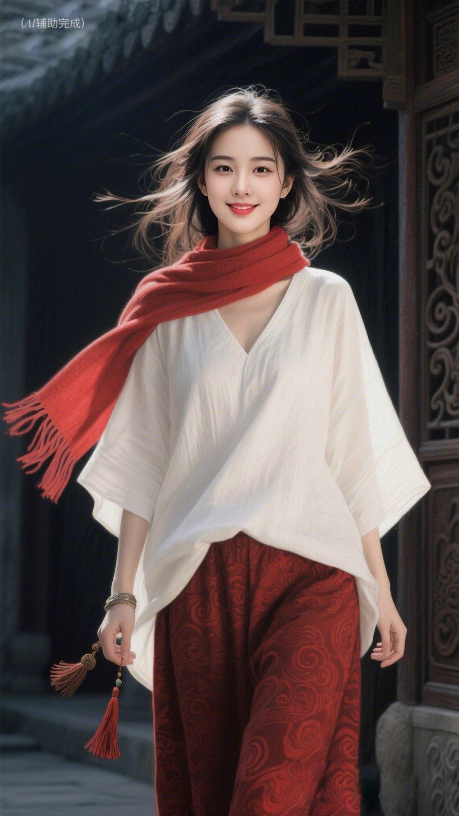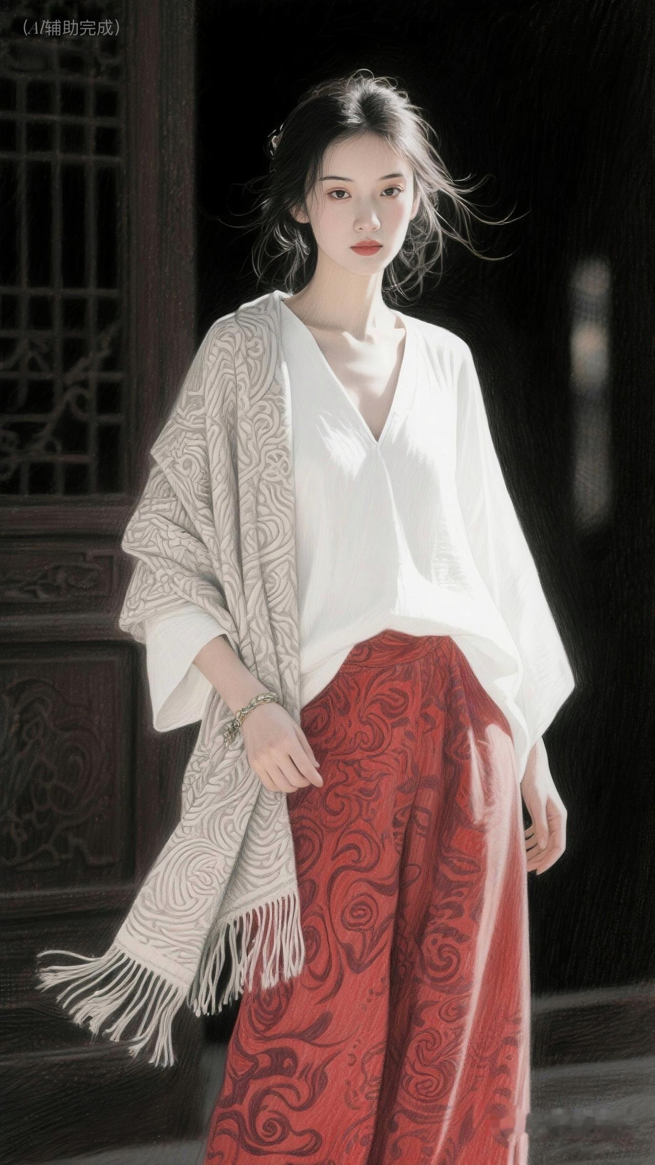 风拂发丝立古建,白衫搭红纹阔腿裤,流苏披肩添雅韵。她眉眼沉静,腕间串珠轻晃,红与白的撞色像揉碎的诗。东方温婉在古意里漫开,这帧古典美,一眼沦陷。