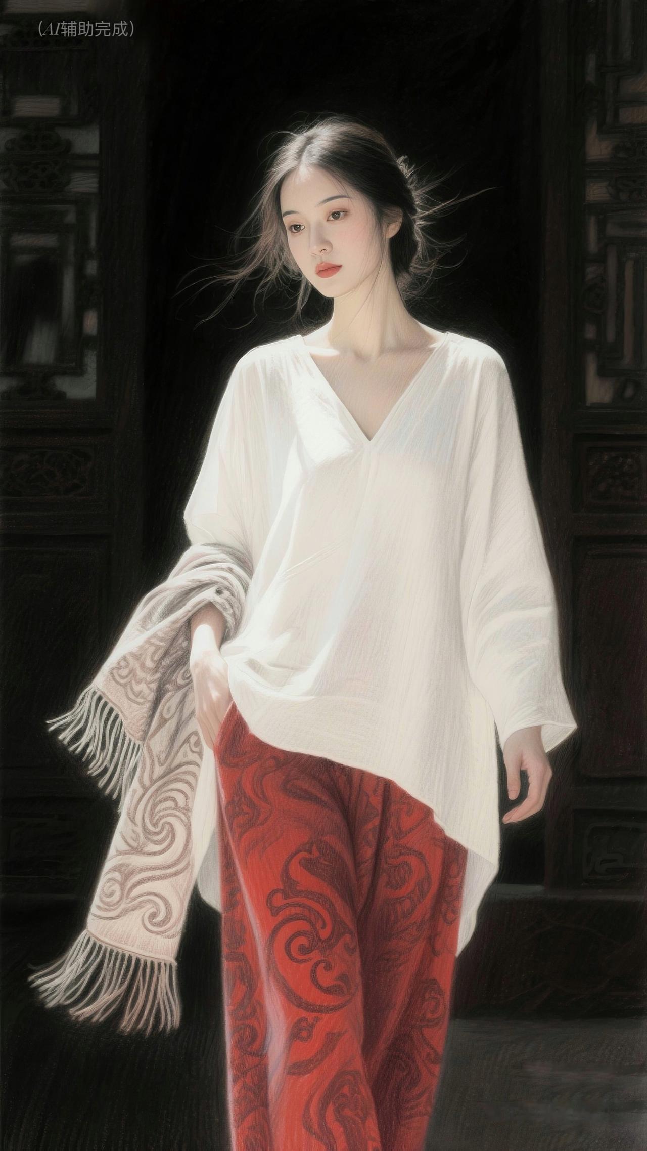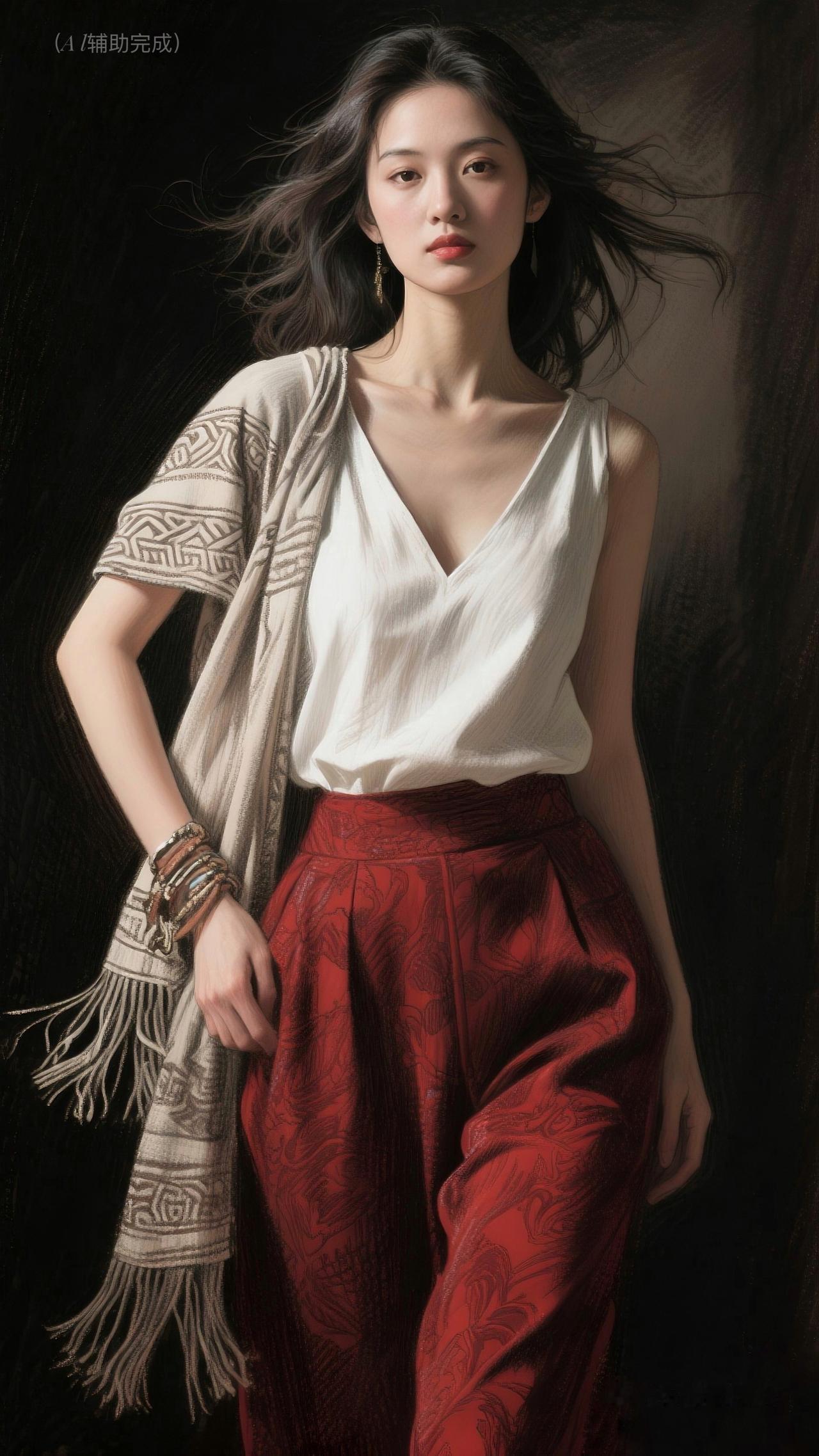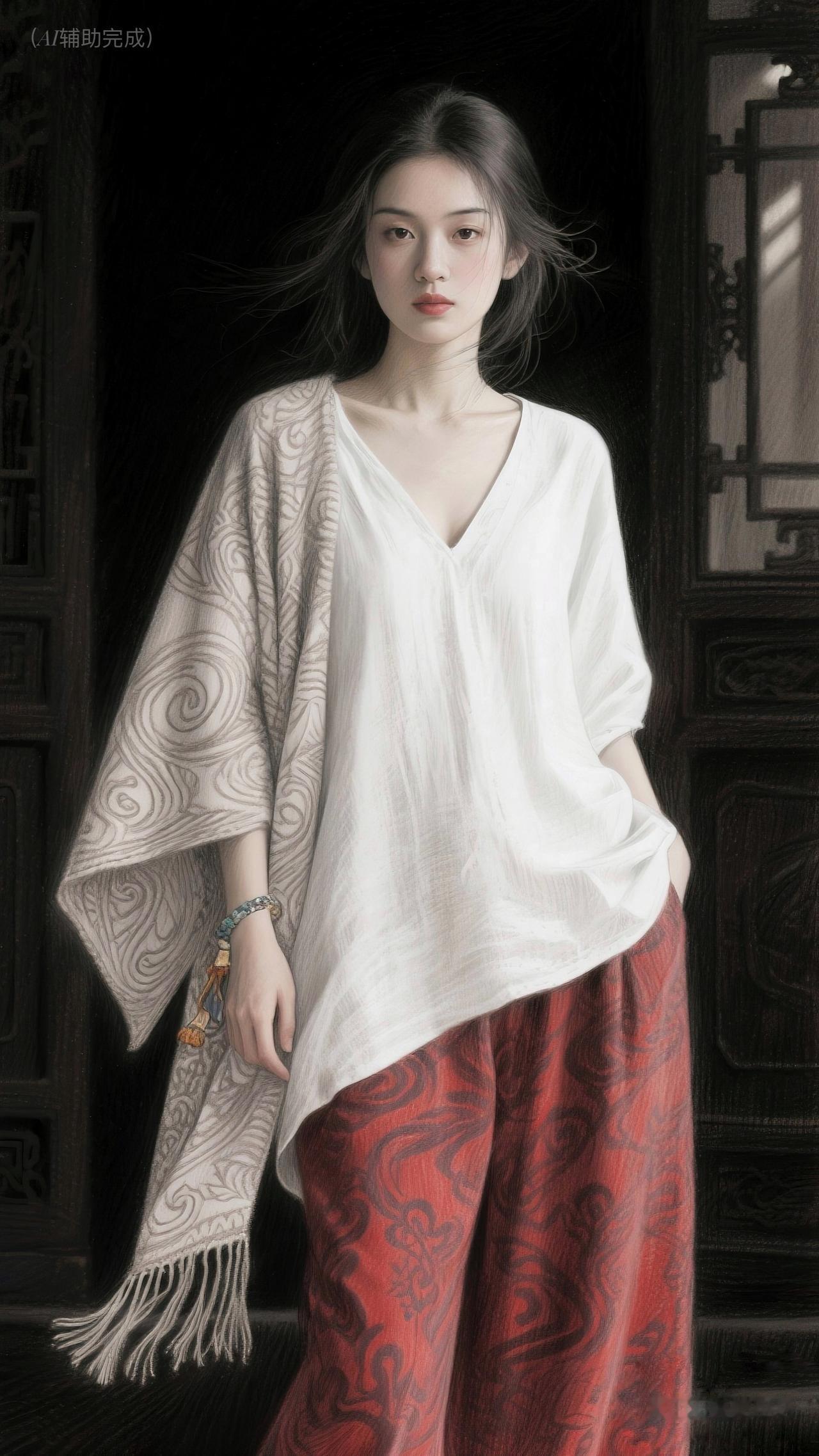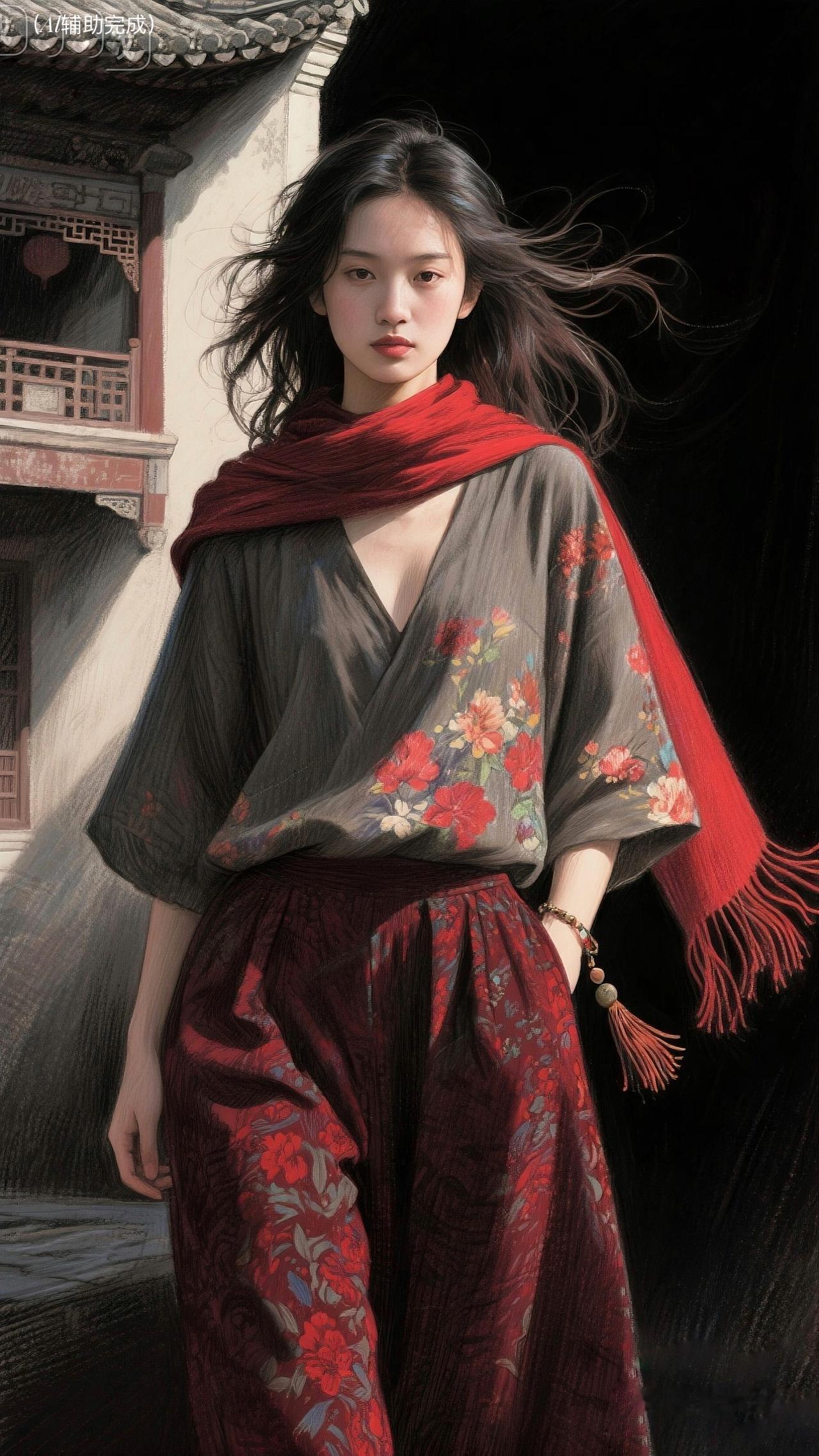风拂发丝立古建,白衫搭红纹阔腿裤,流苏披肩添雅韵。她眉眼沉静,腕间串珠轻晃,红与白的撞色像揉碎的诗。东方温婉在古意里漫开,这帧古典美,一眼沦陷。