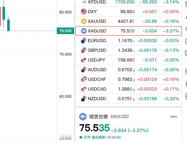 周三现货白银价格冲高回落, 大幅下跌百分之四; 今日延续回落趋势。 刚看了一下,现货白银走势。 现货白银已经跌至75美元附近。 报价75.535美元, 较上一日下跌3.37%。 对于白银后市, 期货小褚观点不变, 认为观望比较好!