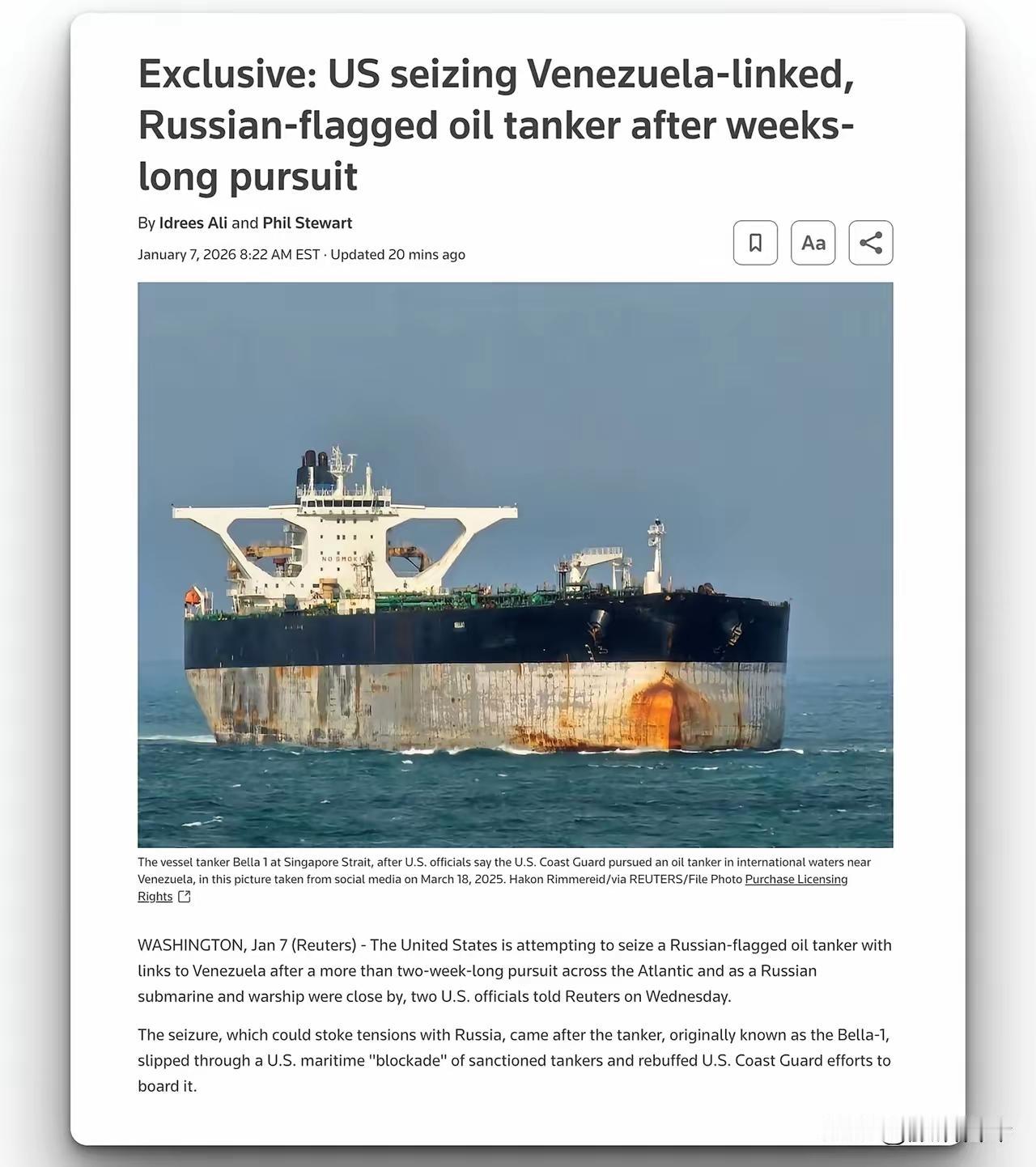 新华社快讯:美国欧洲司令部7日宣布,美方已在北大西洋扣押“贝拉1”号油轮,称该油轮违反美国制裁措施。 先在北大西洋拿下挂俄旗的油轮,这船原是“贝拉1号”,被美军追了18天,情急之下涂俄旗改俄籍求庇护,还惊动俄潜艇护航,结果还是没躲过。紧接着又在国际水域扣了艘无国籍的“索菲亚”号,俩船都跟委内瑞拉有关。 据最新消息,美国特种部队已成功扣押该油轮。"马里纳"号的轮机员躲进船上厕所。其他船员则被按倒在地,脸朝下趴在油桶上。俄罗斯潜艇在附近游弋,摆出吓人的姿态,但却无所作为。 据美方表示,这两艘油轮都是委内瑞拉“影子舰队”,运输受制裁的石油,因悬挂虚假国旗而被认定为无国籍船只。美国政府将继续对所有美方指称的“非法运输石油船只”实施禁运。 国际法已然消亡,无法提供任何保护。当今现实中对违反国际法的控诉,就如同上世纪30年代末控诉纳粹德国违反国际联盟章程。尽管可以佯装其仍具效力,但这仅是自我安慰的幻想。“文明的灯塔”这次彻底扔掉了遮羞布,也是告诉世界,弱肉强食从来都没有远去,所谓的“文明”,只是强者用来稳住弱者放弃练肌肉的手段而已。 资料显示:贝拉1号(Bella 1)船籍: 最初长期悬挂巴拿马国旗,曾登记为巴拿马籍。 2025年12月31日,以“马里内拉号(Marinera)”之名在俄罗斯官方船舶登记册注册,母港索契,转为俄罗斯籍。 ​特朗普指向明确,一是中国,二是俄罗斯,意思是,谁看再牛美国都敢扣,也是为了后面委国“大胆收钱”做基础。也就是明摆着强盗行径,以后委内瑞拉的石油只能经过美国转手售卖了。美国资本这次赚了不少资源,但目前没有到手… ​ 俄罗斯国家杜马国防委员会的副主席阿列克谢·朱拉夫列夫,就因为那艘叫“马里纳号”的船被扣了,直接冲着美国放狠话了。他说啥呢?他说美国必须为这事付出代价,甚至撂下一句:“咱们得用鱼雷干沉几艘美国军舰,好好教训教训他们!” 你看看,这就是核大国的底气。俄罗斯可不是好惹的,真要硬刚起来,手里有家伙(核武器),腰杆子硬得很。不像以前特朗普跟别人谈生意或者搞外交,总喜欢咋咋呼呼,最后往往也就是雷声大雨点小。可这次碰上俄罗斯这“战斗民族”,人家是真敢玩命,上来就要动真格的,这气势一下子就压过特朗普一头了。所以说,特朗普以前为啥总不跟人正面硬碰硬?估计也是怕碰上这种不要命的狠角色,在气场上先输了一截。