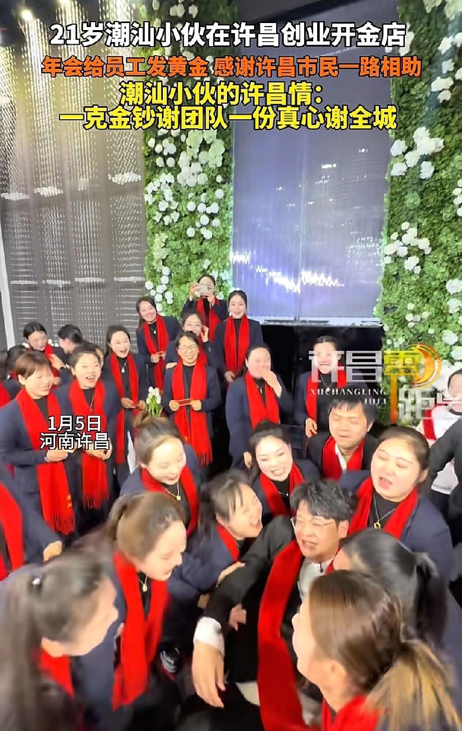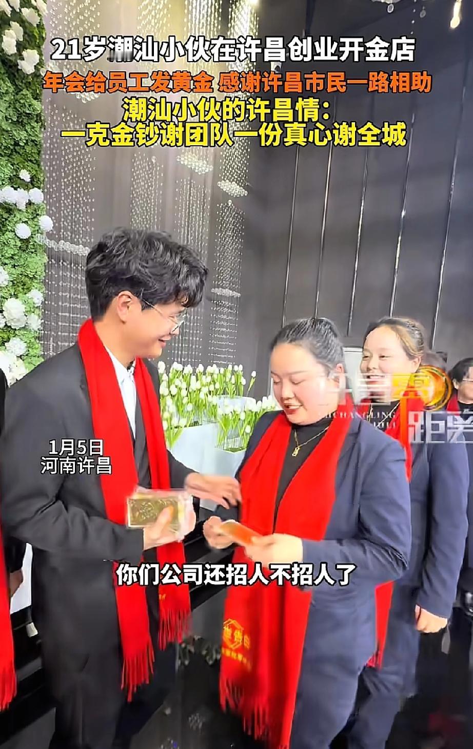 这格局打开了!河南许昌,女子在金店打工时怀孕,但她却不敢告诉老板,怕自己丢掉工作,结事情传到老板耳朵里,这位21岁的年轻老板不仅没生气,反而年底在公司年会上给每位员工都发了一克黄金,并当众承诺:岗位永远都会为大家保留,怀孕、有事都不用怕 这位年轻的老板是潮汕人,在许昌这座城市创业经营金店。在近日举办的公司年会上,他精心准备了一份厚重的心意。 实在的礼物:他亲手给每位员工递上1克黄金(现在1克黄金都值小两千呢),还拿出大几十万现金当奖金。 更绝的是,他当着所有人的面说:“宝妈们付出太多了,怀孕、有事都不用怕,岗位永远给你们留着!” 他还说:“钱是赚不完的,多分一点给员工没啥亏的。” 在活动现场,这位老板还特别感谢了许昌这座城市和许昌人民,感恩这片土地给予他创业和发展的机会。他认为自己取得的成绩,离不开员工的付出和当地顾客的支持。 这位21岁老板的言行,展现出的是一种远超年龄的责任感与格局。 现在好多老板只想着自己赚钱,员工怀孕就想方设法让人走,这个老板真是清流。正如这位宝妈留言:“看得眼眶发热,如果能遇到这样的老板,再苦再累也愿意跟着干。” 确实,现在很多工作,员工和老板之间总像隔着一层墙,互相防着。老板怕员工干不长,员工怕随时被辞退,尤其是怀孕的女员工,经常提心吊胆。 但这位21岁的年轻老板,却主动拆掉了这堵墙。他让员工感受到:你的付出,我看得见;你的难处,我放在心上。 这件事看起来是老板大方,其实背后藏着他的智慧。员工心里踏实了,才会更用心工作;团队稳定了,生意才能做得长久。这位潮汕小伙虽然年轻,却懂得“一起赚,才能长久赚”的道理。他不是简单发钱,而是发自真心地把员工当自己人。 这样的老板,员工怎么会不珍惜?这样的店,怎么会没有未来?说到底,人和人之间,将心比心,就是最好的管理。为这样的老板点赞,也希望这样的好老板,能越来越多!