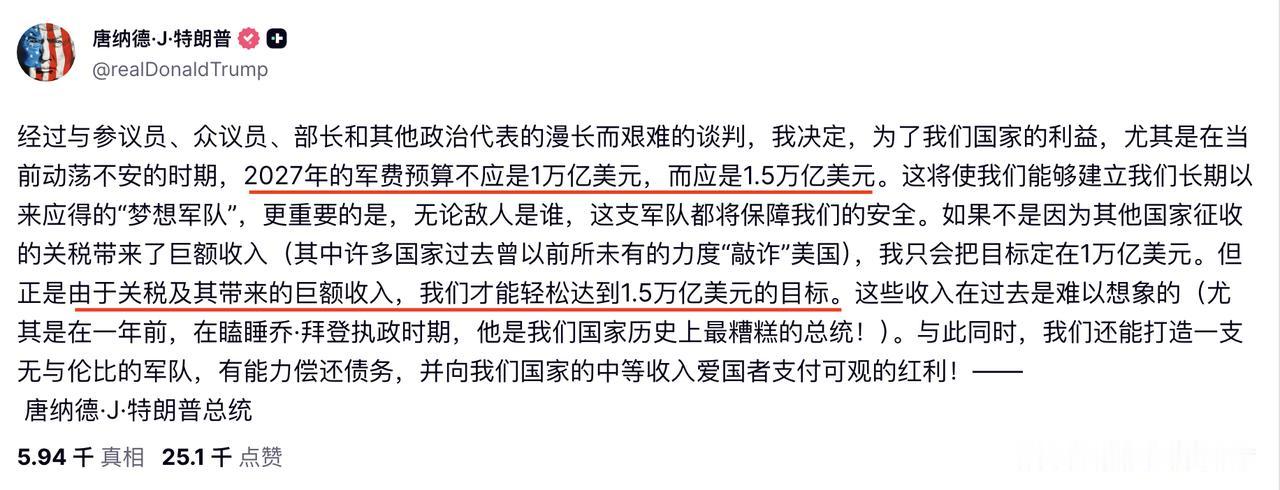 特朗普将把2027年军费支出再增加50%,从1万亿美元增加到1.5万亿美元。对美