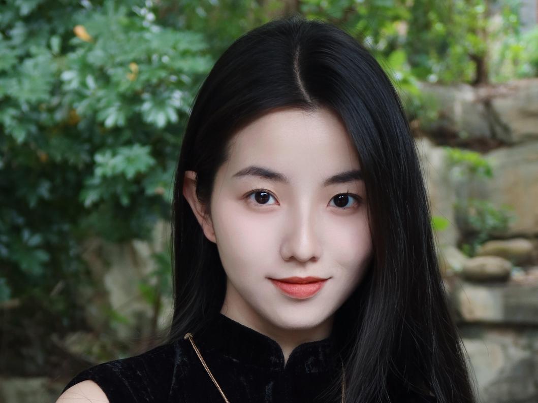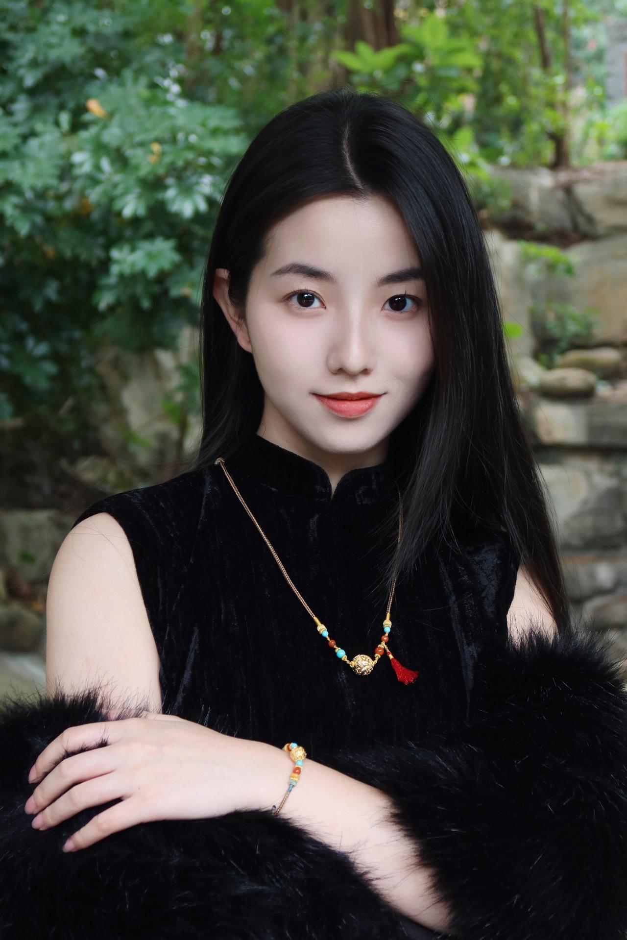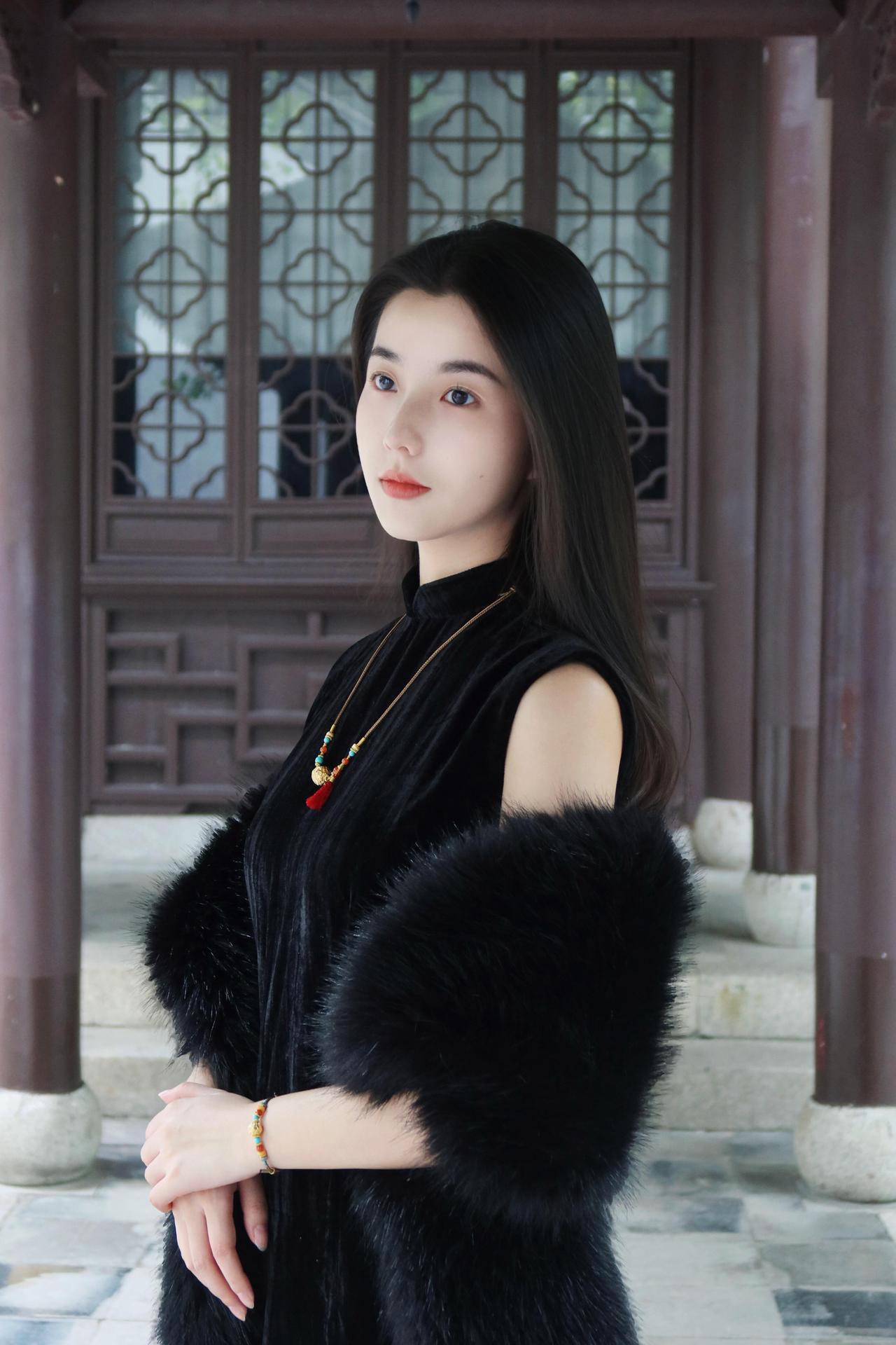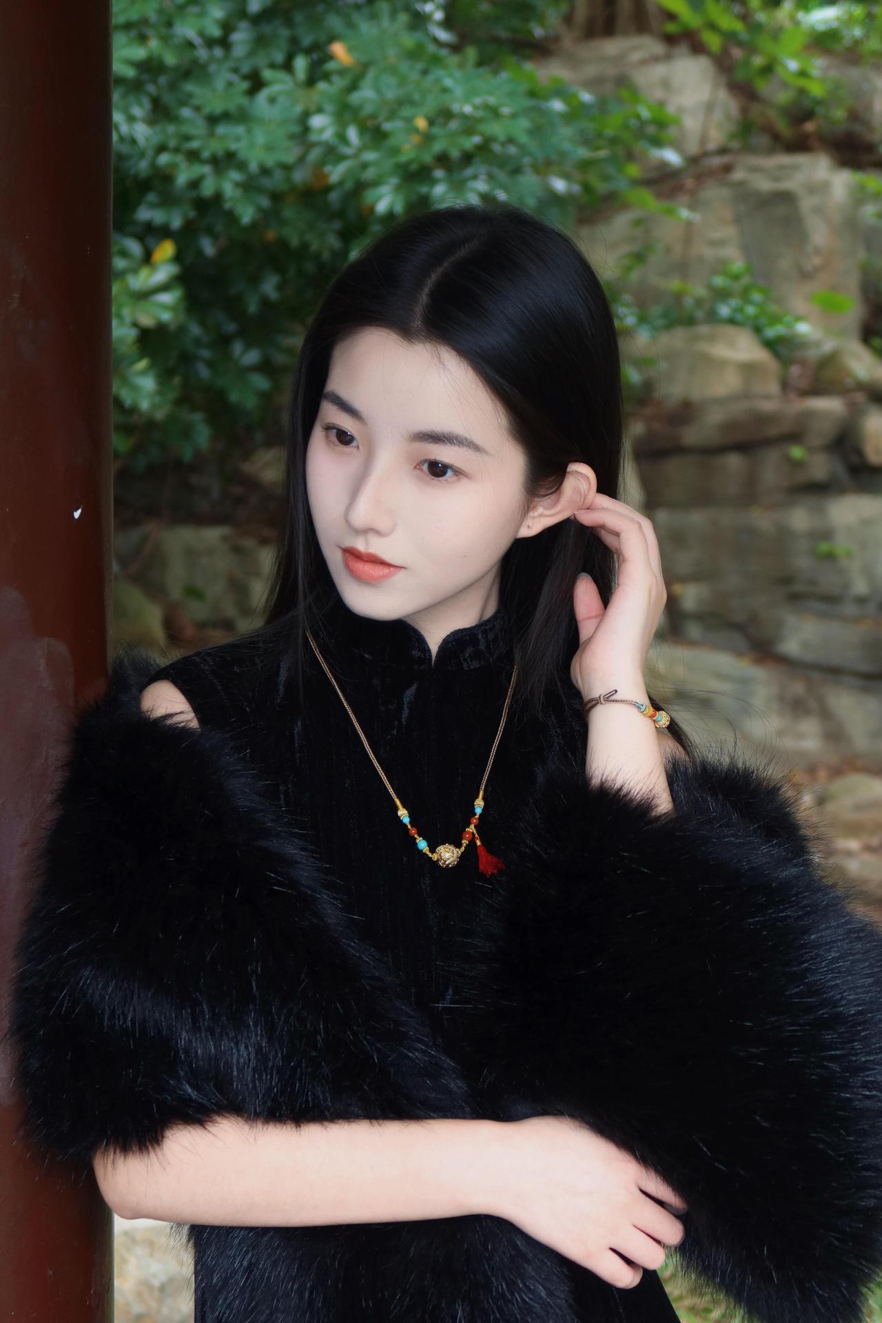莺啼序·园林凝眸 园林晓光凝翠影,石桥横卧溪畔。黑绒裁、裹作旗袍,毛裘轻拢香肩。指微抬、轻托腮际,眸光澹澹凝清浅。看溪波、微动鳞纹,远山如黛。 转步依岩,青枝拂鬓,彩珠缠腕畔。金链细、垂落红穗,坠子轻摇如颤。抚青丝、鬓边微整,石纹粗、衬得容颜软。听风过、叶响枝头,鸟声清婉。 又立亭前,雕窗映格,木栏围曲院。手交叠、轻垂腰侧,眉峰微展,笑靥初融,似含春暖。阶前苔绿,亭边花静,一颦一笑皆如画,任流年、偷换朱颜面。 闲来寻幽,缓步园林,心随景缓。饰品明妆,黑衣素影,与秋光相伴。算世间、万般纷扰,到此都消,只惜今朝,眼前清欢。浮生难得,这般闲逸,倚栏凝睇流云去,记此辰、风软花如霰。园林留得温柔,岁岁相逢,此情未变。