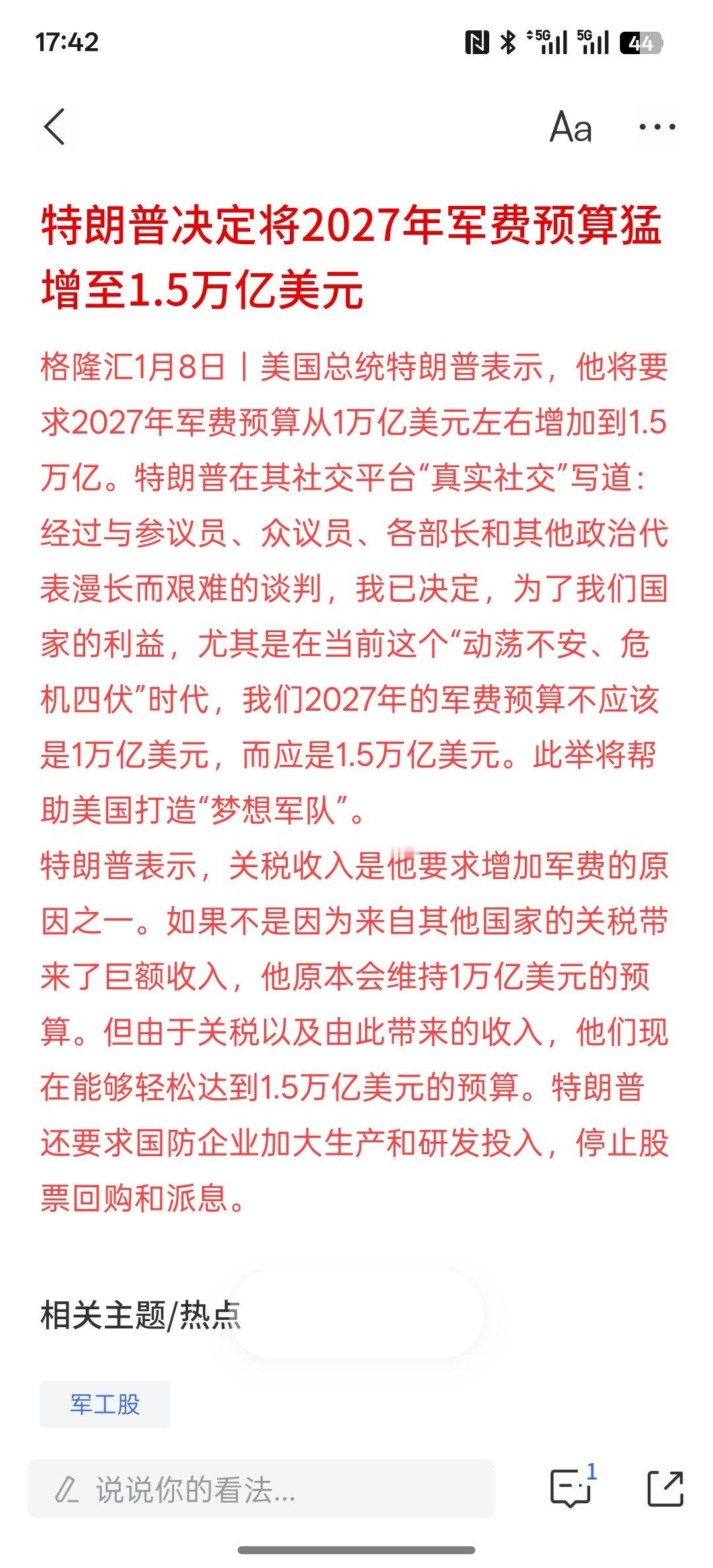 特朗普决定将2027年军费预算猛增至1.5万亿美元,美国是要准备备战的吗?大规模的增加军费,是要帮美国打造梦想军队,特朗普说,他的军费源自于关税的收入,而且大额增加军费。未来,特朗普要求在回购股票派息方面会停止!可能不要发展国防力量,估计未来想用军队这种国防力量又准备去抢别的资源!美国准备当强盗!干这些不劳而获的勾当,使用武力掠夺他国财富!