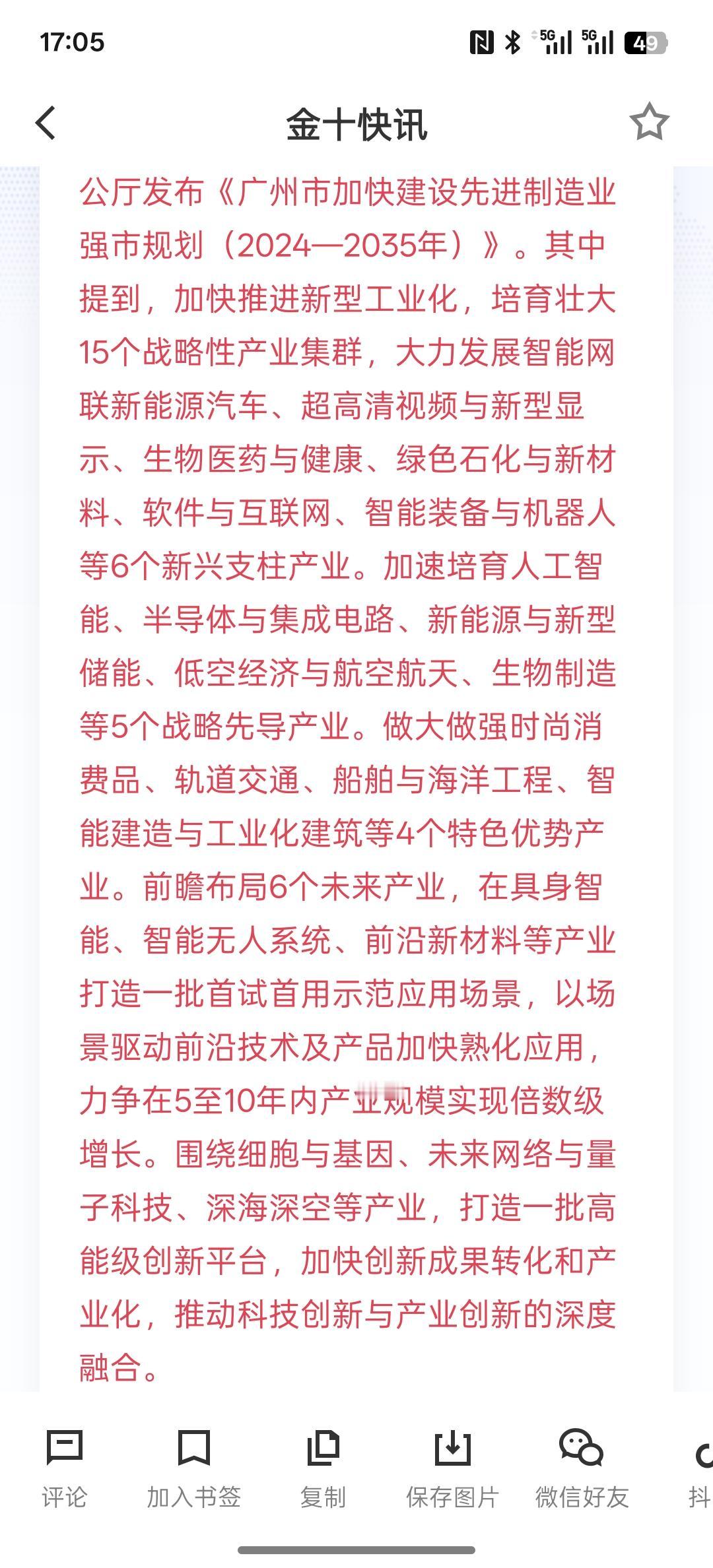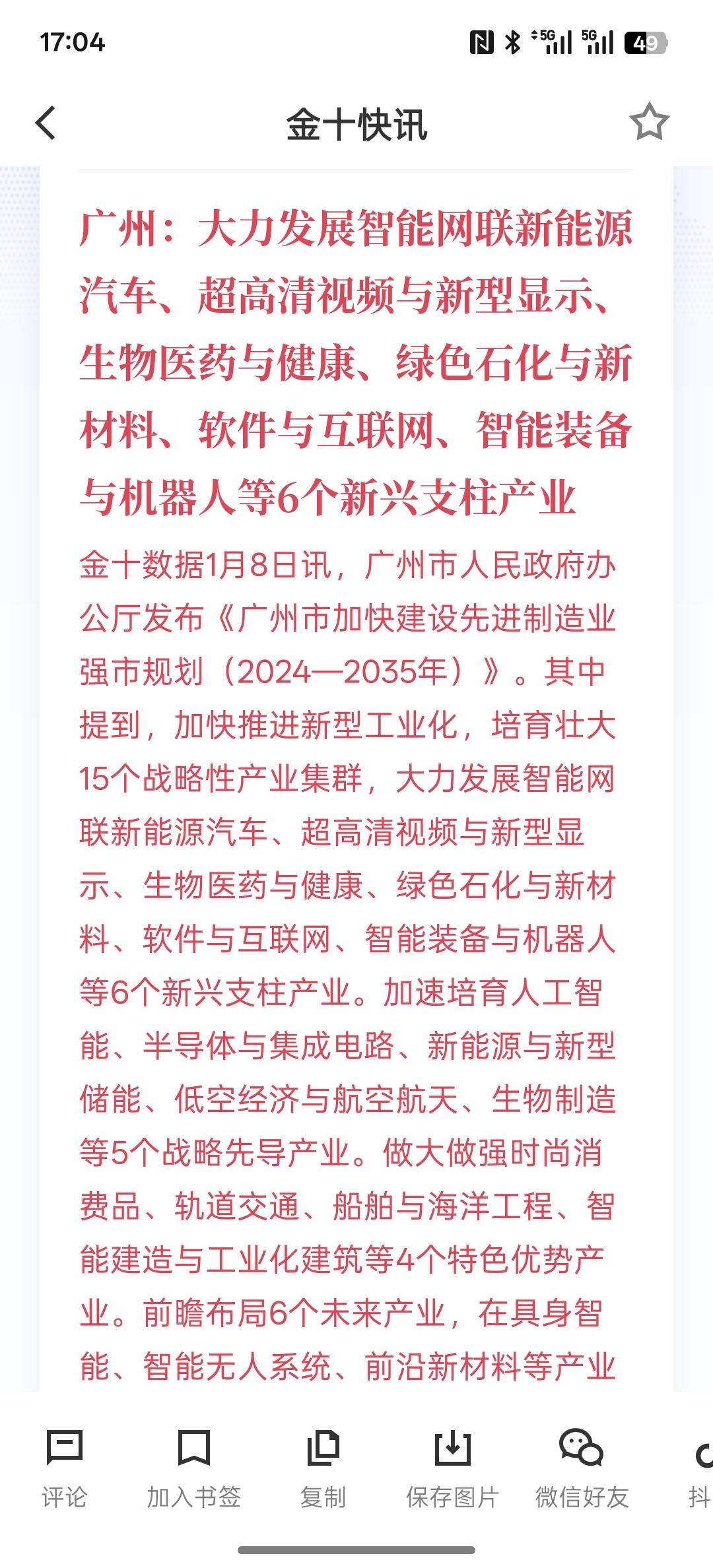 广州:大力发展智能网联新能源汽车、超高清视频与新型显示、生物医药与健康、绿色石化与新材料、软件与互联网、智能装备与机器人等6个新兴支柱产业!看来广东省包括广州也在大力发展这些产业,智能网联新能源汽车,自动驾驶技术是未来的发展大趋势!现在跑在全国最前面的两个省市,一个是北京,一个是重庆!现在广东省也要加快速度布局往年新能源汽车!现在智能装备与机器人都将是未来工业的主要发展方向,也是未来发展的主流,可以提高更高效的生产与制造!各大省市也开始逐步布局这些高端产业链的发展,实现高质量发展战略目标