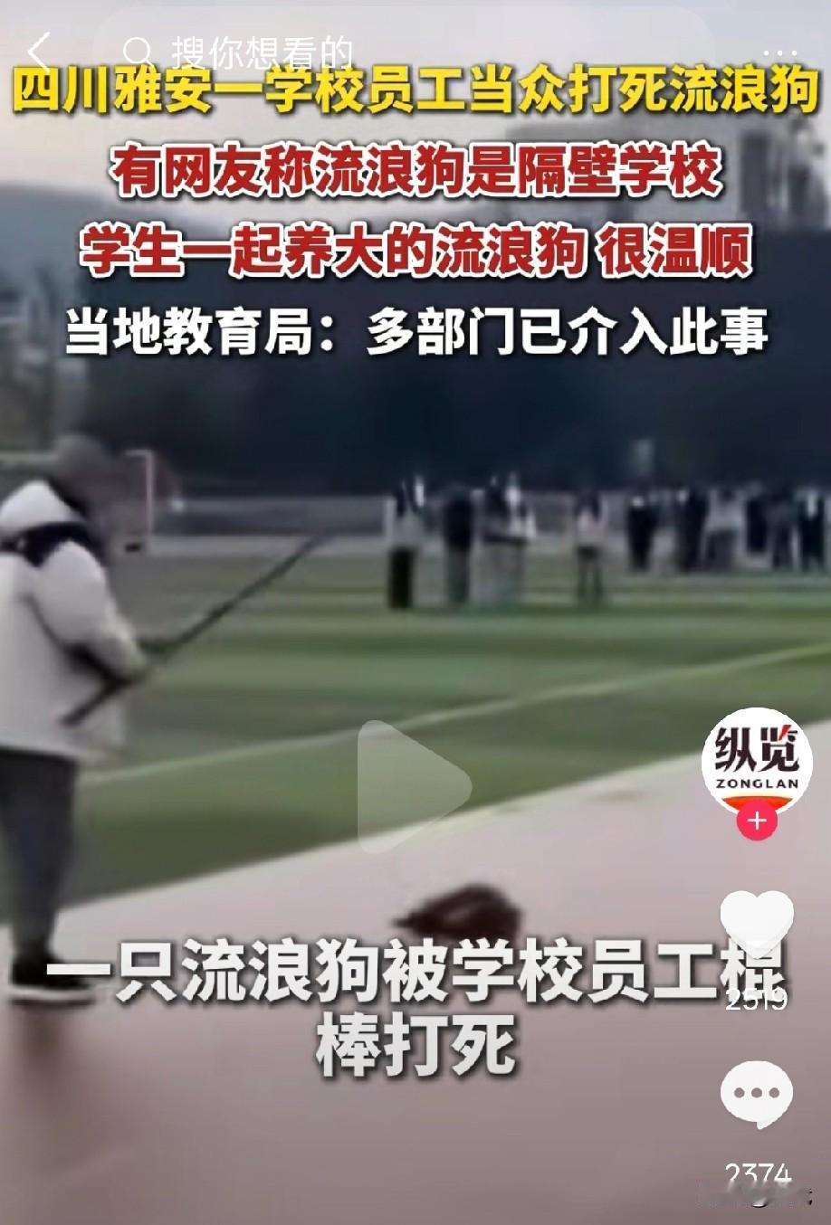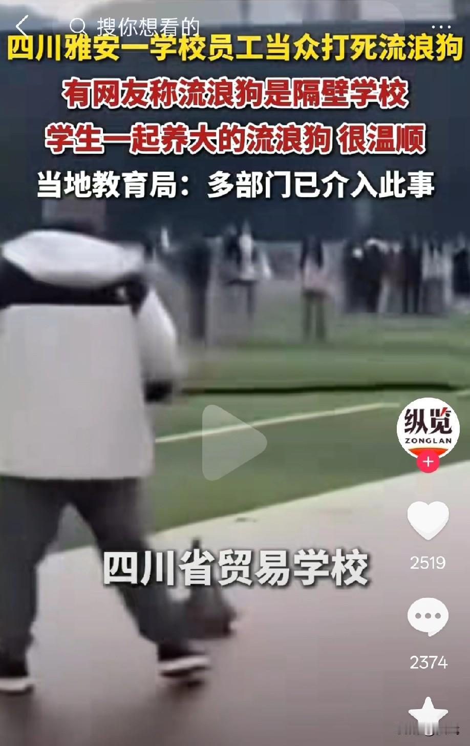 近日,四川雅安一学校课间操时,流浪狗闯进校园。保安多次驱赶无效,用棍子打死狗。学