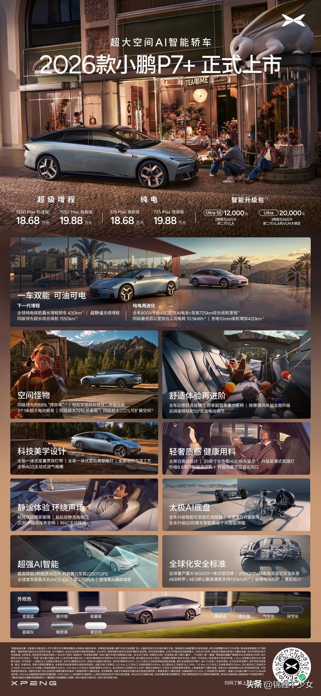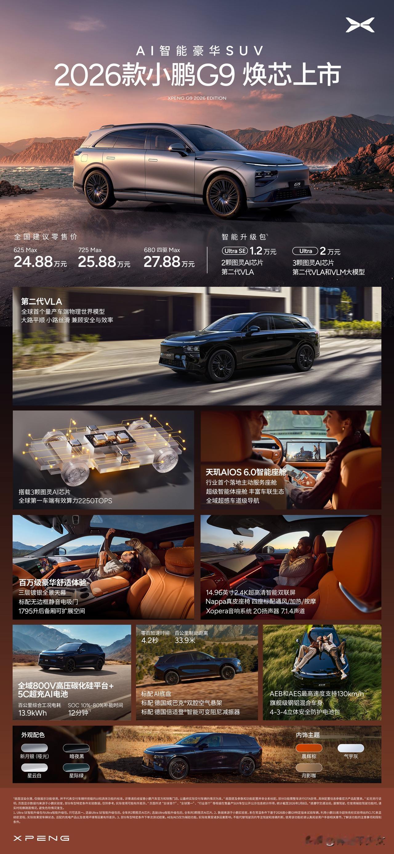 新款小鹏P7+的空间依旧没让人失望,不但拥有超高得房率,整体乘坐也很舒适,简直就是出行理想型! 焕芯升级的2026款小鹏G6售价17.68万元起!全系标配图灵AI芯片,低成本享受行业领先智能体验。2026款小鹏G9售价24.88万元起!满足不同用户的智能需求。