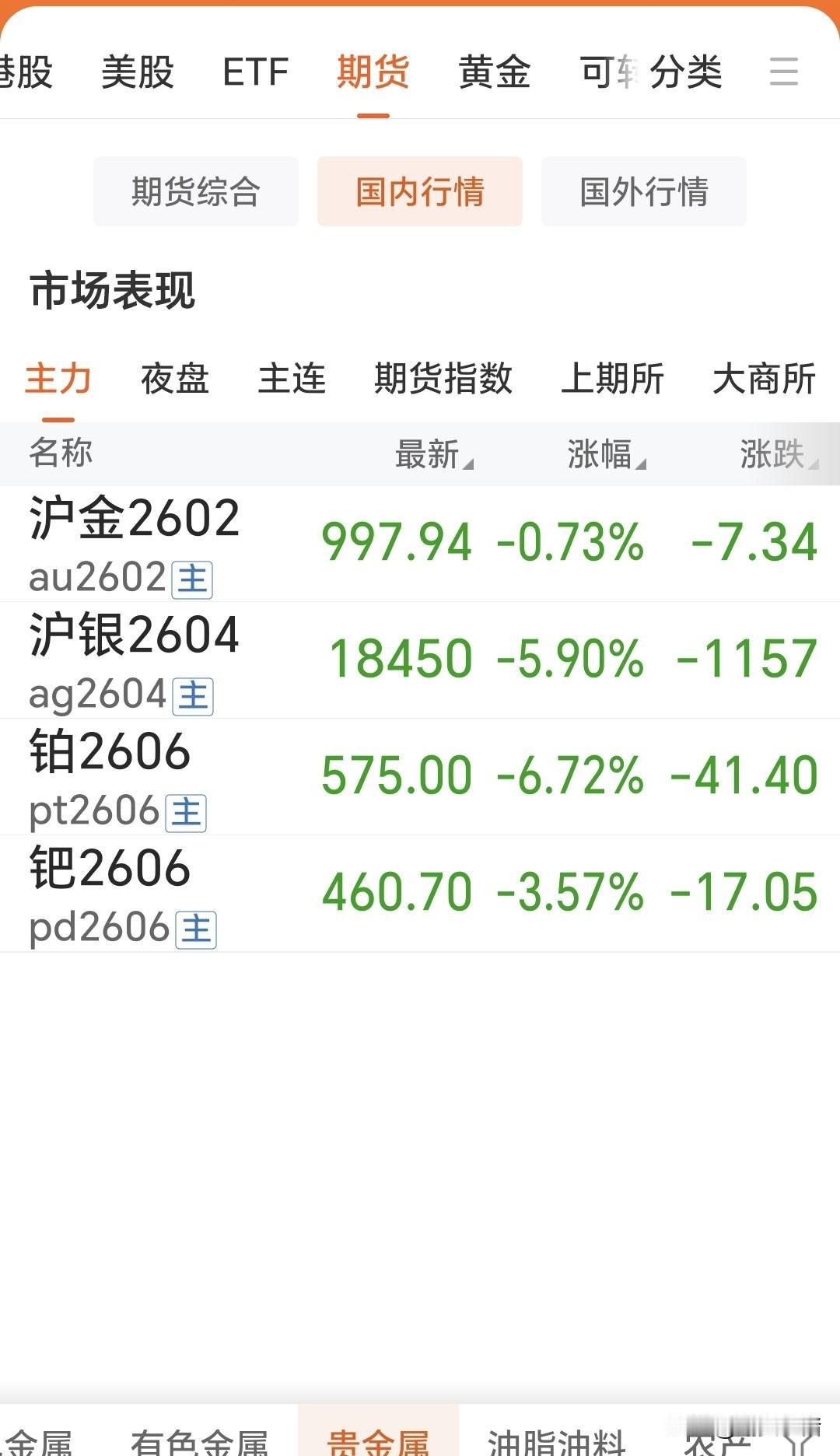 今天是周四, 国内贵金属品种齐刷刷回落。 从下图,可以明显看出: 黄金、白银、铂金和钯金 这四个品种,都在下跌。 白银和铂金下跌比较多, 下跌6%左右。 对于后市, 期货小褚认为观望为主比较好!