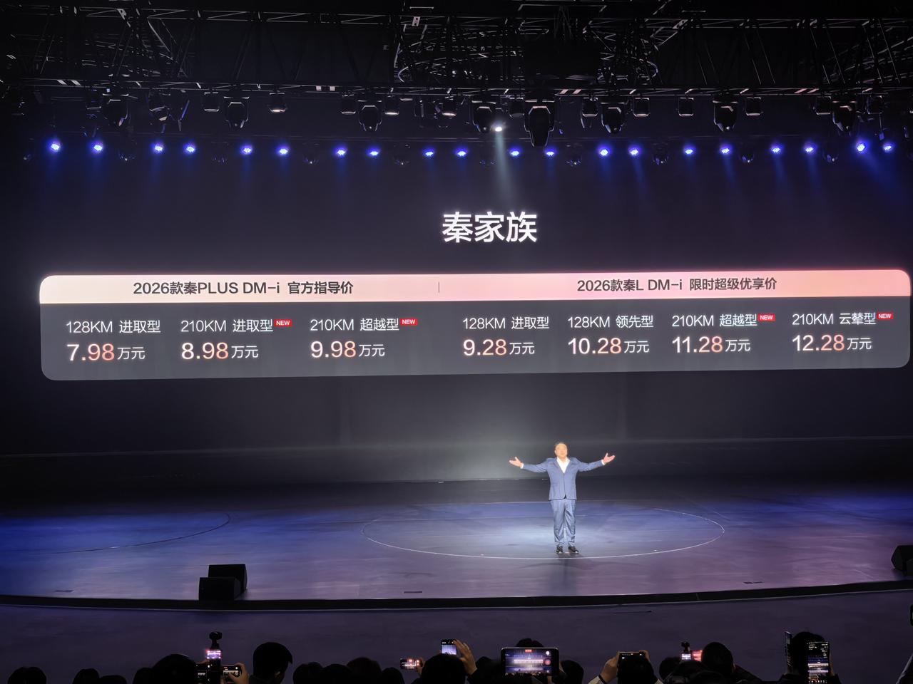 2026款长续航秦L DM-i和秦Plus DM-i发布! 价格: 秦Plus DM-i 7.98万起,其中210km长续航版8.98万起。 秦L DM-i 9.28万起,其中210km长续航版11.28万起。 依然性价比很高,这次主要的升级在于续航。 从之前的128km升级到210km,几乎翻了个倍,这个纯电续航,目前在同级别插混车,是独一份! 210km纯电续航,基本可以做到一周5天上班纯电通勤(通勤40km每天),用车成本极低!自己有家充桩的话,基本上可以做到低于1毛钱一公里,共享充电桩也不会超过2毛一公里。 馈电油耗也只有2.79L/100km,总之就是省钱。满油满电总续航2110km,什么概念?广州-北京,一箱油搞定! 感觉插混新时代来了,比亚迪开年打了个样!以后发布的插混新车,没有200km都拿不上牌桌了。 当然不止升级续航,颜色也新增了7款,个人比较喜欢墨竹青,年轻时尚色。星河米,冰珀青也都不错,选新色3000块,但目前免费。 座椅也有升级,通风加热都有了,刚坐上去感受了一下,不是小凳子,背部也比较舒服,后排空间也不错! 还有云辇-C+预瞄,行驶更平稳舒适。天神之眼C也有,开高速没那么累了,泊车也更方便。 智能座舱能无麦K歌,连接手柄玩游戏。 还有黑科技TBC高速爆胎稳行系统,140km/h爆胎测试,也稳如老狗!这个价位的车有如此安全保障,确实良心! 对了,内饰有点小变化,改成怀档了!更高级了! 秦一直是比亚迪的销量杠把子,26款这波更新稳了,继续销量扛把子!
